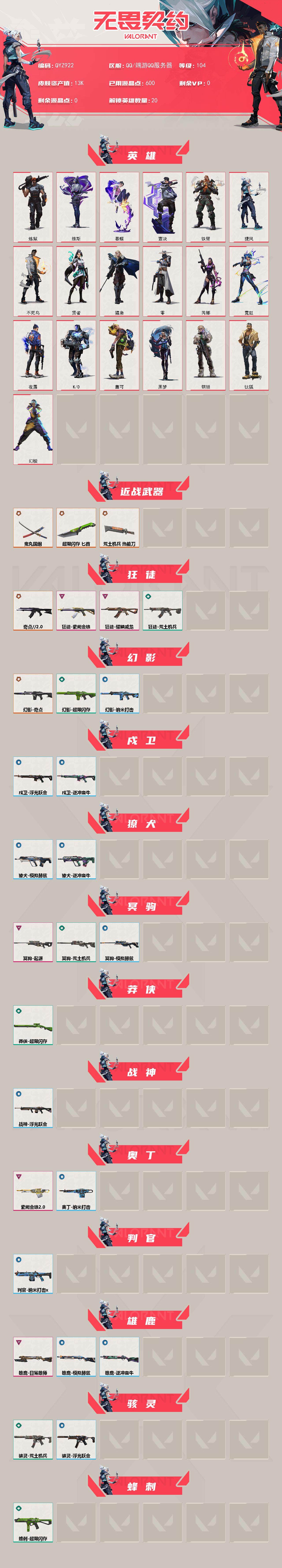 【qyz922】终极5/卓越5/皮肤38/等级104/段位:白银/幻棱/炼狱/维斯/暮蝶/钛狐/壹决/铁臂/捷风/不死鸟/贤者/猎枭/零/芮娜/霓虹/夜露/k/o/盖可/黑梦/钢锁/近战武器-鬼丸国纲/近战武器-超限闪存 匕首/近战武器-荒土机兵 热能刀/狂徒-奇点//2.0/狂徒-耀鳞威龙/狂徒-紫阙金琅/狂徒-荒土机兵/幻影-奇点/幻影-超限闪存/幻影-纳米打击/戍卫-浮光跃金/戍卫-逆冲蛮牛/獠犬-模拟赫兹/獠犬-逆冲蛮牛/冥驹-起源/冥驹-荒土机兵/冥驹-模拟赫兹/莽侠-超限闪存/战神-浮光跃金/奥丁-紫阙金琅//2.0/奥丁-纳米打击/判官-纳米打击x/雄鹿-日冕雄师/雄鹿-模拟赫兹/雄鹿-逆冲蛮牛/骇灵-荒土机兵/骇灵-浮光跃金/蜂刺-超限闪存/标配-荒土机兵/标配-浮光跃金/标配-最终庇护/正义-超限闪存/正义-纳米打击/鬼魅-诡秘蛇影/鬼魅-模拟赫兹/鬼魅-扑棱扑棱/鬼魅-星云暗涌/狂怒-逆冲蛮牛/终章:激斗汉堡 卡面/进入射程 卡面/分崩离析 卡面/纳米打击 卡面/抑制技术 卡面/激斗汉堡 卡面/瓦娃脸雪糕 p2 卡面/从黄昏到黎明 卡面/荒土机兵 卡面/银弹猎手 卡面/逆冲蛮牛 卡面/《双城之战》拥抱 卡面/精灵大战 卡面/欢迎来到底城 卡面/南瓜盛典 卡面/唱片的故事 卡面/钢弓与箭弦 卡面/无畏契约:暮蝶 卡面/排除故障 卡面/战术桌游 卡面/悠享食光 卡面/修车达人 卡面/模拟赫兹 卡面/浮光跃金 卡面/超限闪存 卡面/维斯工牌 卡面/正义的化身 卡面/无畏契约go!第一卷:芮娜 卡面/无畏契约go!第一卷:零 卡面/《双城之战》金克丝 卡面/暗呛 卡面/代号红色 卡面/新兵报到 卡面/v契约 卡面/无畏契约 卡面/小小心意 喷漆/战“素”兔 喷漆/宇宙的指引 喷漆/请求重启 喷漆/逆冲蛮牛 喷漆/纳米打击 喷漆/鼻尖上的蝴蝶 喷漆/简笔画黯兽 喷漆/独守蝰腹 喷漆/他们将落荒而逃 喷漆/通缉:战术企鹅 喷漆/荒土机兵 喷漆/别挡我吃球! 喷漆/嗨宝南瓜灯 喷漆/嘭! 喷漆/都算到了 喷漆/控场勿近 喷漆/皮蛋呼呼 喷漆/像素星礈 喷漆/图谋不轨的零 喷漆/伤心心 喷漆/小丑猫 喷漆/模拟赫兹 喷漆/高丽风情小熊 喷漆/蹲到一个 喷漆/全力集中 喷漆/超限闪存 喷漆/rua一下 喷漆/熊抱 喷漆/高丽风情小虎 喷漆/记在小本本 喷漆/防弹企鹅 喷漆/高丽风情小蛙 喷漆/捷风差距 喷漆/买装还是存钱 喷漆/静电火花 喷漆 /胜利属于无畏契约 喷漆/glhf 喷漆/无畏契约 喷漆/终章:猫猫木乃伊 挂饰/荒土机兵 挂饰/悠闲鸡块 挂饰/猫猫木乃伊 挂饰/水壶 挂饰/纳米打击 挂饰/逆冲蛮牛 挂饰/可爱糖糖 挂饰/伞绳 挂饰/《双城之战》小蛋糕 挂饰/第九季//第三幕 纪念币 挂饰/拳击战术熊 挂饰/工具腰带 挂饰/暗藏猫腻 挂饰/高丽风情 挂饰/熔岩灯 挂饰/超限闪存 挂饰/迷你k/o 挂饰/模拟赫兹 挂饰/第九季//第二幕 纪念币 挂饰/z世代特饮 挂饰/天外飞客 挂饰/无畏契约 纪念币 挂饰