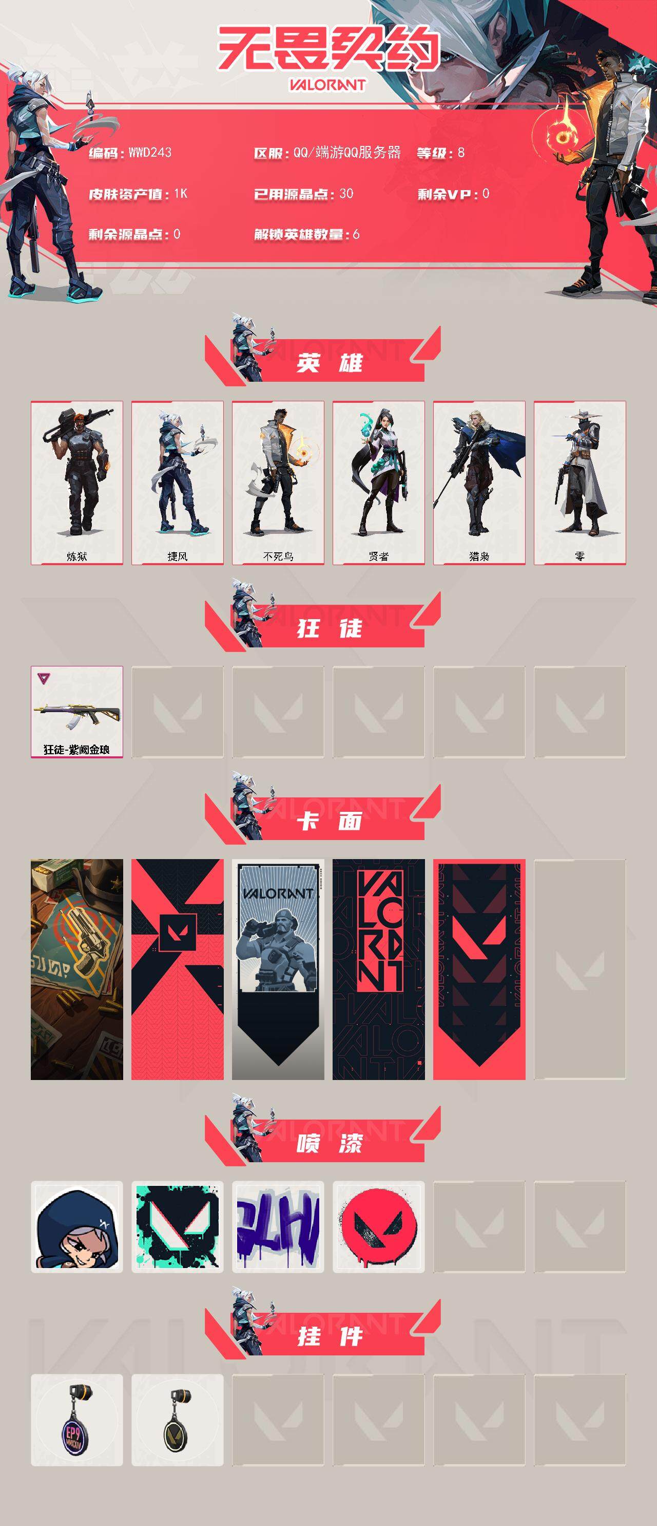 【wwd243】卓越1/皮肤1/等级8/段位:未定级/炼狱/捷风/不死鸟/贤者/猎枭/零/狂徒-紫阙金琅/正义的化身 卡面/代号红色 卡面/新兵报到 卡面/v契约 卡面/无畏契约 卡面/捷风差距 喷漆/胜利属于无畏契约 喷漆/glhf 喷漆/无畏契约 喷漆/第九季//第二幕 纪念币 挂饰/无畏契约 纪念币 挂饰