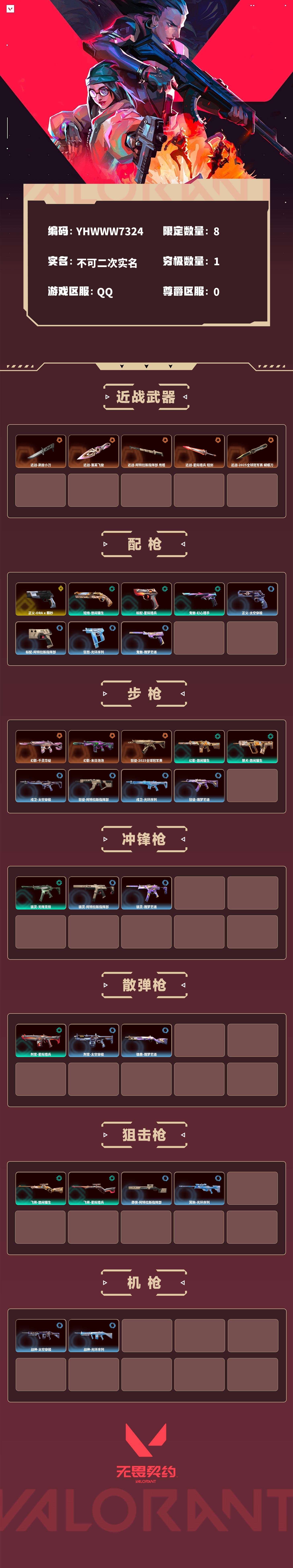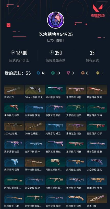 【无畏契约】【yhwww7324】等级:70,已用无畏点16400,已用源晶点350,橙皮:幻影-千灵华绽|近战-剥皮小刀|近战-落英飞旋|近战-阿特拉斯指挥部 甩棍|近战-星际猎兵 短剑|幻影-末日泡泡|狂徒-2025全球冠军赛|近战-2025全球冠军赛 蝴蝶刀__段位:白银__绿皮:骇灵-无限竞技|短炮-悠闲猫生|飞将-悠闲猫生|幻影-悠闲猫生|獠犬-悠闲猫生|判官-星际猎兵|飞将-星际猎兵|标配-星际猎兵|鬼魅-幻心猎手__蓝皮:正义-太空穿梭|战神-太空穿梭|判官-太空穿梭|戍卫-太空穿梭|骇灵-阿特拉斯指挥部|莽侠-阿特拉斯指挥部|标配-阿特拉斯指挥部|狂徒-阿特拉斯指挥部|狂怒-光环序列|戍卫-光环序列|冥驹-光环序列|战神-光环序列|狂徒-瑰梦艺语|鬼魅-瑰梦艺语|骇灵-瑰梦艺语|雄鹿-瑰梦艺语__英雄:尚勃勒|维斯|黑梦|斯凯|暮蝶|盖可|霓虹|壹决|星礈|k/o|幽影|夜露|钢锁|奇乐|炼狱|铁臂|贤者|猎枭|芮娜|零|捷风|蝰蛇|不死鸟|幻棱|雷兹|禁灭__金皮:正义-a x 颗秒