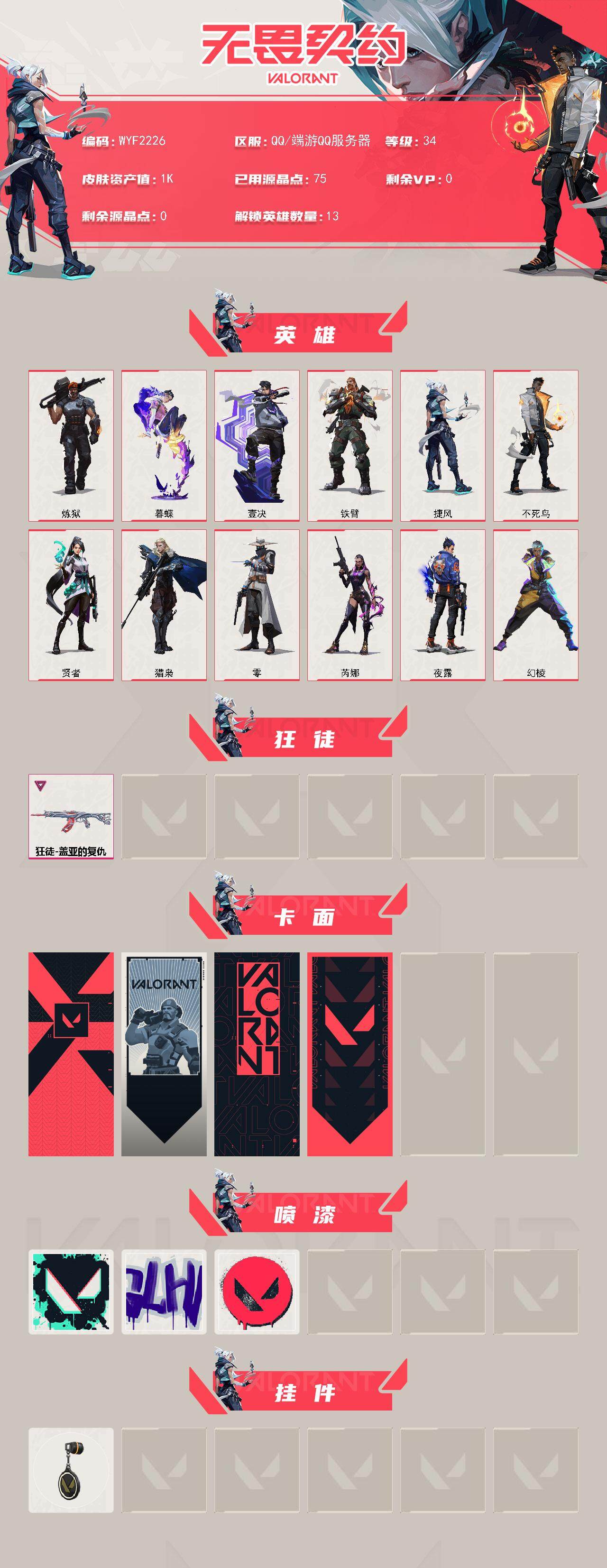 【wyf2226】卓越1/皮肤2/等级34/段位:青铜/幻棱/炼狱/暮蝶/壹决/铁臂/捷风/不死鸟/贤者/猎枭/零/芮娜/夜露/狂徒-盖亚的复仇/代号红色 卡面/新兵报到 卡面/v契约 卡面/无畏契约 卡面/胜利属于无畏契约 喷漆/glhf 喷漆/无畏契约 喷漆/无畏契约 纪念币 挂饰