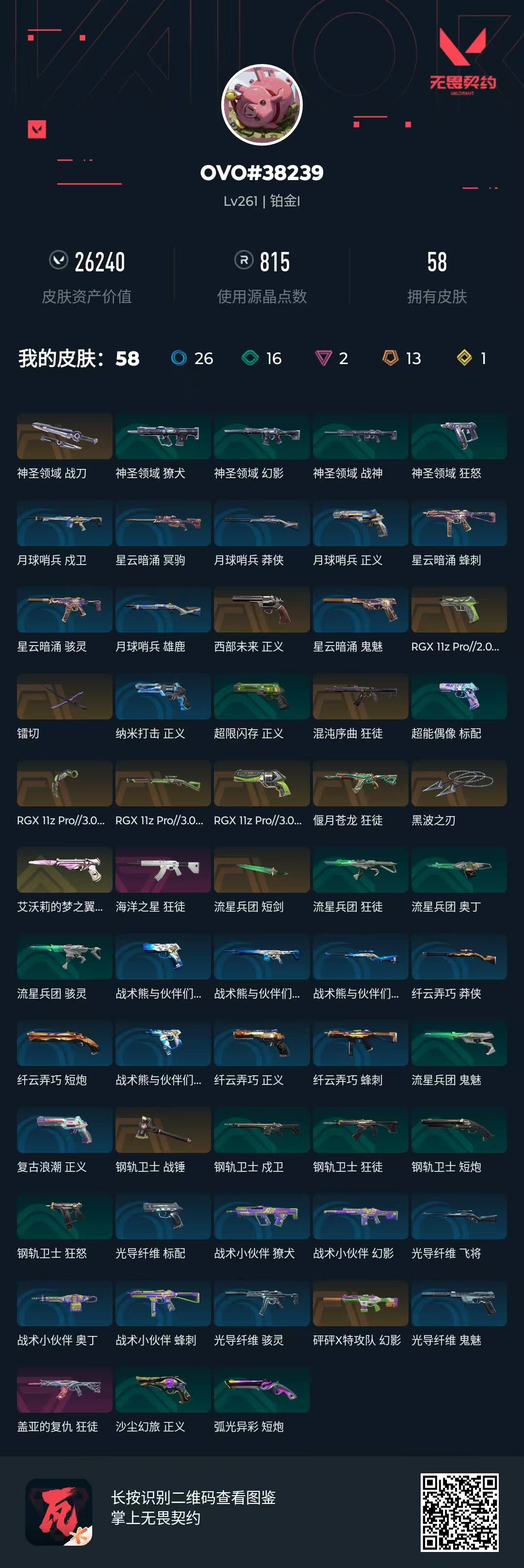 [14766040]s192574无畏契约/261等级/铂金段位/28英雄/58皮肤/资产26240/已使用r点815/剩余r点315/rgx-11z-pro//3.0-莽侠rgx-11z-pro//3.0-正义rgx-11z-pro//3.0-爪刀,神圣领域-战刀,流星兵团-短剑,钢轨卫士-战锤,镭切,黑波之刃,混沌序曲-狂徒,砰砰x特攻队-幻影,偃月苍龙-狂徒,盖亚的复仇-狂徒,海洋之星-狂徒,rgx-11z-pro//2.0-标配,西部未来-正义,艾沃莉的梦之翼-鬼魅