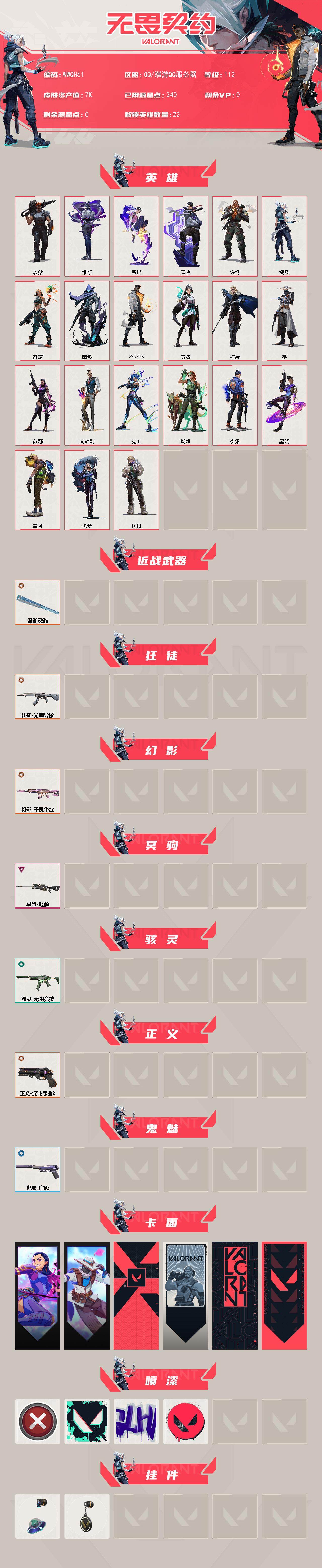 【wwqh61】终极4/卓越1/皮肤10/等级112/段位:青铜/炼狱/维斯/暮蝶/壹决/铁臂/捷风/雷兹/幽影/不死鸟/贤者/猎枭/零/芮娜/尚勃勒/霓虹/斯凯/夜露/星礈/盖可/黑梦/钢锁/近战武器-澄湖潋滟/狂徒-光荣异象/幻影-千灵华绽/冥驹-起源/骇灵-无限竞技/正义-混沌序曲//2.0/鬼魅-宿怨/无畏契约go!第一卷:芮娜 卡面/无畏契约go!第一卷:零 卡面/代号红色 卡面/新兵报到 卡面/v契约 卡面/无畏契约 卡面/买装还是存钱 喷漆/胜利属于无畏契约 喷漆/glhf 喷漆/无畏契约 喷漆/天外飞客 挂饰/无畏契约 纪念币 挂饰