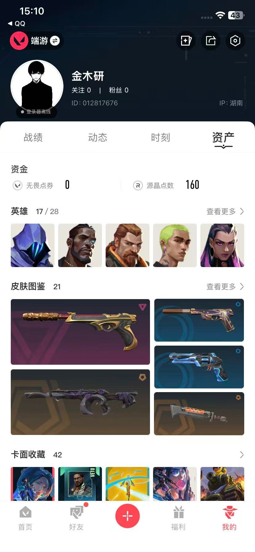 5橙皮 3紫皮 21皮肤 17英雄 42卡面 290已用源晶 铂金段位 【近战武器皮肤】:鬼丸国纲荒土机兵热能刀威龙之刃 【佩呛皮肤】:鬼魅-盖世英雄 【步呛皮肤】:幻影-黯夜怪谈狂徒-双城之战狂徒-紫阙金琅戍卫-天界神兵 【挂饰】:薰衣草之心挂饰双城之战魄罗挂饰神中神挂饰双城之战