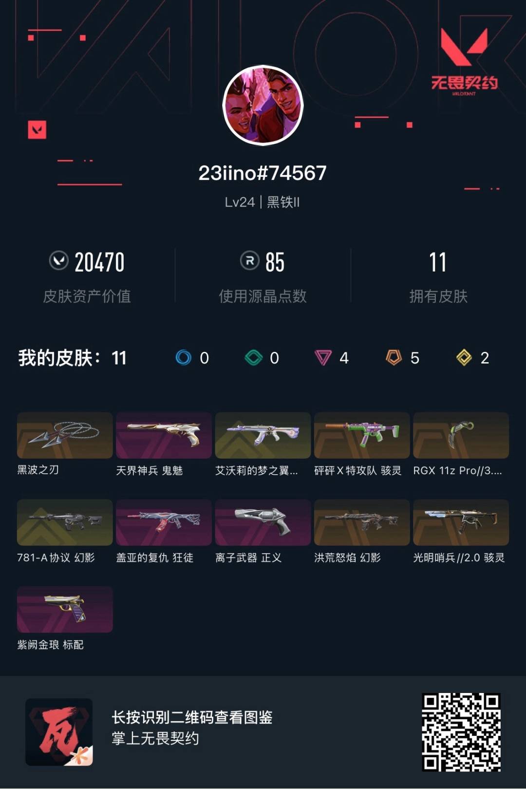 5橙皮 2金皮 4紫皮 11皮肤 9英雄 8卡面 85已用源晶 黑铁段位 【近战武器皮肤】爪刀-rgx 11z pro 3.0黑波之刃 【佩呛皮肤】标配-紫阙金琅正义-离子武器鬼魅-天界神兵 【冲锋呛皮肤】骇灵-砰砰x特攻队骇灵-光明哨兵2.0 【步呛皮肤】狂徒-盖亚的复仇幻影-7