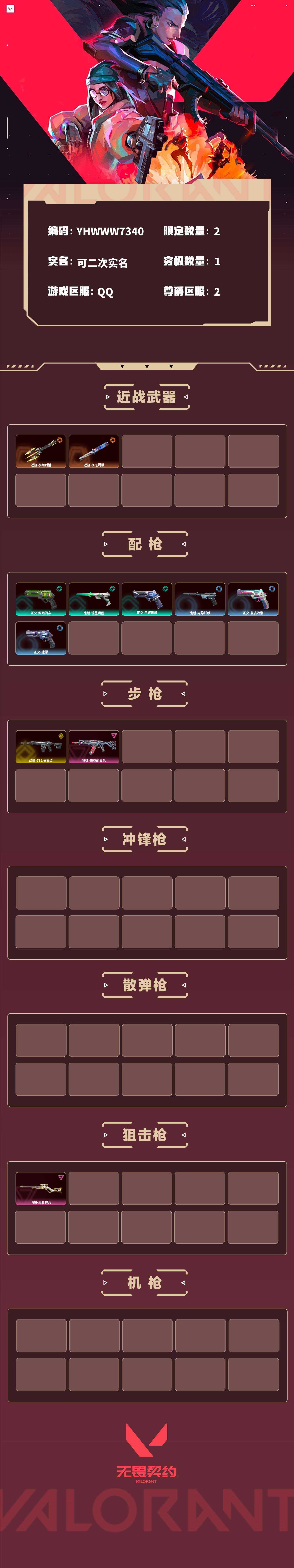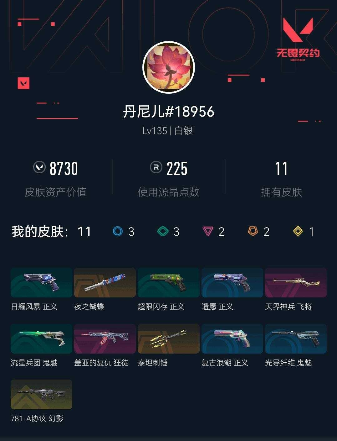 【无畏契约】【yhwww7340】等级:135,已用无畏点8730,已用源晶点225,金皮:幻影-781-a协议__橙皮:近战-泰坦刺锤|近战-夜之蝴蝶__紫皮:飞将-天界神兵|狂徒-盖亚的复仇__蓝皮:鬼魅-光导纤维|正义-复古浪潮|正义-遗愿__段位:白银__绿皮:正义-超限闪存|鬼魅-流星兵团|正义-日耀风暴__英雄:尚勃勒|维斯|黑梦|斯凯|暮蝶|盖可|霓虹|壹决|k/o|幽影|夜露|钢锁|奇乐|炼狱|铁臂|贤者|猎枭|芮娜|零|捷风|蝰蛇|不死鸟|幻棱|雷兹8730无畏点/781m4/盖亚ak/夜露蝴蝶刀/剩余r点:375