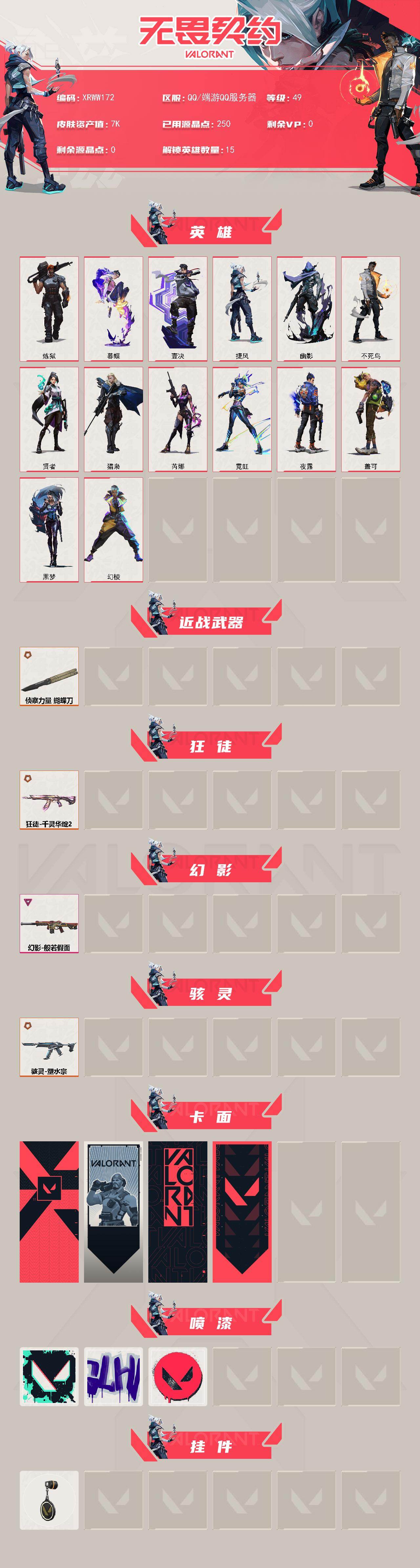 【xrww172】xr46946-无二次-端q【英雄】:幻棱,炼狱,暮蝶,壹决,捷风,幽影,不死鸟,贤者,猎枭,芮娜,霓虹,夜露,盖可,黑梦 【近战武器】:近战武器-侦察力量 蝴蝶刀 【狂徒】:狂徒-千灵华绽//2.0 【幻影】:幻影-般若假面 【骇灵】:骇灵-塑水宗 【卡面】:代号红色 卡面,新兵报到 卡面,v契约 卡面,无畏契约 卡面 【喷漆】:胜利属于无畏契约 喷漆,glhf 喷漆,无畏契约 喷漆 【挂饰】:无畏契约 纪念币 挂饰