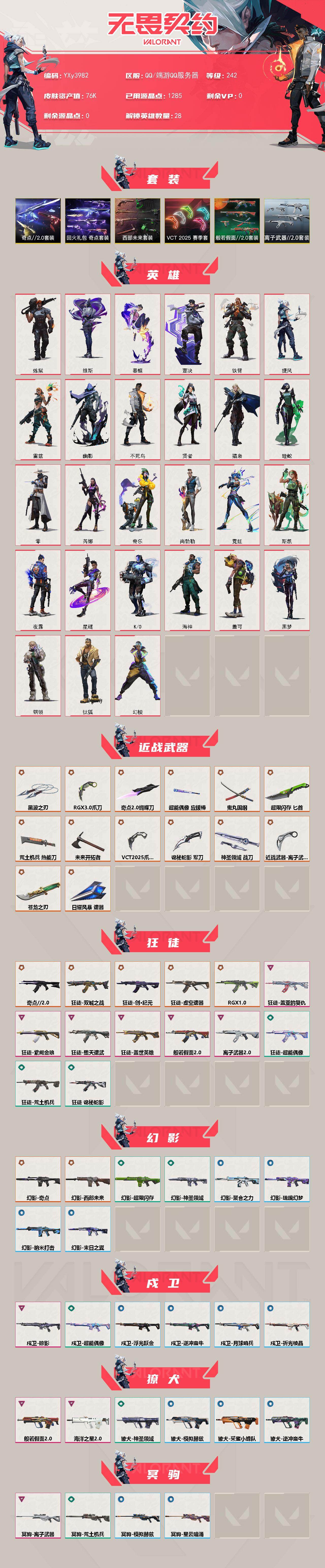 【7.6w库存质量库存号.vct爪刀.奇点2.0套装.西部套.恶鬼套.离子套.黑波之刃.显卡爪刀.苍龙之刃.十一狂徒】y3982【无二次】【因赛季更新游戏段付以上号为准!】 【套装】:vct 2025 赛季套装,西部未来套装,奇点//2.0套装,回火礼包:奇点套装,般若假面//2.0套装,离子武器//2.0套装 【英雄】:幻棱,炼狱,维斯,暮蝶,钛狐,壹决,铁臂,捷风,雷兹,幽影,不死鸟,
