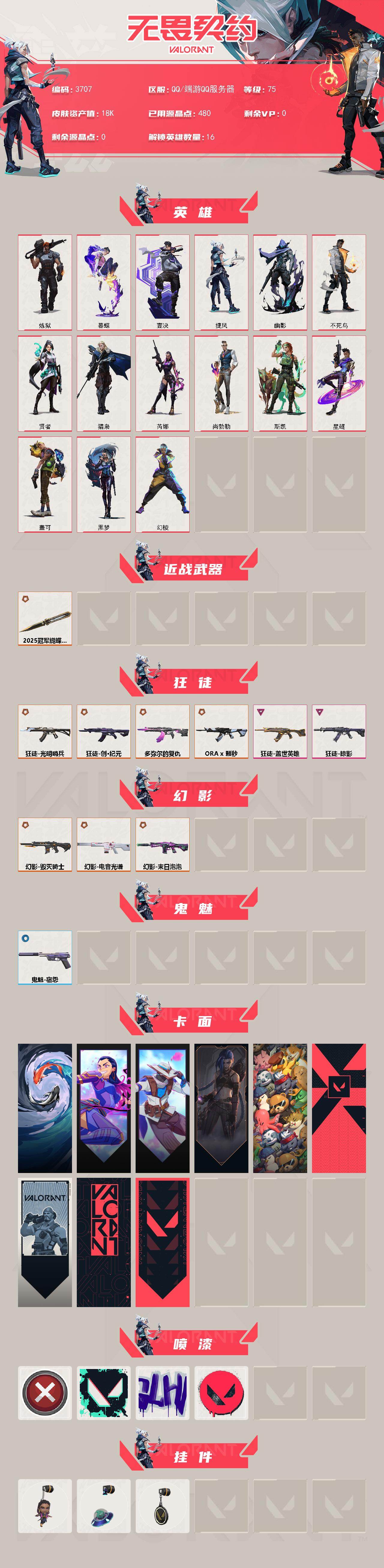 【3707】【英雄】:幻棱,炼狱,暮蝶,壹决,捷风,幽影,不死鸟,贤者,猎枭,芮娜,尚勃勒,斯凯,星礈,盖可,黑梦 【近战武器】:近战武器-2025全球冠军赛 蝴蝶刀 【狂徒】:狂徒-光明哨兵,狂徒-创·纪元,狂徒-多弥尔的复仇,狂徒-a x 颗秒,狂徒-掠影,狂徒-盖世英雄 【幻影】:幻影-毁灭骑士,幻影-电音光谱,幻影-末日泡泡,幻影-电音光谱 【鬼魅】:鬼魅-宿怨 【卡面】:红鳞松叶
