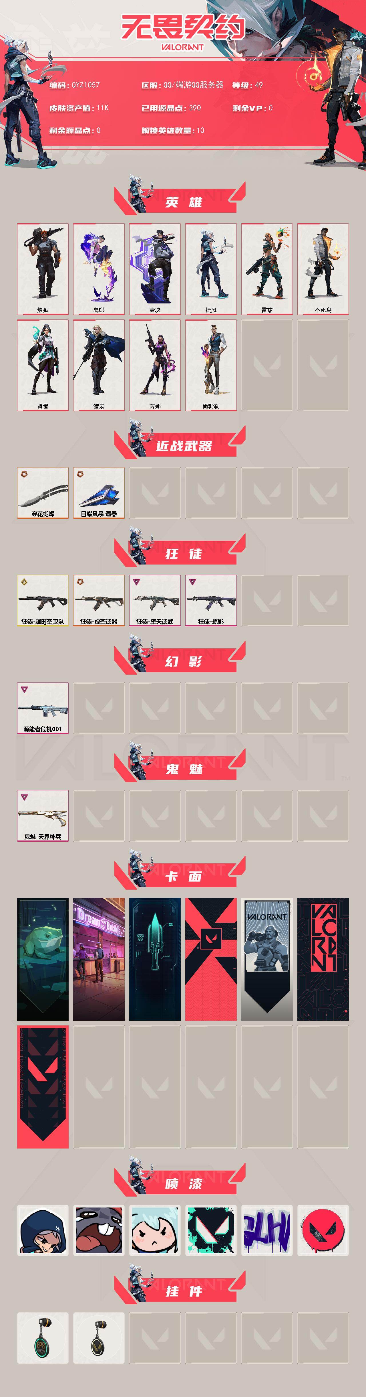 【qyz1057】终极4/传奇1/卓越4/皮肤32/等级49/段位:未定级/炼狱/暮蝶/壹决/捷风/雷兹/不死鸟/贤者/猎枭/芮娜/尚勃勒/近战武器-穿花蝴蝶/近战武器-日耀风暴 遗器/狂徒-超时空卫队/狂徒-虚空遗器/狂徒-堕天遗武/狂徒-掠影/幻影-源能者危机001/鬼魅-天界神兵/霓帧牛蛙 卡面/梦幻奶茶 卡面/零点嗅探设计图 卡面/代号红色 卡面/新兵报到 卡面/v契约 卡面/无畏契约 卡面/捷风差距 喷漆/我的刀呢? 喷漆/飓刃涂鸦 喷漆 /胜利属于无畏契约 喷漆/glhf 喷漆/无畏契约 喷漆/第八季//第三幕 纪念币 挂饰/无畏契约 纪念币 挂饰