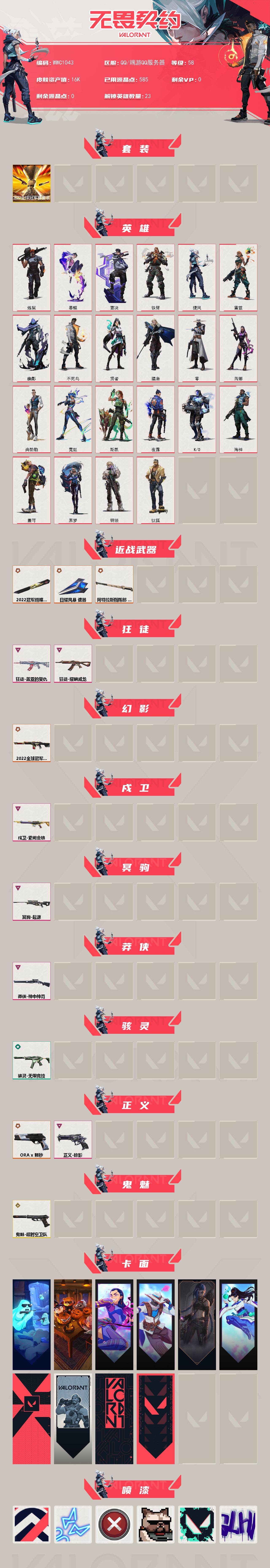 【wwc1043】终极4/传奇2/卓越6/皮肤37/等级58/段位:未定级/2022全球冠军赛套装/炼狱/暮蝶/钛狐/壹决/铁臂/捷风/雷兹/幽影/不死鸟/贤者/猎枭/零/芮娜/尚勃勒/霓虹/斯凯/夜露/k/o/海神/盖可/黑梦/钢锁/近战武器-2022全球冠军赛 蝴蝶刀/近战武器-日耀风暴 遗器/近战武器-阿特拉斯指挥部 甩棍/狂徒-盖亚的复仇/狂徒-耀鳞威龙/幻影-2022全球冠军赛/戍卫-紫阙金琅/冥驹-起源/莽侠-神中神罚/骇灵-无限竞技/正义-a x 颗秒/正义-掠影/鬼魅-超时空卫队/精灵大战 卡面/南瓜盛典 卡面/无畏契约go!第一卷:芮娜 卡面/无畏契约go!第一卷:零 卡面/《双城之战》金克丝 卡面/无畏契约go!第一卷:贤者 卡面/代号红色 卡面/新兵报到 卡面/v契约 卡面/无畏契约 卡面/控场勿近 喷漆/霓光四射 喷漆/买装还是存钱 喷漆/关门放狗 喷漆/胜利属于无畏契约 喷漆/glhf 喷漆/无畏契约 喷漆/第九季//第三幕 纪念币 挂饰/无畏契约go!第一卷 零 挂饰/薰衣草之心 挂饰/天外飞客 挂饰/无畏契约 纪念币 挂饰