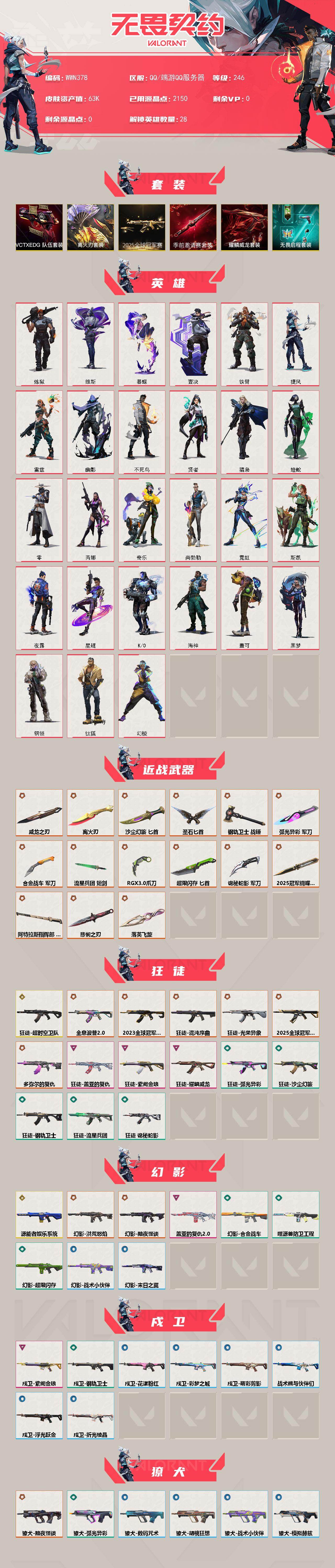【wwn378】终极30/传奇2/卓越10/皮肤158/等级246/段位:钻石/2025全球冠军赛套装/无畏契约季前邀请赛套装/离火刃套装/vctxedg 队伍套装/耀鳞威龙套装/无畏启程套装/幻棱/炼狱/维斯/暮蝶/钛狐/壹决/铁臂/捷风/雷兹/幽影/不死鸟/贤者/猎枭/蝰蛇/零/芮娜/奇乐/尚勃勒/霓虹/斯凯/夜露/星礈/k/o/海神/盖可/黑梦/钢锁/近战武器-2025全球冠军赛 蝴蝶刀/近战武器-无畏契约季前邀请赛 悲悯之刃/近战武器-rgx 11z pro//3.0 爪刀/近战武器-离火刃/近战武器-落英飞旋/近战武器-威龙之刃/近战武器-流星兵团 短剑/近战武器-超限闪存 匕首/近战武器-钢轨卫士 战锤/近战武器-合金战车 军刀/近战武器-弧光异彩 军刀/近战武器-沙尘幻旅 匕首/近战武器-圣石匕首/近战武器-诡秘蛇影 军刀/近战武器-阿特拉斯指挥部 甩棍/狂徒-超时空卫队/狂徒-2025全球冠军赛/狂徒-2023全球冠军赛/狂徒-混沌序曲/狂徒-全息波普//2.0/狂徒-光荣异象/狂徒-多弥尔的复仇/狂徒-盖亚的复仇/狂徒-耀鳞威龙/狂徒-紫阙金琅/狂徒-钢轨卫士/狂徒-弧光异彩/狂徒-流星兵团/狂徒-沙尘幻旅/狂徒-诡秘蛇影/幻影-源能者娱乐系统/幻影-黯夜怪谈/幻影-洪荒怒焰/幻影-盖亚的复仇//2.0/幻影-超限闪存/幻影-合金战车/幻影-噬源兽防卫工程/幻影-战术小伙伴/幻影-末日之翼/戍卫-紫阙金琅/戍卫-钢轨卫士/戍卫-彩梦之城/戍卫-浮光跃金/戍卫-花漾粉红/戍卫-萌彩剪影/戍卫-战术熊与伙伴们/戍卫-折光棱晶/獠犬-黯夜怪谈/獠犬-弧光异彩/獠犬-胡桃狂想/獠犬-模拟赫兹/獠犬-数码咒术/獠犬-战术小伙伴/冥驹-归零者/冥驹-胡桃狂想/冥驹-花漾粉红/冥驹-模拟赫兹/飞将-西部未来/飞将-合金战车/飞将-沙尘幻旅/飞将-信手涂鸦/飞将-光导纤维/飞将-战术熊与伙伴们/飞将-末日之翼/莽侠-神中神罚/莽侠-超限闪存/莽侠-诡秘蛇影/莽侠-纤云弄巧/战神-浮光跃金/战神-萌彩剪影/战神-数码咒术/奥丁-流星兵团/奥丁-信手涂鸦/奥丁-战术小伙伴/奥丁-末日之翼/判官-诡秘蛇影/判官-萌彩剪影/判官-数码咒术/雄鹿-起源/雄鹿-彩梦之城/雄鹿-模拟赫兹/骇灵-流星兵团/骇灵-沙尘幻旅/骇灵-浮光跃金/骇灵-光导纤维/骇灵-花漾粉红/骇灵-信手涂鸦/蜂刺-超限闪存/蜂刺-合金战车/蜂刺-弧光异彩/蜂刺-胡桃狂想/蜂刺-纤云弄巧/蜂刺-战术小伙伴/蜂刺-折光棱晶/标配-紫阙金琅/标配-超能偶像/标配-彩梦之城/标配-超能冲撞/标配-浮光跃金/标配-光导纤维/标配-战术熊与伙伴们/标配-折光棱晶/标配-vct x edg/正义-奇点/正义-塑水宗/正义-离子武器/正义-超限闪存/正义-合金战车/正义-沙尘幻旅/正义-复古浪潮/正义-纳米打击/正义-纤云弄巧/鬼魅-耀鳞威龙/鬼魅-流星兵团/鬼魅-诡秘蛇影/鬼魅-光导纤维/鬼魅-胡桃狂想/鬼魅-模拟赫兹/鬼魅-扑棱扑棱/鬼魅-数码咒术/鬼魅-信手涂鸦/鬼魅-星云暗涌/狂怒-钢轨卫士/狂怒-花漾粉红/狂怒-萌彩剪影/狂怒-战术熊与伙伴们/短炮-钢轨卫士/短炮-弧光异彩/短炮-梦魇恶魔/短炮-天才少女/短炮-纤云弄巧/短炮-末日之翼/进入射程 卡面/《双城之战》拥抱 卡面/精灵大战 卡面/欢迎来到底城 卡面/南瓜盛典 卡面/vct cn首冠 卡面/唱片的故事 卡面/钢弓与箭弦 卡面/无畏契约:暮蝶 卡面/排除故障 卡面/战术桌游 卡面/悠享食光 卡面/修车达人 卡面/热舞环节 卡面/模拟赫兹 卡面/浮光跃金 卡面/超限闪存 卡面/维斯工牌 卡面/正义的化身 卡面/终章:生意人麦宝 卡面/铁之华 卡面/时间到 卡面/最高舞台 卡面/树懒大作战 卡面/声感陷阱设计图 卡面/红鳞松叶 卡面/clutch 卡面/梦幻奶茶 卡面/终章:打造专属狂徒 卡面/趁热吃 卡面/西装暴徒 卡面/失控边缘 卡面/哨卫者之领域 卡面/暮蝶工牌 卡面/战术熊与伙伴们 卡面/源能反应 卡面/流星兵团 卡面/纤云弄巧 卡面/暂别喧嚣 卡面/打造专属狂徒 卡面/零点嗅探设计图 卡面/终章:瓦娃脸雪糕 卡面/表象之下 卡面/沙雕爆能器 卡面/无畏契约go!第一卷:芮娜 卡面/深海水族 卡面/复古浪潮 卡面/清除名单 卡面/无畏契约go!第一卷:零 卡面/终章:同步耍酷 卡面/龍记 卡面/化茧成蝶 卡面/比比看谁快? 卡面/无垠星环 卡面/先瓦为敬 绿色 卡面/《双城之战》金克丝 卡面/蝰蛇vs幽影 卡面/势不可挡//盖可 卡面/逆向独行 卡面 /同步耍酷 卡面/完美调谐 卡面 /没有什么能逃过我的眼睛 卡面/光导纤维 卡面/战术小伙伴 卡面/钢轨卫士 卡面/暗呛 卡面/无畏契约go!第一卷:贤者 卡面/终章:黑影先生的咖啡! 卡面/铁臂vs雷兹 卡面/纪念照 p2 卡面/钢锁vs盖可 卡面/别冒尖 卡面/一击全倒 卡面/黑影先生的咖啡! 卡面/天台狂欢 卡面/胡桃狂想 卡面/沙尘幻旅 卡面/壹决工牌 卡面/萌彩剪影 卡面/势不可挡//k/o 卡面/夯实根基 卡面/"luie" 卡面/热烈欢迎 卡面/铁臂设计图 卡面/代号红色 卡面/冰淇淋店 卡面/新兵报到 卡面/友军火力 卡面/v契约 卡面/无畏契约 卡面/暗潮 卡面/嗨宝南瓜灯 喷漆/嘭! 喷漆/都算到了 喷漆/控场勿近 喷漆/皮蛋呼呼 喷漆/像素星礈 喷漆/图谋不轨的零 喷漆/伤心心 喷漆/小丑猫 喷漆/模拟赫兹 喷漆/高丽风情小熊 喷漆/蹲到一个 喷漆/全力集中 喷漆/超限闪存 喷漆/rua一下 喷漆/熊抱 喷漆/蛋糕还是爆能器? 喷漆/高丽风情小虎 喷漆/记在小本本 喷漆/防弹企鹅 喷漆/高丽风情小蛙 喷漆/超级粉丝 喷漆/捷风差距 喷漆/惊声尖叫 喷漆/水晶球 喷漆/2021冠军巡回赛花火 喷漆/拼一呛 喷漆/加油!加油! 喷漆/开心到爆炸 喷漆/皮蛋萌舞 喷