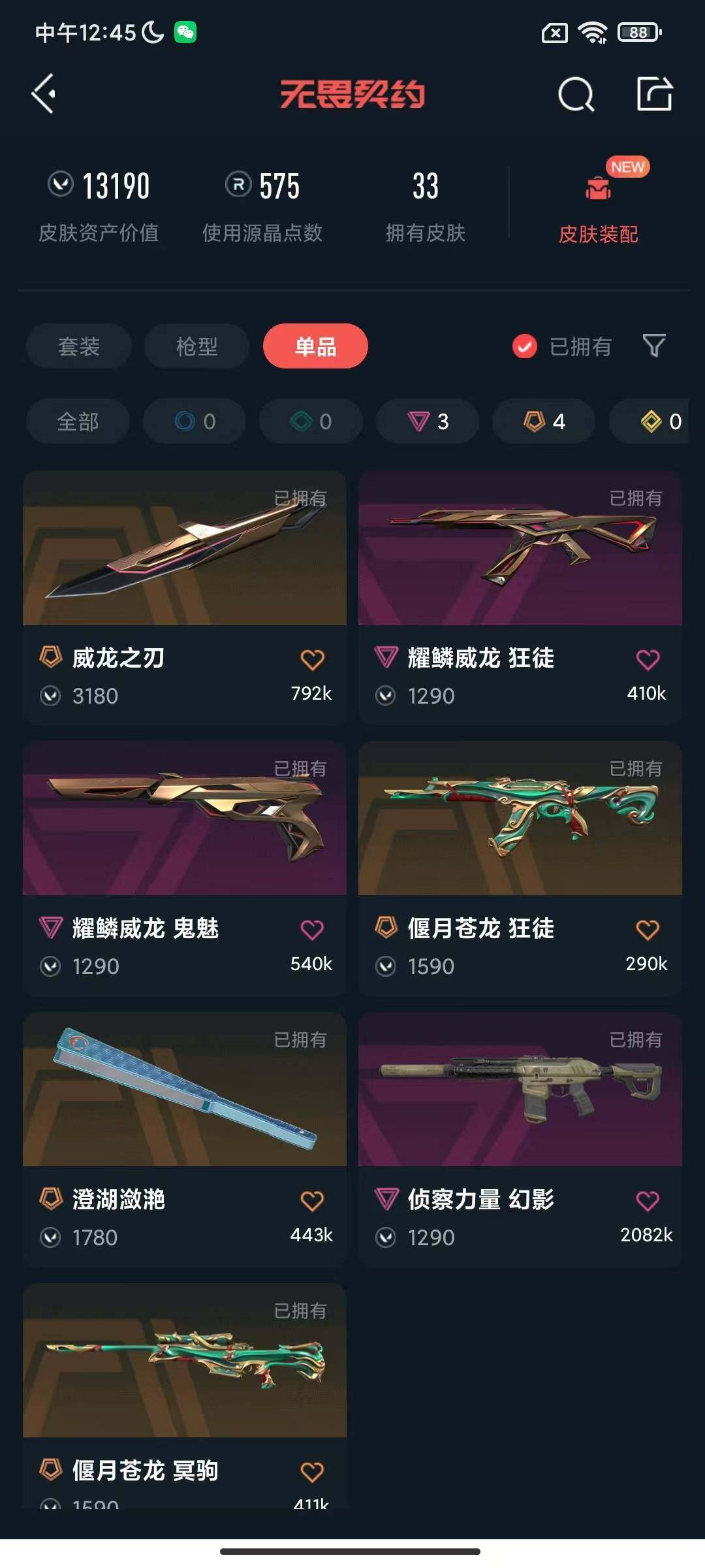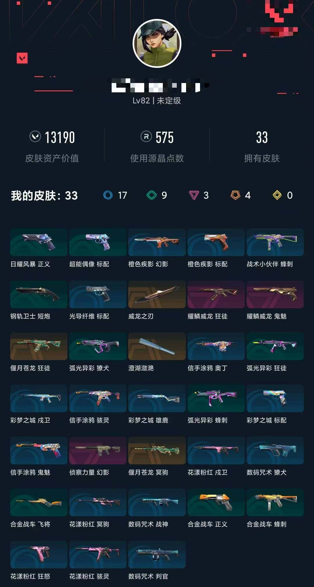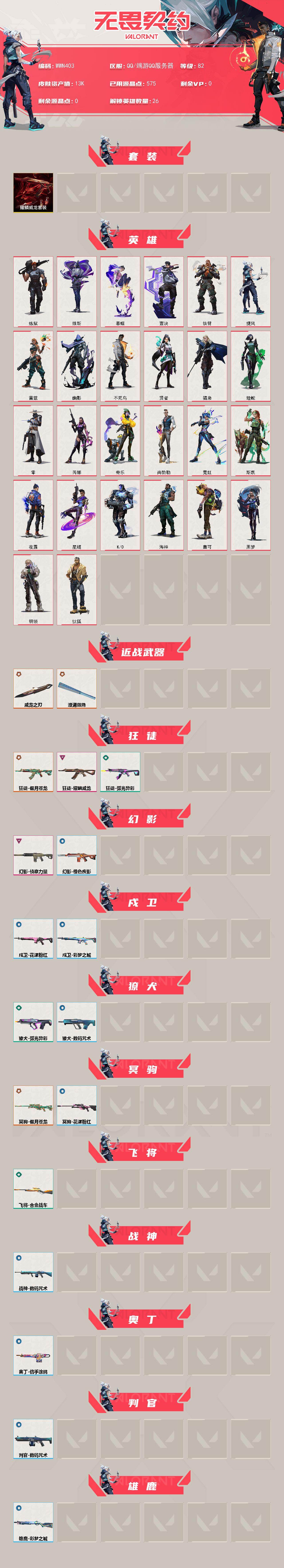 【wwn403】终极4/卓越3/皮肤33/等级82/段位:未定级/耀鳞威龙套装/炼狱/维斯/暮蝶/钛狐/壹决/铁臂/捷风/雷兹/幽影/不死鸟/贤者/猎枭/蝰蛇/零/芮娜/奇乐/尚勃勒/霓虹/斯凯/夜露/星礈/k/o/海神/盖可/黑梦/钢锁/近战武器-威龙之刃/近战武器-澄湖潋滟/狂徒-偃月苍龙/狂徒-耀鳞威龙/狂徒-弧光异彩/幻影-侦察力量/幻影-橙色疾影/戍卫-彩梦之城/戍卫-花漾粉红/獠犬-弧光异彩/獠犬-数码咒术/冥驹-偃月苍龙/冥驹-花漾粉红/飞将-合金战车/战神-数码咒术/奥丁-信手涂鸦/判官-数码咒术/雄鹿-彩梦之城/骇灵-花漾粉红/骇灵-信手涂鸦/蜂刺-合金战车/蜂刺-弧光异彩/蜂刺-战术小伙伴/标配-超能偶像/标配-彩梦之城/标配-橙色疾影/标配-光导纤维/正义-合金战车/鬼魅-耀鳞威龙/鬼魅-信手涂鸦/狂怒-花漾粉红/短炮-钢轨卫士/《双城之战》拥抱 卡面/精灵大战 卡面/欢迎来到底城 卡面/南瓜盛典 卡面/修车达人 卡面/正义的化身 卡面/铁之华 卡面/时间到 卡面/最高舞台 卡面/归乡 // 蝰蛇 卡面/声感陷阱设计图 卡面/梦幻奶茶 卡面/源能反应 卡面/零点嗅探设计图 卡面/沙雕爆能器 卡面/清除名单 卡面/无畏契约go!第一卷:零 卡面/光导纤维 卡面/战术小伙伴 卡面/钢轨卫士 卡面/暗呛 卡面/热烈欢迎 卡面/铁臂设计图 卡面/代号红色 卡面/冰淇淋店 卡面/新兵报到 卡面/友军火力 卡面/v契约 卡面/无畏契约 卡面/嗨宝南瓜灯 喷漆/嘭! 喷漆/都算到了 喷漆/控场勿近 喷漆/熊抱 喷漆/又被闪了 喷漆/超级粉丝 喷漆/捷风差距 喷漆/惊声尖叫 喷漆/拼一呛 喷漆/我觉得不行 喷漆/我的刀呢? 喷漆/新潮流 喷漆/双击点赞 喷漆/买装还是存钱 喷漆/醒狮贺春 喷漆/酷熊冲浪 喷漆/无畏契约go!第一卷:捷风 喷漆/省钱大师 喷漆 /皇冠拉花 喷漆/该转点了 喷漆/老铁困了 喷漆/口袋贤者 喷漆/胜利属于无畏契约 喷漆/glhf 喷漆/无畏契约 喷漆/悠闲鸡块 挂饰/伞绳 挂饰/《双城之战》小蛋糕 挂饰/第九季//第三幕 纪念币 挂饰/无畏契约go!第一卷 芮娜 挂饰/无畏契约go!第一卷 零 挂饰/熔岩灯 挂饰/第九季//第二幕 纪念币 挂饰/终章:这瓜保熟 挂饰/糖葫芦 挂饰/袖珍捷风 挂饰/迷你浓缩 挂饰/第九季//第一幕 纪念币 挂饰/荧光棒 挂饰/第八季//第三幕 纪念币 挂饰/第八季//第二幕 纪念币 挂饰 /天外飞客 挂饰/好运福爪 挂饰/插电音乐 挂饰/第八季//第一幕 纪念币 挂饰/第七季//第三幕 纪念币 挂饰/幸运中国结 挂饰/第七季//第二幕 纪念币 挂饰/无畏契约 纪念币 挂饰