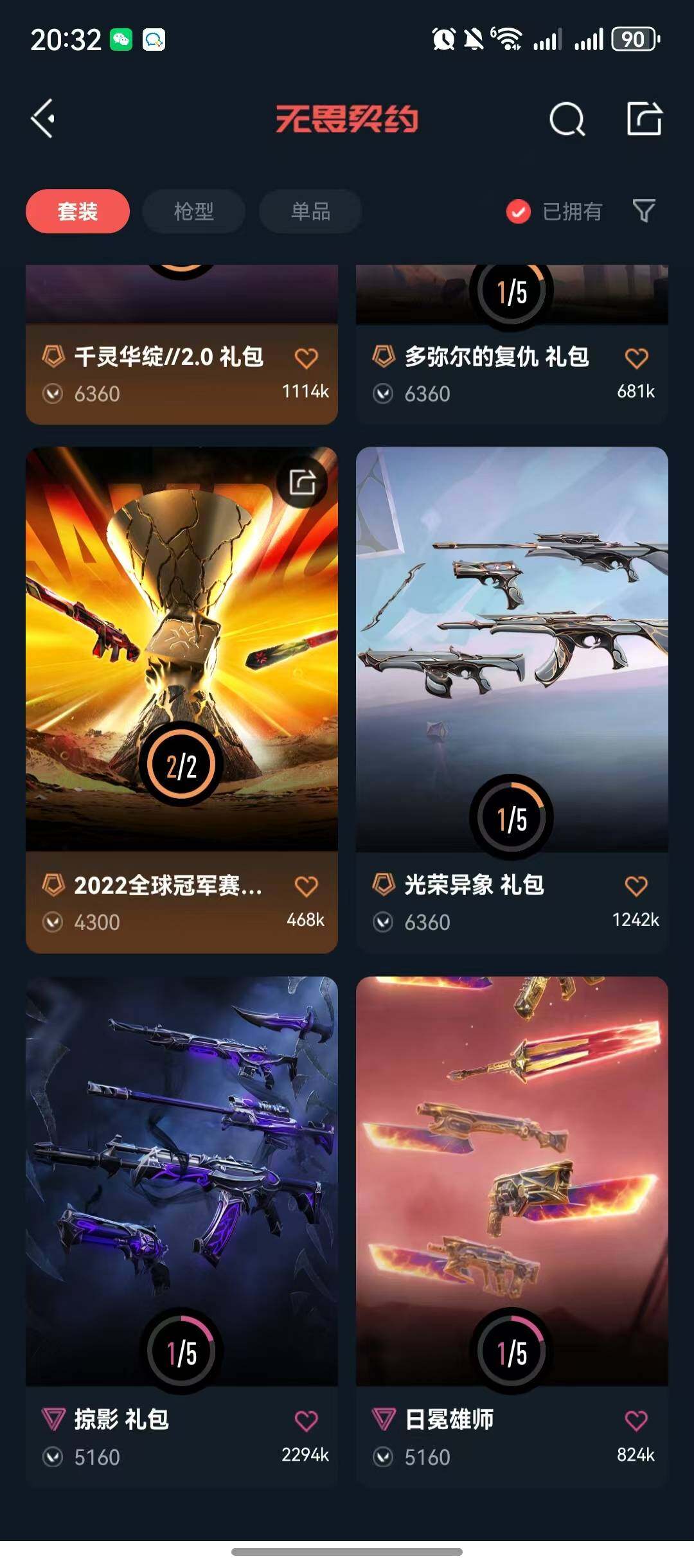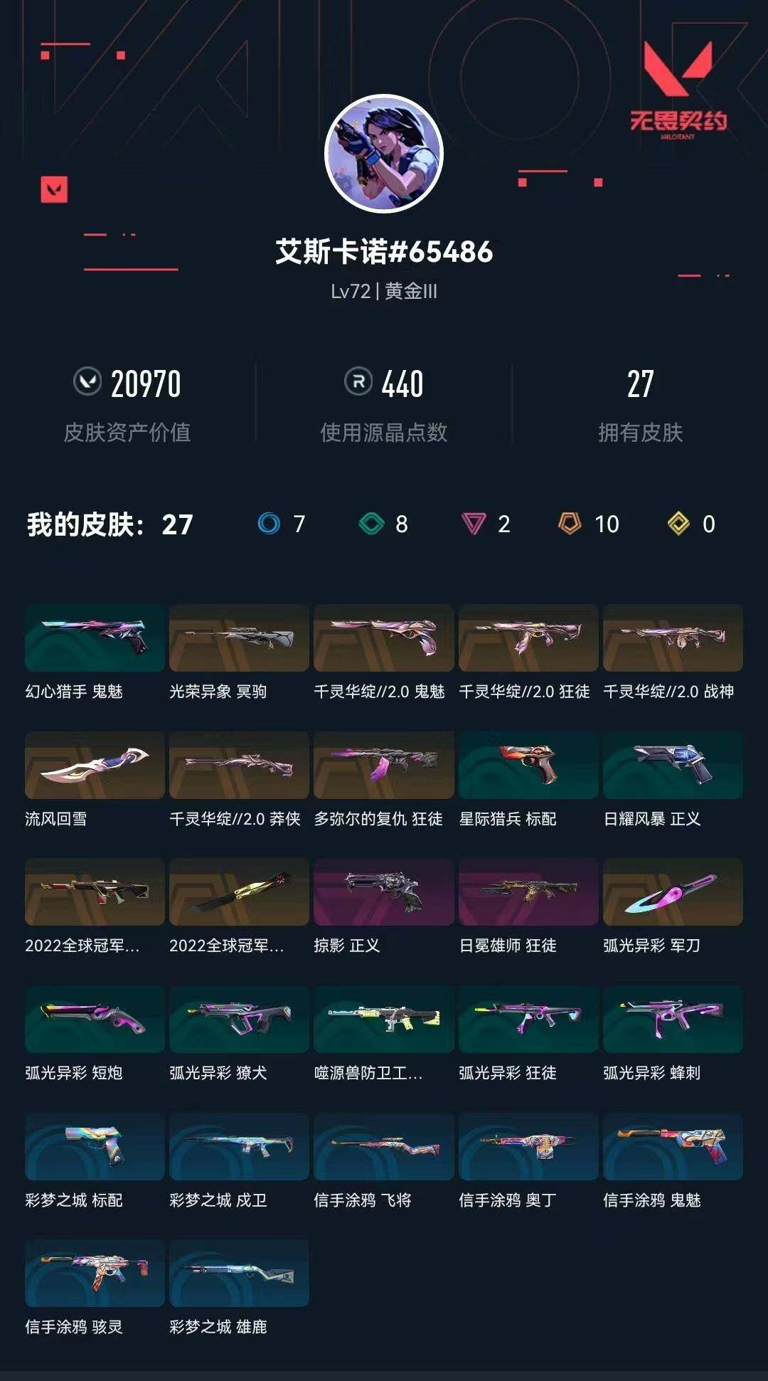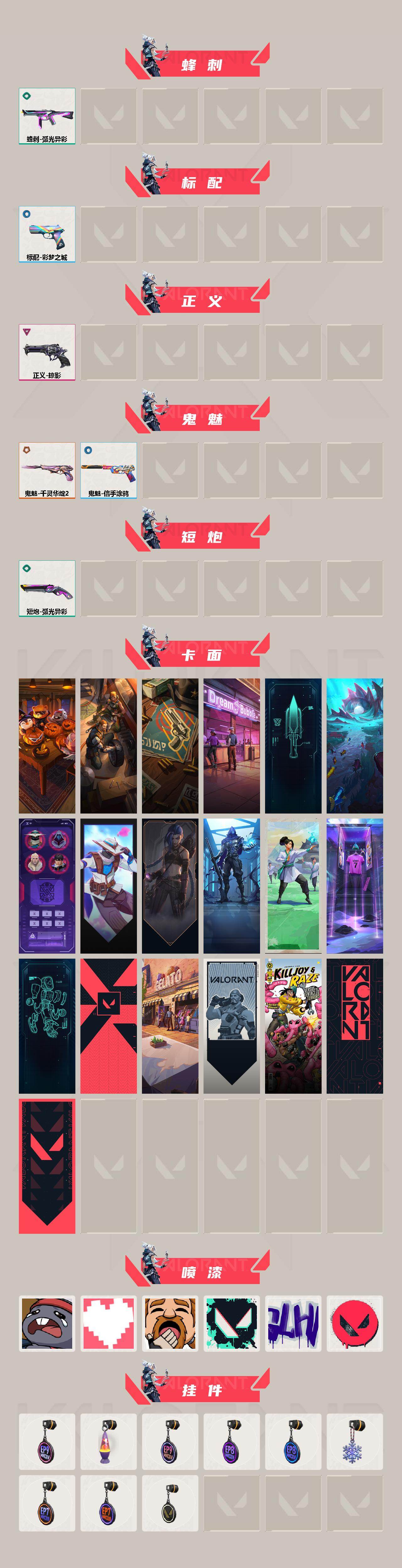 【套装】:2022全球冠军赛套装,千灵华绽//2.0套装 【英雄】:炼狱,维斯,暮蝶,壹决,铁臂,捷风,雷兹,幽影,不死鸟,贤者,猎枭,蝰蛇,零,芮娜,奇乐,尚勃勒,斯凯,夜露,星礈,k/o,盖可,黑梦,钢锁 【近战武器】:近战武器-2022全球冠军赛 蝴蝶刀,近战武器-流风回雪,近战武器-弧光异彩 军刀 【狂徒】:狂徒-多弥尔的复仇,狂徒-千灵华绽//2.0,狂徒-日冕雄师,狂徒-弧光异彩 【幻影】:幻影-2022全球冠军赛,幻影-噬源兽防卫工程 【戍卫】:戍卫-彩梦之城 【獠犬】:獠犬-弧光异彩 【冥驹】:冥驹-光荣异象 【飞将】:飞将-信手涂鸦 【莽侠】:莽侠-千灵华绽//2.0 【战神】:战神-千灵华绽//2.0 【奥丁】:奥丁-信手涂鸦 【雄鹿】:雄鹿-彩梦之城 【骇灵】:骇灵-信手涂鸦 【蜂刺】:蜂刺-弧光异彩 【标配】:标配-彩梦之城 【正义】:正义-掠影 【鬼魅】:鬼魅-千灵华绽//2.0,鬼魅-信手涂鸦 【短炮】:短炮-弧光异彩 【卡面】:南瓜盛典 卡面,修车达人 卡面,正义的化身 卡面,梦幻奶茶 卡面,零点嗅探设计图 卡面,珍珠棘贝 卡面,清除名单 卡面,无畏契约go!第一卷:零 卡面,《双城之战》金克丝 卡面,暗呛 卡面,夯实根基 卡面,"luie" 卡面,铁臂设计图 卡面,代号红色 卡面,冰淇淋店 卡面,新兵报到 卡面,友军火力 卡面,v契约 卡面,无畏契约 卡面 【喷漆】:熊抱 喷漆,双击点赞 喷漆,老铁困了 喷漆,胜利属于无畏契约 喷漆,glhf 喷漆,无畏契约 喷漆 【挂饰】:第九季//第三幕 纪念币 挂饰,熔岩灯 挂饰,第九季//第二幕 纪念币 挂饰,第八季//第二幕 纪念币 挂饰 ,第八季//第一幕 纪念币 挂饰,冬日絮语 挂饰,第七季//第三幕 纪念币 挂饰,第七季//第二幕 纪念币 挂饰,无畏契约 纪念币 挂饰