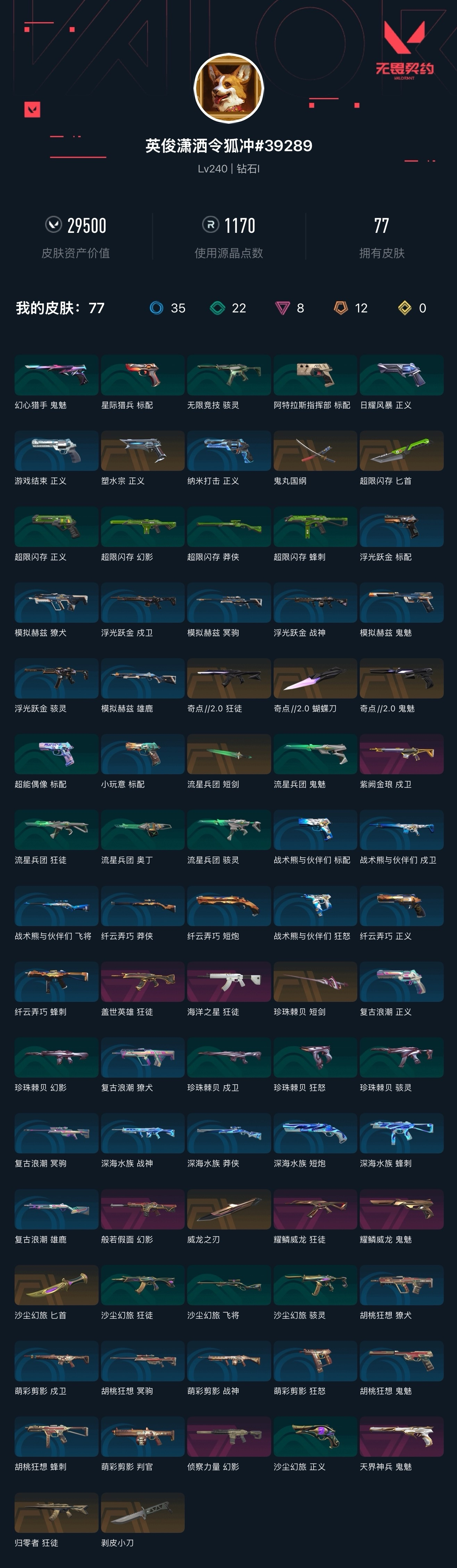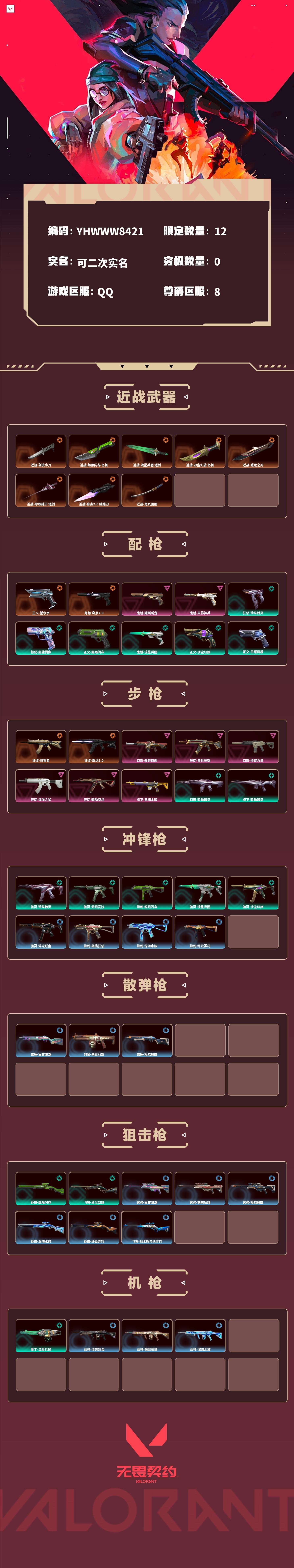 【无畏契约】【yhwww8421】等级:240,已用无畏点29500,已用源晶点1170,橙皮:近战-剥皮小刀|近战-超限闪存 匕首|近战-流星兵团 短剑|近战-沙尘幻旅 匕首|近战-威龙之刃|近战-珍珠棘贝 短剑|狂徒-归零者|正义-塑水宗|狂徒-奇点2.0|鬼魅-奇点2.0|近战-奇点2.0 蝴蝶刀|近战-鬼丸国纲__紫皮:鬼魅-耀鳞威龙|鬼魅-天界神兵|幻影-般若假面|狂徒-盖世英雄|幻影-侦察力量|狂徒-海洋之星|狂徒-耀鳞威龙|戍卫-紫阙金琅__绿皮:骇灵-珍珠棘贝|幻影-珍珠棘贝|狂怒-珍珠棘贝|戍卫-珍珠棘贝|骇灵-无限竞技|标配-超能偶像|正义-超限闪存|莽侠-超限闪存|幻影-超限闪存|蜂刺-超限闪存|骇灵-流星兵团|鬼魅-流星兵团|狂徒-流星兵团|奥丁-流星兵团|正义-沙尘幻旅|狂徒-沙尘幻旅|飞将-沙尘幻旅|骇灵-沙尘幻旅|正义-日耀风暴|标配-星际猎兵|鬼魅-幻心猎手__蓝皮:獠犬-复古浪潮|冥驹-复古浪潮|雄鹿-复古浪潮|正义-复古浪潮|标配-小玩意|正义-游戏结束|正义-纳米打击|骇灵-浮光跃金|标配-浮光跃金|戍卫-浮光跃金|战神-浮光跃金|鬼魅-胡桃狂想|獠犬-胡桃狂想|蜂刺-胡桃狂想|冥驹-胡桃狂想|戍卫-萌彩剪影|战神-萌彩剪影|狂怒-萌彩剪影|判官-萌彩剪影|鬼魅-模拟赫兹|獠犬-模拟赫兹|冥驹-模拟赫兹|雄鹿-模拟赫兹|战神-深海水族|短炮-深海水族|蜂刺-深海水族|莽侠-深海水族|莽侠-纤云弄巧|正义-纤云弄巧|短炮-纤云弄巧|蜂刺-纤云弄巧|飞将-战术熊与伙伴们|狂怒-战术熊与伙伴们|戍卫-战术熊与伙伴们|标配-战术熊与伙伴们|标配-阿特拉斯指挥部__段位:钻石__英雄:尚勃勒|维斯|黑梦|斯凯|暮蝶|盖可|霓虹|壹决|星礈|k/o|幽影|夜露|钢锁|海神|奇乐|炼狱|铁臂|贤者|猎枭|钛狐|芮娜|零|捷风|蝰蛇|不死鸟|幻棱|雷兹|禁灭