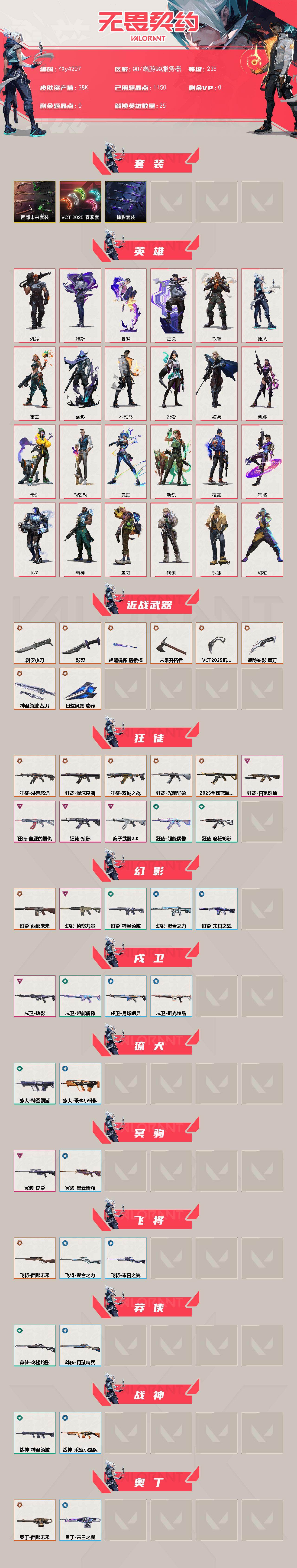 【双神话挂饰】【3.8w库存vct爪刀.西部套.掠夺套.剥皮小刀.九狂徒双幻影流脓.混沌.双城.光荣异象.25冠军.狮子.盖亚.侦查】y4207【无二次】【因赛季更新游戏段付以上号为准!】 【套装】:vct 2025 赛季套装,西部未来套装,掠影套装 【英雄】:幻棱,炼狱,维斯,暮蝶,钛狐,壹决,铁臂,捷风,雷兹,幽影,不死鸟,贤者,猎枭,芮娜,奇乐,尚勃勒,霓虹,斯凯,夜露,星礈,k/o