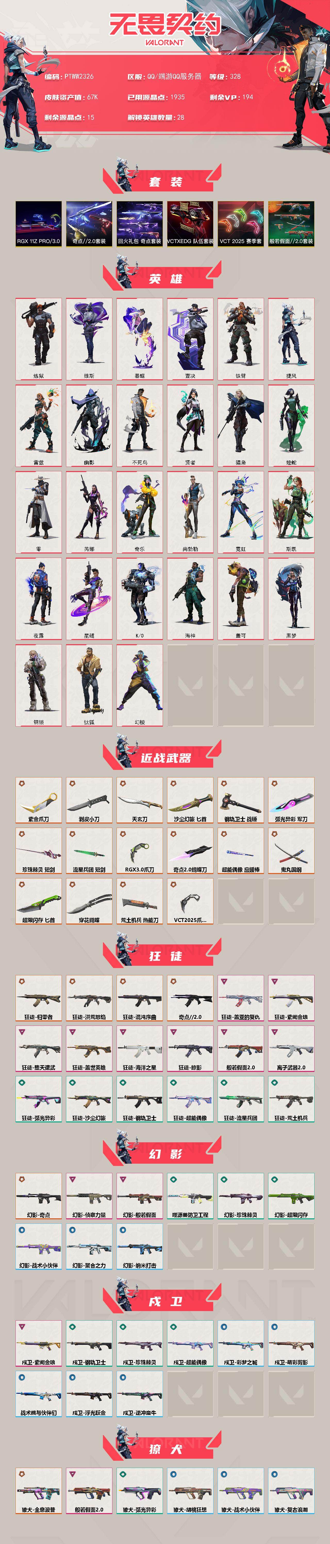 【ptww2326】终极28/传奇1/卓越17/皮肤150/等级328/段位:未定级/vct 2025 赛季套装/rgx11zpro//3.0/奇点//2.0套装/vctxedg 队伍套装/回火礼包:奇点套装/般若假面//2.0套装/幻棱/炼狱/维斯/暮蝶/钛狐/壹决/铁臂/捷风/雷兹/幽影/不死鸟/贤者/猎枭/蝰蛇/零/芮娜/奇乐/尚勃勒/霓虹/斯凯/夜露/星礈/k/o/海神/盖可