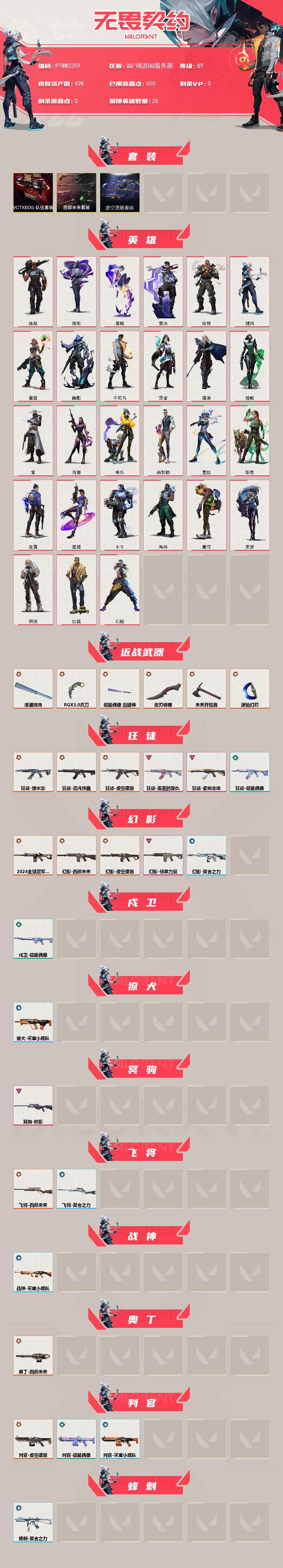 【套装】:虚空遗器套装,西部未来套装,vctxedg 队伍套装 【英雄】:幻棱,炼狱,维斯,暮蝶,钛狐,壹决,铁臂,捷风,雷兹,幽影,不死鸟,贤者,猎枭,蝰蛇,零,芮娜,奇乐,尚勃勒,霓虹,斯凯,夜露,星礈,k/o,海神,盖可,黑梦,钢锁 【近战武器】:近战武器-rgx 11z pro//3.0 爪刀,近战武器-澄湖潋滟,近战武器-源始幻刃,近战武器-未来开拓者,近战武器-超能偶像 应援棒,近