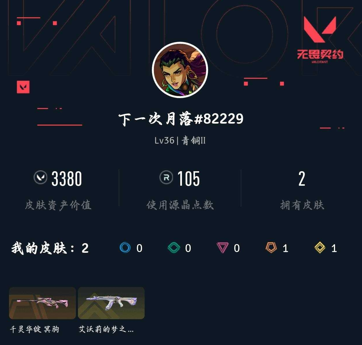 【无畏契约】【yhwww8500】等级:36,已用无畏点3380,已用源晶点105,金皮:狂徒-艾沃莉的梦之翼__橙皮:冥驹-千灵华绽__段位:青铜__英雄:维斯|黑梦|暮蝶|霓虹|k/o|幽影|炼狱|贤者|猎枭|芮娜|零|捷风|蝰蛇|不死鸟|雷兹|禁灭