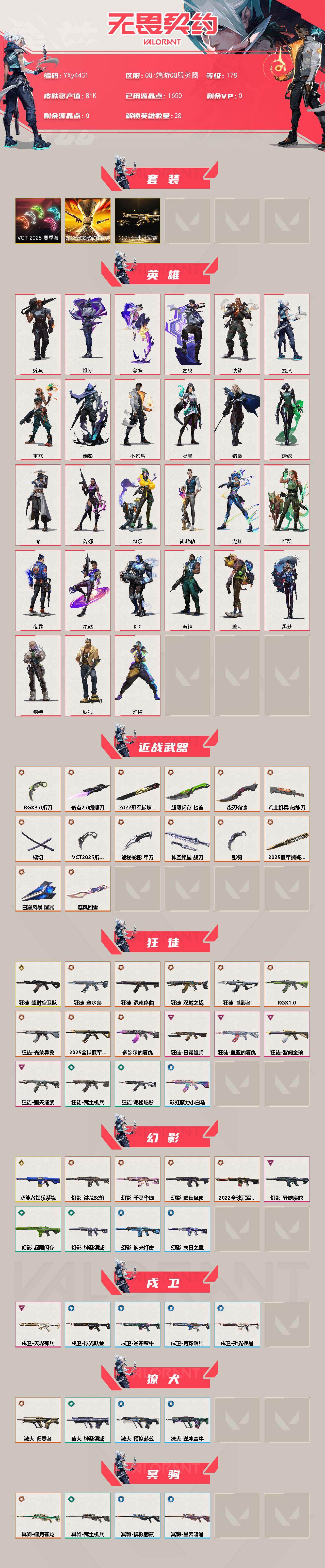 【8.1w库存vct爪刀.22冠军套.25冠军套.显卡爪刀..镭切.掠夺爪刀.莲花扇.十三狂徒六幻影超时空.塑水宗.混沌.双城.显卡.光荣异象.多弥尔.电玩.莲花.古神.蛇年】y4431【无二次】【因赛季更新游戏段付以上号为准!】 【套装】:2025全球冠军赛套装,2022全球冠军赛套装,vct 2025 赛季套装 【英雄】:幻棱,炼狱,维斯,暮蝶,钛狐,壹决,铁臂,捷风,雷兹,幽影,不死