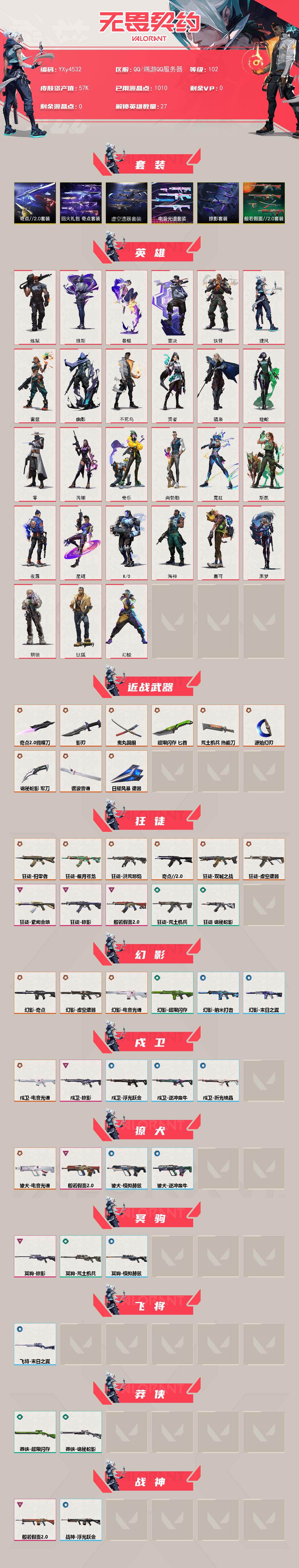 【5.7w库存奇点2.0套装.虚空套.光谱套.掠夺套.恶鬼套.九狂徒三幻影青龙.流脓.双城.紫金】y4532【可二次】【因赛季更新游戏段付以上号为准!】 【套装】:电音光谱套装,虚空遗器套装,奇点//2.0套装,回火礼包:奇点套装,般若假面//2.0套装,掠影套装 【英雄】:幻棱,炼狱,维斯,暮蝶,钛狐,壹决,铁臂,捷风,雷兹,幽影,不死鸟,贤者,猎枭,蝰蛇,零,芮娜,奇乐,尚勃勒,霓虹,