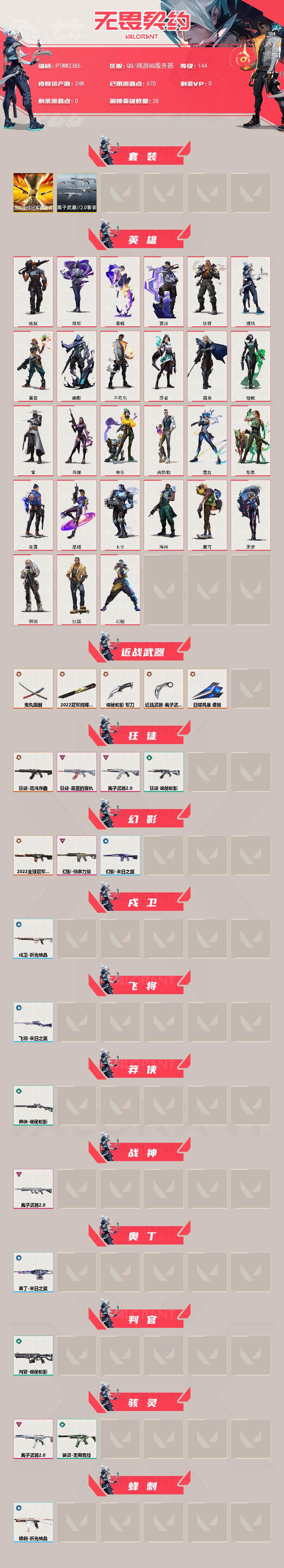 【套装】:2022全球冠军赛套装,离子武器//2.0套装 【英雄】:幻棱,炼狱,维斯,暮蝶,钛狐,壹决,铁臂,捷风,雷兹,幽影,不死鸟,贤者,猎枭,蝰蛇,零,芮娜,奇乐,尚勃勒,霓虹,斯凯,夜露,星礈,k/o,海神,盖可,黑梦,钢锁 【近战武器】:近战武器-2022全球冠军赛 蝴蝶刀,近战武器-鬼丸国纲,近战武器-离子武器//2.0 爪刀,近战武器-诡秘蛇影 军刀,近战武器-日耀风暴 遗器 【