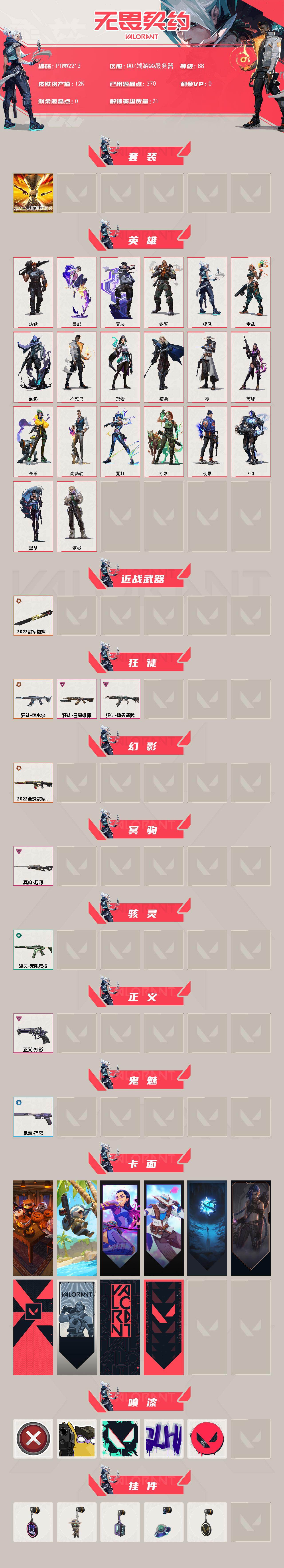 【ptww2213】终极3/卓越4/皮肤13/等级88/段位:未定级/2022全球冠军赛套装/炼狱/暮蝶/壹决/铁臂/捷风/雷兹/幽影/不死鸟/贤者/猎枭/零/芮娜/奇乐/尚勃勒/霓虹/斯凯/夜露/k/o/黑梦/钢锁/近战武器-2022全球冠军赛 蝴蝶刀/狂徒-塑水宗/狂徒-堕天遗武/狂徒-日冕雄师/幻影-2022全球冠军赛/冥驹-起源/骇灵-无限竞技/正义-掠影/鬼魅-宿怨/南瓜盛典 卡面/树懒大作战 卡面/无畏契约go!第一卷:芮娜 卡面/无畏契约go!第一卷:零 卡面/无垠星环 卡面/《双城之战》金克丝 卡面/代号红色 卡面/新兵报到 卡面/v契约 卡面/无畏契约 卡面/买装还是存钱 喷漆/放下武器 喷漆/胜利属于无畏契约 喷漆/glhf 喷漆/无畏契约 喷漆/第九季//第三幕 纪念币 挂饰/无畏契约go!第一卷 零 挂饰/动力机箱 挂饰/天外飞客 挂饰/无畏契约 纪念币 挂饰