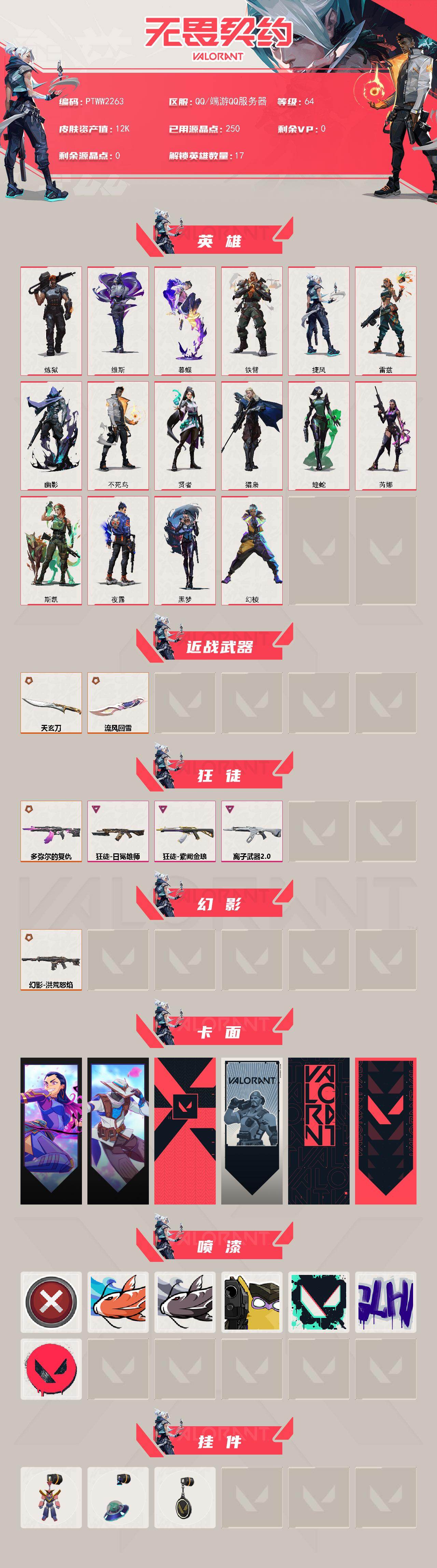 【ptww2263】终极5/卓越3/皮肤19/等级64/段位:黑铁/幻棱/炼狱/维斯/暮蝶/铁臂/捷风/雷兹/幽影/不死鸟/贤者/猎枭/蝰蛇/芮娜/斯凯/夜露/黑梦/近战武器-流风回雪/近战武器-天玄刀/狂徒-多弥尔的复仇/狂徒-日冕雄师/狂徒-紫阙金琅/狂徒-离子武器//2.0/幻影-洪荒怒焰/无畏契约go!第一卷:芮娜 卡面/无畏契约go!第一卷:零 卡面/代号红色 卡面/新兵报到 卡面/v契约 卡面/无畏契约 卡面/买装还是存钱 喷漆/红鳞 喷漆/松叶 喷漆/放下武器 喷漆/胜利属于无畏契约 喷漆/glhf 喷漆/无畏契约 喷漆/迷你机甲 挂饰/天外飞客 挂饰/无畏契约 纪念币 挂饰