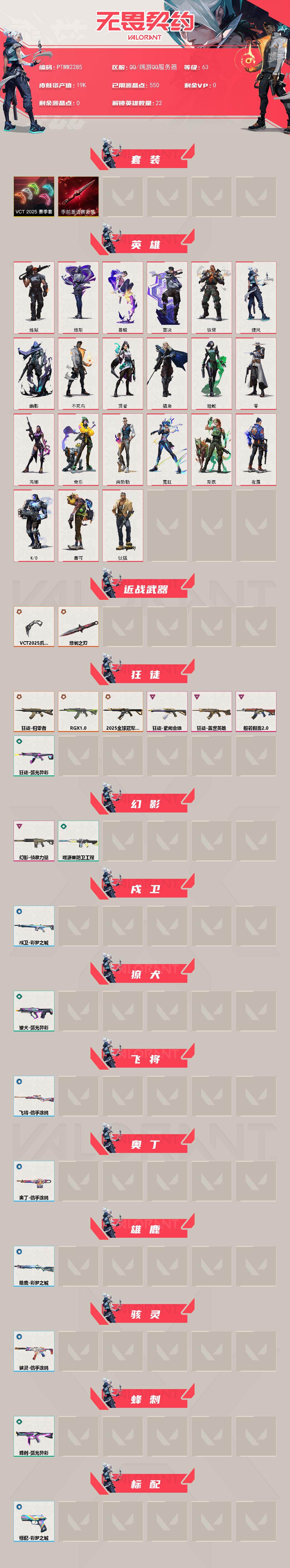 【ptww2285】终极5/传奇1/卓越4/皮肤21/等级63/段位:钻石/无畏契约季前邀请赛套装/vct 2025 赛季套装/炼狱/维斯/暮蝶/钛狐/壹决/铁臂/捷风/幽影/不死鸟/贤者/猎枭/蝰蛇/零/芮娜/奇乐/尚勃勒/霓虹/斯凯/夜露/k/o/盖可/近战武器-无畏契约季前邀请赛 悲悯之刃/近战武器-vct 2025 爪刀/狂徒-2025全球冠军赛/狂徒-归零者/狂徒-rgx 11z pro/狂徒-般若假面//2.0/狂徒-盖世英雄/狂徒-紫阙金琅/狂徒-弧光异彩/幻影-侦察力量/幻影-噬源兽防卫工程/戍卫-彩梦之城/獠犬-弧光异彩/飞将-信手涂鸦/奥丁-信手涂鸦/雄鹿-彩梦之城/骇灵-信手涂鸦/蜂刺-弧光异彩/标配-彩梦之城/鬼魅-超时空卫队/鬼魅-信手涂鸦/《双城之战》拥抱 卡面/欢迎来到底城 卡面/南瓜盛典 卡面/clutch 卡面/零点嗅探设计图 卡面/无畏契约go!第一卷:芮娜 卡面/清除名单 卡面/无畏契约go!第一卷:零 卡面/无垠星环 卡面/暗呛 卡面/钢锁vs盖可 卡面/铁臂设计图 卡面/代号红色 卡面/冰淇淋店 卡面/新兵报到 卡面/友军火力 卡面/v契约 卡面/无畏契约 卡面/嘭! 喷漆/都算到了 喷漆/控场勿近 喷漆/我的刀呢? 喷漆/新潮流 喷漆/买装还是存钱 喷漆/口袋贤者 喷漆/胜利属于无畏契约 喷漆/glhf 喷漆/无畏契约 喷漆/《双城之战》小蛋糕 挂饰/第九季//第三幕 纪念币 挂饰/鱼骨头 挂饰/第八季//第三幕 纪念币 挂饰/第八季//第二幕 纪念币 挂饰 /天外飞客 挂饰/好运福爪 挂饰/第八季//第一幕 纪念币 挂饰/第七季//第三幕 纪念币 挂饰/幸运中国结 挂饰/第七季//第二幕 纪念币 挂饰/无畏契约 纪念币 挂饰