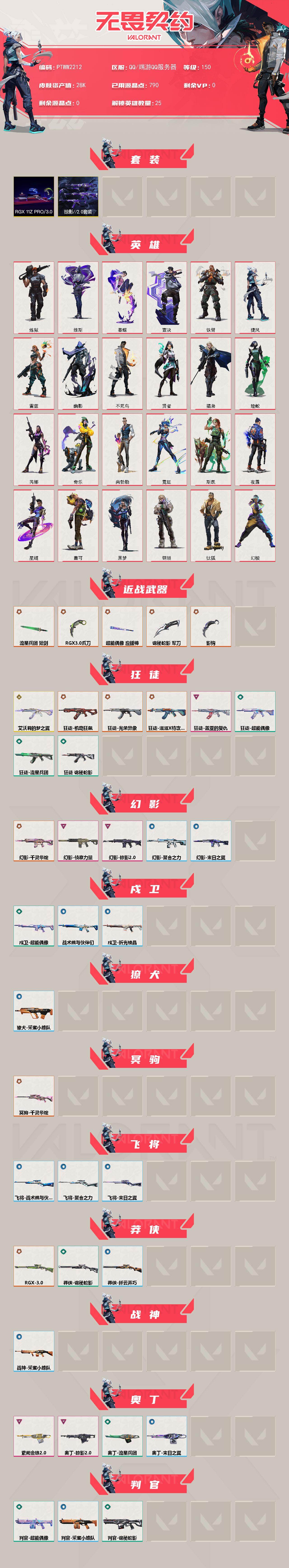 【ptww2212】终极12/传奇1/卓越7/皮肤59/等级150/段位:铂金/rgx 11z pro//3.0套装/掠影//2.0套装/幻棱/炼狱/维斯/暮蝶/钛狐/壹决/铁臂/捷风/雷兹/幽影/不死鸟/贤者/猎枭/蝰蛇/芮娜/奇乐/尚勃勒/霓虹/斯凯/夜露/星礈/盖可/黑梦/钢锁/近战武器-影钩/近战武器-rgx 11z pro//3.0 爪刀/近战武器-流星兵团 短剑/近战武器-超能偶像 应援棒/近战武器-诡秘蛇影 军刀/狂徒-艾沃莉的梦之翼/狂徒-机动狂飙/狂徒-光荣异象/狂徒-滋滋x特攻队/狂徒-盖亚的复仇/狂徒-超能偶像/狂徒-流星兵团/狂徒-诡秘蛇影/幻影-千灵华绽/幻影-侦察力量/幻影-掠影//2.0/幻影-聚合之力/幻影-末日之翼/戍卫-超能偶像/戍卫-战术熊与伙伴们/戍卫-折光棱晶/獠犬-采蜜小蜂队/冥驹-千灵华绽/飞将-聚合之力/飞将-战术熊与伙伴们/飞将-末日之翼/莽侠-rgx 11z pro//3.0/莽侠-诡秘蛇影/莽侠-纤云弄巧/战神-采蜜小蜂队/奥丁-紫阙金琅//2.0/奥丁-掠影//2.0/奥丁-流星兵团/奥丁-末日之翼/判官-超能偶像/判官-诡秘蛇影/判官-采蜜小蜂队/骇灵-掠影//2.0/骇灵-流星兵团/蜂刺-聚合之力/蜂刺-纤云弄巧/蜂刺-折光棱晶/标配-超能偶像/标配-战术熊与伙伴们/标配-折光棱晶/正义-rgx 11z pro//3.0/正义-纤云弄巧/鬼魅-掠影//2.0/鬼魅-流星兵团/鬼魅-诡秘蛇影/鬼魅-采蜜小蜂队/鬼魅-星云暗涌/狂怒-聚合之力/狂怒-战术熊与伙伴们/短炮-纤云弄巧/短炮-末日之翼/南瓜盛典 卡面/修车达人 卡面/正义的化身 卡面/终章:生意人麦宝 卡面/铁之华 卡面/失而复得 卡面/时间到 卡面/最高舞台 卡面/复活专家 卡面/归乡 // 蝰蛇 卡面/rgx 11z pro//3.0 卡面/超能偶像 卡面/生意人麦宝 卡面/声感陷阱设计图 卡面/钢锁工牌 卡面/战术小伙伴的夏日 卡面/采蜜小蜂队 卡面/聚合之力 卡面/梦幻奶茶 卡面/终章:打造专属狂徒 卡面/趁热吃 卡面/西装暴徒 卡面/失控边缘 卡面/哨卫者之领域 卡面/暮蝶工牌 卡面/战术熊与伙伴们 卡面/源能反应 卡面/流星兵团 卡面/纤云弄巧 卡面/暂别喧嚣 卡面/打造专属狂徒 卡面/零点嗅探设计图 卡面/沙雕爆能器 卡面/无畏契约go!第一卷:芮娜 卡面/清除名单 卡面/无畏契约go!第一卷:零 卡面/代号红色 卡面/新兵报到 卡面/v契约 卡面/无畏契约 卡面/控场勿近 喷漆/熊抱 喷漆/又被闪了 喷漆/终极羞辱 喷漆/超级粉丝 喷漆/黯兽卖萌 喷漆/捷风差距 喷漆/惊声尖叫 喷漆/2021冠军巡回赛花火 喷漆/五人成星 喷漆/超能偶像 喷漆/rgx 11z pro//3.0 喷漆/放我出去 喷漆/掩护我 喷漆/大佬发呛 喷漆/边缘试探 喷漆/拼一呛 喷漆/聚合之力 喷漆/采蜜小蜂队 喷漆/梦幻小队 喷漆/五个全都齐了 喷漆/加油!加油! 喷漆/开心到爆炸 喷漆/皮蛋萌舞 喷漆/我觉得不行 喷漆/头号粉丝 喷漆/吸一口快乐 喷漆/永远的答案 喷漆/再来一次? 喷漆/别挡我的路! 喷漆/我的刀呢? 喷漆/当然可以 喷漆/流星兵团 喷漆/战术熊与伙伴们 喷漆/禁止喷漆 喷漆/纤云弄巧 喷漆/新潮流 喷漆/双击点赞 喷漆/买装还是存钱 喷漆/凌空惊吓 喷漆/电烫 喷漆/胜利属于无畏契约 喷漆/glhf 喷漆/无畏契约 喷漆/v25第六幕:超凡 挂饰/第九季//第三幕 纪念币 挂饰/熔岩灯 挂饰/第九季//第二幕 纪念币 挂饰/终章:这瓜保熟 挂饰/炼狱雪糕 挂饰/糖葫芦 挂饰/袖珍捷风 挂饰/冲上云霄 挂饰/超能偶像 挂饰/rgx 11z pro//3.0 挂饰/迷你浓缩 挂饰/这瓜保熟 挂饰/采蜜小蜂队 挂饰/第九季//第一幕 纪念币 挂饰/聚合之力 挂饰/终章:迷你机甲 挂饰/犯困的布鲁诺 挂饰/战术河童 挂饰/招财猫熊 挂饰/迷你机甲 挂饰/荧光棒 挂饰/章鱼烧先生 挂饰/流星兵团 挂饰/云开见日 挂饰/第八季//第三幕 纪念币 挂饰/第八季//第二幕 纪念币 挂饰 /天外飞客 挂饰/无畏契约 纪念币 挂饰