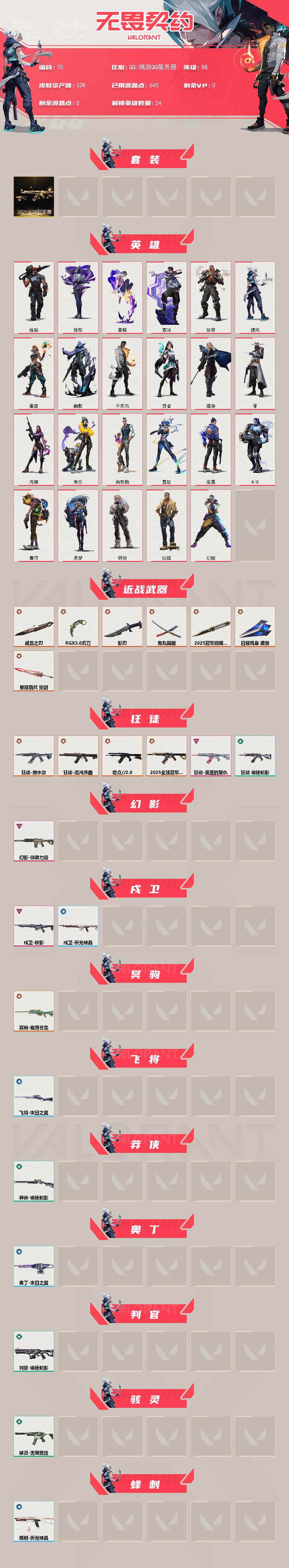 【70】【套装】:2025全球冠军赛套装 【英雄】:幻棱,炼狱,维斯,暮蝶,钛狐,壹决,铁臂,捷风,雷兹,幽影,不死鸟,贤者,猎枭,零,芮娜,奇乐,尚勃勒,霓虹,夜露,k/o,盖可,黑梦,钢锁 【近战武器】:近战武器-2025全球冠军赛 蝴蝶刀,近战武器-rgx 11z pro//3.0 爪刀,近战武器-威龙之刃,近战武器-鬼丸国纲,近战武器-影刃,近战武器-日耀风暴 遗器,近战武器-星际猎兵 短剑 【狂徒】:狂徒-2025全球冠军赛,狂徒-混沌序曲,狂徒-奇点//2.0,狂徒-塑水宗,狂徒-盖亚的复仇,狂徒-诡秘蛇影 【幻影】:幻影-侦察力量 【戍卫】:戍卫-掠影,戍卫-折光棱晶 【冥驹】:冥驹-偃月苍龙 【飞将】:飞将-末日之翼 【莽侠】:莽侠-诡秘蛇影 【奥丁】:奥丁-末日之翼 【判官】:判官-诡秘蛇影 【骇灵】:骇灵-无限竞技 【蜂刺】:蜂刺-折光棱晶 【标配】:标配-折光棱晶 【正义】:正义-塑水宗 【鬼魅】:鬼魅-超时空卫队 【短炮】:短炮-末日之翼 【卡面】:南瓜盛典 卡面,音熊登场 卡面,树懒大作战 卡面,红鳞松叶 卡面,失控边缘 卡面,无畏契约go!第一卷:芮娜 卡面,无畏契约go!第一卷:零 卡面,《双城之战》金克丝 卡面,没有什么能逃过我的眼睛 卡面,暗呛 卡面,无畏契约go!第一卷:贤者 卡面,代号红色 卡面,新兵报到 卡面,v契约 卡面,无畏契约 卡面 【喷漆】:霓光四射 喷漆,买装还是存钱 喷漆,酷熊冲浪 喷漆,无畏契约go!第一卷:芮娜 喷漆,胜利属于无畏契约 喷漆,glhf 喷漆,无畏契约 喷漆 【挂饰】:第九季//第三幕 纪念币 挂饰,天外飞客 挂饰,《双城之战》魄罗 挂饰,无畏契约 纪念币 挂饰