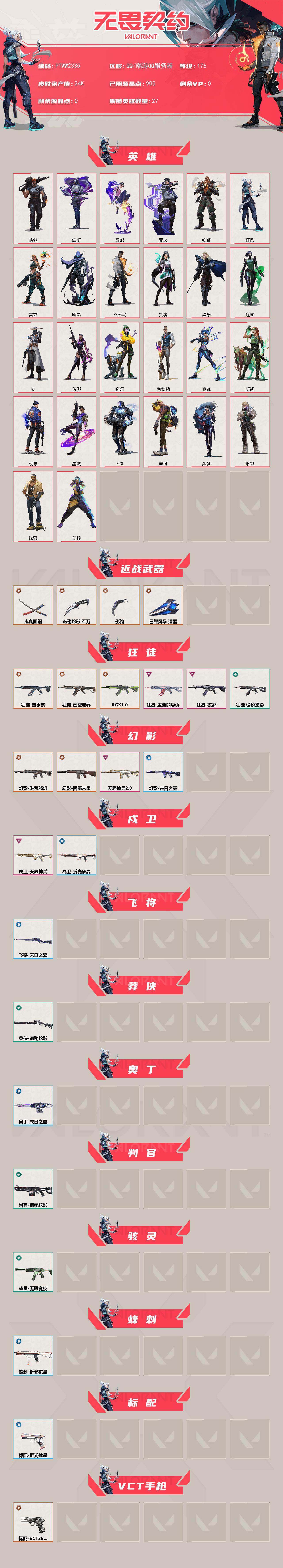 【ptww2335】终极11/卓越5/皮肤47/等级176/段位:白银/幻棱/炼狱/维斯/暮蝶/钛狐/壹决/铁臂/捷风/雷兹/幽影/不死鸟/贤者/猎枭/蝰蛇/零/芮娜/奇乐/尚勃勒/霓虹/斯凯/夜露/星礈/k/o/盖可/黑梦/钢锁/近战武器-影钩/近战武器-鬼丸国纲/近战武器-诡秘蛇影 军刀/近战武器-日耀风暴 遗器/狂徒-塑水宗/狂徒-虚空遗器/狂徒-rgx 11z pro/狂徒-掠影/狂徒-盖亚的复仇/狂徒-诡秘蛇影/幻影-洪荒怒焰/幻影-西部未来/幻影-天界神兵//2.0/幻影-末日之翼/戍卫-天界神兵/戍卫-折光棱晶/飞将-末日之翼/莽侠-诡秘蛇影/奥丁-末日之翼/判官-诡秘蛇影/骇灵-无限竞技/蜂刺-折光棱晶/标配-折光棱晶/标配-vct25 x ts/正义-西部未来/正义-纳米打击/正义-游戏结束/鬼魅-天界神兵/鬼魅-诡秘蛇影/鬼魅-星云暗涌/短炮-梦魇恶魔/短炮-末日之翼/进入射程 卡面/《双城之战》拥抱 卡面/精灵大战 卡面/欢迎来到底城 卡面/南瓜盛典 卡面/修车达人 卡面/正义的化身 卡面/时间到 卡面/最高舞台 卡面/声感陷阱设计图 卡面/红鳞松叶 卡面/clutch 卡面/梦幻奶茶 卡面/无畏契约:尚勃勒 卡面/零点嗅探设计图 卡面/无畏契约go!第一卷:芮娜 卡面/无畏契约go!第一卷:零 卡面/暗呛 卡面/无畏契约go!第一卷:贤者 卡面/钢锁vs盖可 卡面/别冒尖 卡面/夯实根基 卡面/"luie" 卡面/热烈欢迎 卡面/铁臂设计图 卡面/代号红色 卡面/冰淇淋店 卡面/新兵报到 卡面/友军火力 卡面/v契约 卡面/无畏契约 卡面/暗潮 卡面/嗨宝南瓜灯 喷漆/嘭! 喷漆/都算到了 喷漆/控场勿近 喷漆/熊抱 喷漆/又被闪了 喷漆/超级粉丝 喷漆/捷风差距 喷漆/审判之爪 喷漆/拼一呛 喷漆/分身有术 喷漆/致命优雅 喷漆/买装还是存钱 喷漆/醒狮贺春 喷漆/关门放狗 喷漆/酷熊冲浪 喷漆/无畏契约go!第一卷:芮娜 喷漆/红鳞 喷漆/无畏契约go!第一卷:贤者 喷漆/暴走萝莉 喷漆/松叶 喷漆/放下武器 喷漆/老铁困了 喷漆/口袋贤者 喷漆/胜利属于无畏契约 喷漆/glhf 喷漆/无畏契约 喷漆/终章:猫猫木乃伊 挂饰/悠闲鸡块 挂饰/伞绳 挂饰/第九季//第三幕 纪念币 挂饰/熔岩灯 挂饰/第九季//第二幕 纪念币 挂饰/薰衣草之心 挂饰/袖珍捷风 挂饰/超能偶像 挂饰/第九季//第一幕 纪念币 挂饰/有事联系 挂饰/天外飞客 挂饰/好运福爪 挂饰/《双城之战》魄罗 挂饰/第八季//第一幕 纪念币 挂饰/第七季:青铜 挂饰/冬日絮语 挂饰/海豹的认可 挂饰/第七季//第三幕 纪念币 挂饰/幸运中国结 挂饰/第七季//第二幕 纪念币 挂饰/无畏契约 纪念币 挂饰