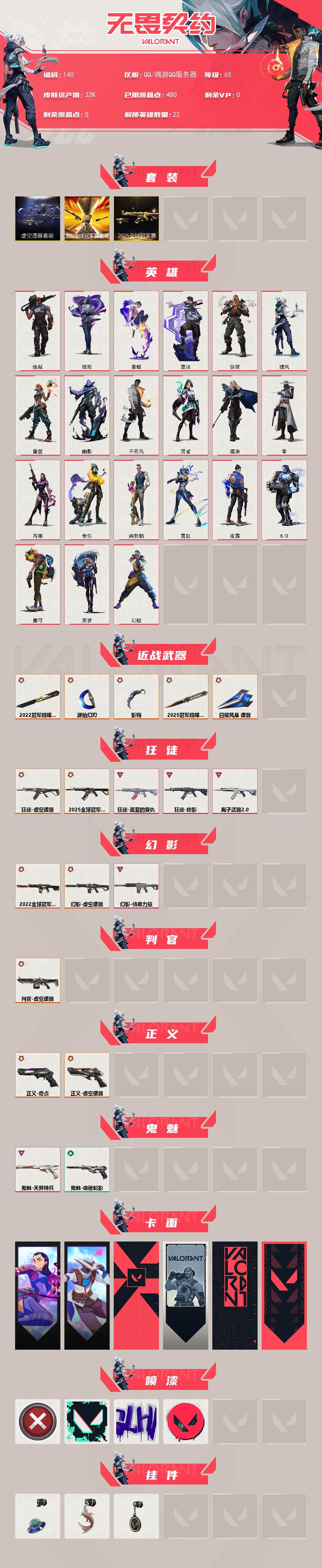 【140】【套装】:2025全球冠军赛套装,2022全球冠军赛套装,虚空遗器套装 【英雄】:幻棱,炼狱,维斯,暮蝶,壹决,铁臂,捷风,雷兹,幽影,不死鸟,贤者,猎枭,零,芮娜,奇乐,尚勃勒,霓虹,夜露,k/o,盖可,黑梦 【近战武器】:近战武器-2025全球冠军赛 蝴蝶刀,近战武器-2022全球冠军赛 蝴蝶刀,近战武器-影钩,近战武器-源始幻刃,近战武器-日耀风暴 遗器 【狂徒】:狂徒-2025全球冠军赛,狂徒-虚空遗器,狂徒-掠影,狂徒-盖亚的复仇,狂徒-离子武器//2.0 【幻影】:幻影-2022全球冠军赛,幻影-虚空遗器,幻影-侦察力量 【判官】:判官-虚空遗器 【正义】:正义-奇点,正义-虚空遗器 【鬼魅】:鬼魅-天界神兵,鬼魅-诡秘蛇影 【卡面】:无畏契约go!第一卷:芮娜 卡面,无畏契约go!第一卷:零 卡面,代号红色 卡面,新兵报到 卡面,v契约 卡面,无畏契约 卡面 【喷漆】:买装还是存钱 喷漆,胜利属于无畏契约 喷漆,glhf 喷漆,无畏契约 喷漆 【挂饰】:天外飞客 挂饰,红鳞松叶 挂饰,无畏契约 纪念币 挂饰