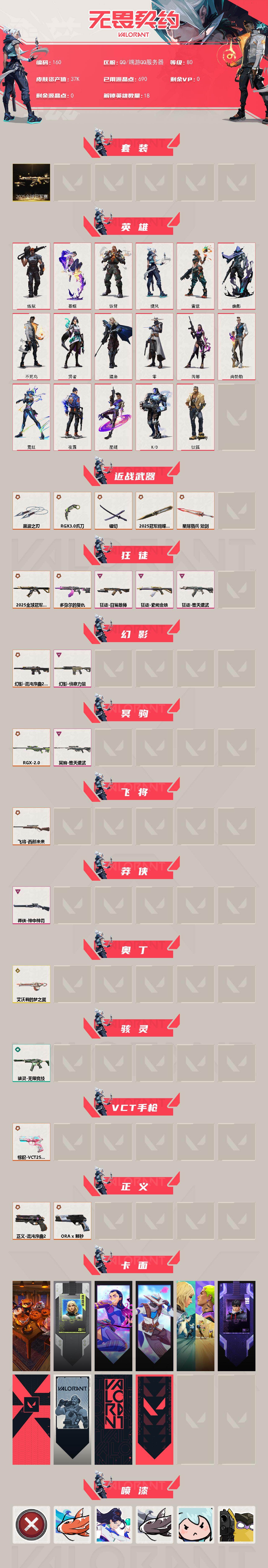 【160】【套装】:2025全球冠军赛套装 【英雄】:炼狱,暮蝶,钛狐,铁臂,捷风,雷兹,幽影,不死鸟,贤者,猎枭,零,芮娜,尚勃勒,霓虹,夜露,星礈,k/o 【近战武器】:近战武器-2025全球冠军赛 蝴蝶刀,近战武器-rgx 11z pro//3.0 爪刀,近战武器-黑波之刃,近战武器-镭切,近战武器-星际猎兵 短剑 【狂徒】:狂徒-2025全球冠军赛,狂徒-多弥尔的复仇,狂徒-堕天遗武,狂徒-日冕雄师,狂徒-紫阙金琅 【幻影】:幻影-混沌序曲//2.0,幻影-侦察力量 【冥驹】:冥驹-rgx 11z pro//2.0,冥驹-堕天遗武 【飞将】:飞将-西部未来 【莽侠】:莽侠-神中神罚 【奥丁】:奥丁-艾沃莉的梦之翼 【骇灵】:骇灵-无限竞技 【vct手呛】:标配-vct25 x blg 【正义】:正义-混沌序曲//2.0,正义-a x 颗秒 【卡面】:南瓜盛典 卡面,钢锁工牌 卡面,无畏契约go!第一卷:芮娜 卡面,无畏契约go!第一卷:零 卡面,钢锁vs盖可 卡面,壹决工牌 卡面,代号红色 卡面,新兵报到 卡面,v契约 卡面,无畏契约 卡面 【喷漆】:买装还是存钱 喷漆,红鳞 喷漆,无畏契约go!第一卷:贤者 喷漆,松叶 喷漆,飓刃涂鸦 喷漆 ,放下武器 喷漆,胜利属于无畏契约 喷漆,glhf 喷漆,无畏契约 喷漆 【挂饰】:第九季//第三幕 纪念币 挂饰,天外飞客 挂饰,《双城之战》魄罗 挂饰,无畏契约 纪念币 挂饰