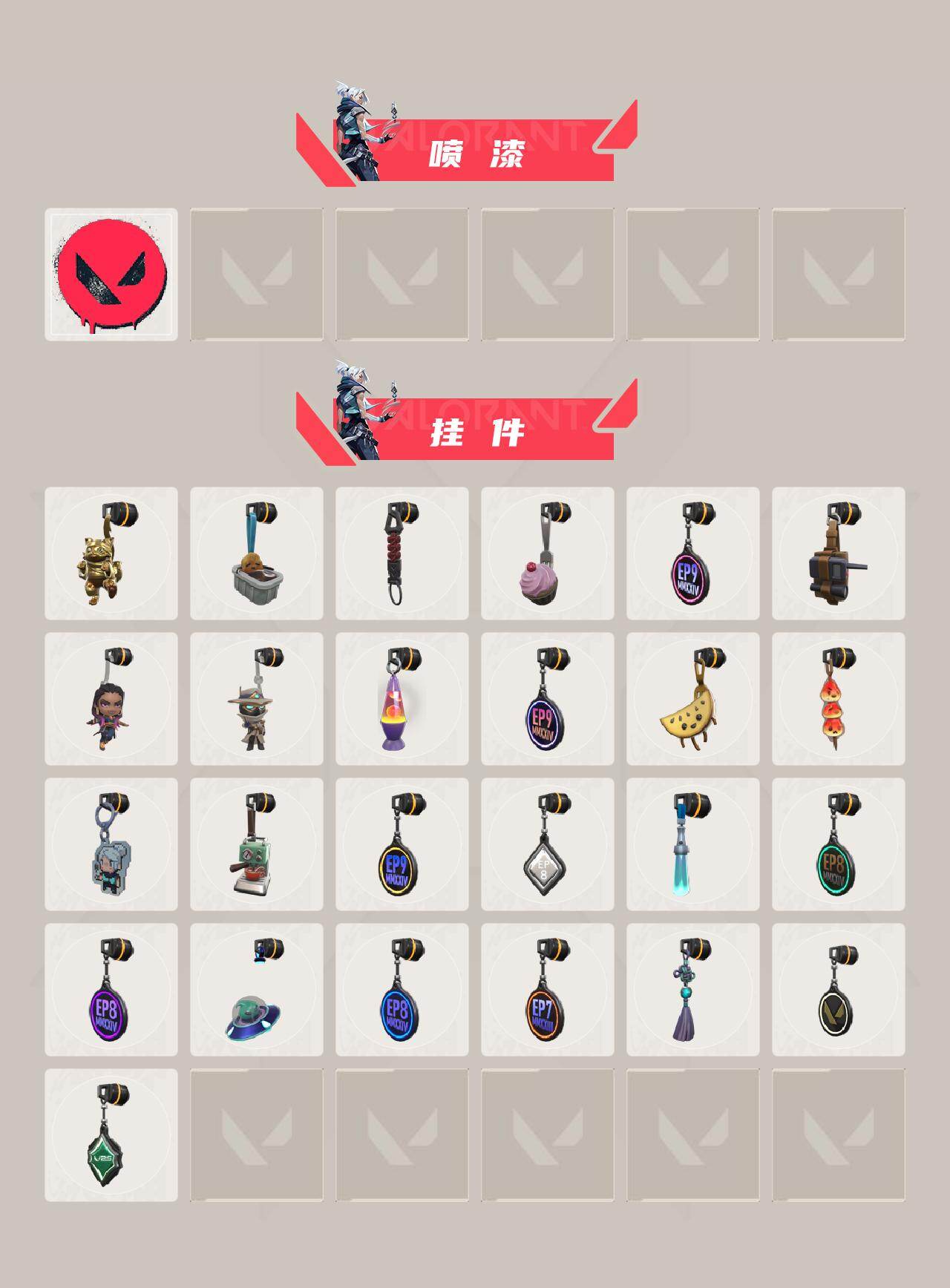 【105】【英雄】:幻棱,炼狱,维斯,暮蝶,钛狐,壹决,铁臂,捷风,雷兹,幽影,不死鸟,贤者,猎枭,蝰蛇,零,芮娜,奇乐,尚勃勒,霓虹,斯凯,夜露,星礈,k/o,海神,盖可,黑梦,钢锁 【近战武器】:近战武器-穿花蝴蝶,近战武器-紫金爪刀,近战武器-鬼丸国纲,近战武器-琉璃锻梦剑,近战武器-生物分子解离器,近战武器-影刃,近战武器-诡秘蛇影 军刀,近战武器-神圣领域 战刀,近战武器-日耀风暴 遗器 【狂徒】:狂徒-混沌序曲,狂徒-全息波普//2.0,狂徒-创·纪元,狂徒-rgx 11z pro,狂徒-千灵华绽//2.0,狂徒-掠影,狂徒-盖世英雄,狂徒-盖亚的复仇,狂徒-耀鳞威龙,狂徒-诡秘蛇影 【幻影】:幻影-西部未来,幻影-离子武器,幻影-侦察力量,幻影-神圣领域,幻影-末日之翼,幻影-西部未来 【戍卫】:戍卫-月球哨兵,戍卫-折光棱晶 【獠犬】:獠犬-神圣领域 【冥驹】:冥驹-离子武器,冥驹-星云暗涌 【飞将】:飞将-末日之翼 【莽侠】:莽侠-诡秘蛇影,莽侠-月球哨兵 【战神】:战神-神圣领域 【奥丁】:奥丁-末日之翼 【判官】:判官-诡秘蛇影 【雄鹿】:雄鹿-月球哨兵 【骇灵】:骇灵-星云暗涌 【蜂刺】:蜂刺-星云暗涌,蜂刺-折光棱晶 【标配】:标配-超能偶像,标配-折光棱晶 【正义】:正义-奇点,正义-西部未来,正义-超限闪存,正义-纳米打击,正义-月球哨兵 【鬼魅】:鬼魅-超时空卫队,鬼魅-诡秘蛇影,鬼魅-星云暗涌 【狂怒】:狂怒-神圣领域 【短炮】:短炮-末日之翼 【卡面】:终章:激斗汉堡 卡面,进入射程 卡面,《双城之战》拥抱 卡面,精灵大战 卡面,欢迎来到底城 卡面,南瓜盛典 卡面,修车达人 卡面,正义的化身 卡面,终章:生意人麦宝 卡面,铁之华 卡面,时间到 卡面,最高舞台 卡面,声感陷阱设计图 卡面,梦幻奶茶 卡面,源能反应 卡面,零点嗅探设计图 卡面,沙雕爆能器 卡面,无畏契约go!第一卷:芮娜 卡面,清除名单 卡面,无畏契约go!第一卷:零 卡面,暗呛 卡面,"luie" 卡面,铁臂设计图 卡面,代号红色 卡面,冰淇淋店 卡面,新兵报到 卡面,v契约 卡面,无畏契约 卡面 【喷漆】:嗨宝南瓜灯 喷漆,嘭! 喷漆,都算到了 喷漆,控场勿近 喷漆,小丑猫 喷漆,熊抱 喷漆,蛋糕还是爆能器? 喷漆,超级粉丝 喷漆,捷风差距 喷漆,惊声尖叫 喷漆,拼一呛 喷漆,我的刀呢? 喷漆,双击点赞 喷漆,买装还是存钱 喷漆,老铁困了 喷漆,口袋贤者 喷漆,胜利属于无畏契约 喷漆,glhf 喷漆,无畏契约 喷漆 【挂饰】:v25第六幕:超凡 挂饰,v25第三幕:超凡 挂饰,终章:猫猫木乃伊 挂饰,悠闲鸡块 挂饰,伞绳 挂饰,《双城之战》小蛋糕 挂饰,第九季//第三幕 纪念币 挂饰,工具腰带 挂饰,无畏契约go!第一卷 芮娜 挂饰,无畏契约go!第一卷 零 挂饰,熔岩灯 挂饰,第九季//第二幕 纪念币 挂饰,终章:这瓜保熟 挂饰,糖葫芦 挂饰,袖珍捷风 挂饰,迷你浓缩 挂饰,第九季//第一幕 纪念币 挂饰,第八季:白银 挂饰,荧光棒 挂饰,第八季//第三幕 纪念币 挂饰,第八季//第二幕 纪念币 挂饰 ,天外飞客 挂饰,第八季//第一幕 纪念币 挂饰,第七季//第三幕 纪念币 挂饰,幸运中国结 挂饰,无畏契约 纪念币 挂饰