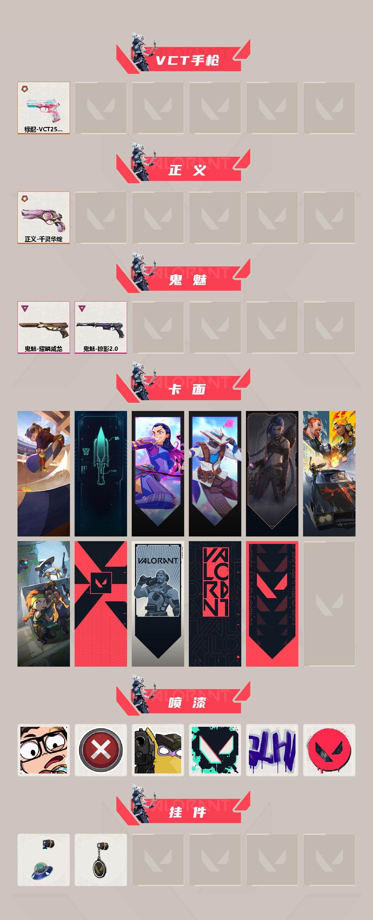 【126】【套装】:2025全球冠军赛套装,2022全球冠军赛套装,掠影//2.0套装 【英雄】:幻棱,炼狱,维斯,暮蝶,钛狐,壹决,铁臂,捷风,雷兹,幽影,不死鸟,贤者,猎枭,蝰蛇,零,芮娜,奇乐,尚勃勒,霓虹,斯凯,夜露,星礈,k/o,海神,盖可,黑梦,钢锁 【近战武器】:近战武器-2025全球冠军赛 蝴蝶刀,近战武器-2022全球冠军赛 蝴蝶刀,近战武器-a x 颗秒 军刀,近战武器-影钩,近战武器-日耀风暴 遗器,近战武器-阿特拉斯指挥部 甩棍,近战武器-星际猎兵 短剑 【狂徒】:狂徒-2025全球冠军赛,狂徒-虚空遗器,狂徒-光荣异象,狂徒-多弥尔的复仇,狂徒-紫阙金琅 【幻影】:幻影-2022全球冠军赛,幻影-侦察力量,幻影-掠影//2.0 【戍卫】:戍卫-天界神兵 【獠犬】:獠犬-混沌序曲//2.0 【冥驹】:冥驹-堕天遗武 【飞将】:飞将-塑水宗 【莽侠】:莽侠-神中神罚 【奥丁】:奥丁-掠影//2.0 【骇灵】:骇灵-掠影//2.0 【vct手呛】:标配-vct25 x blg 【正义】:正义-千灵华绽 【鬼魅】:鬼魅-耀鳞威龙,鬼魅-掠影//2.0 【卡面】:clutch 卡面,零点嗅探设计图 卡面,无畏契约go!第一卷:芮娜 卡面,无畏契约go!第一卷:零 卡面,《双城之战》金克丝 卡面,铁臂vs雷兹 卡面,别冒尖 卡面,代号红色 卡面,新兵报到 卡面,v契约 卡面,无畏契约 卡面 【喷漆】:新潮流 喷漆,买装还是存钱 喷漆,放下武器 喷漆,胜利属于无畏契约 喷漆,glhf 喷漆,无畏契约 喷漆 【挂饰】:天外飞客 挂饰,无畏契约 纪念币 挂饰