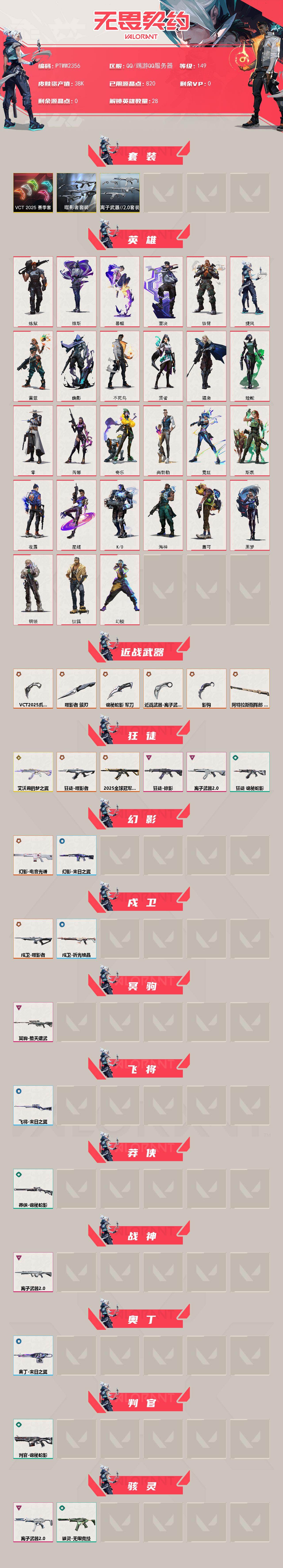 【ptww2356】终极14/传奇1/卓越7/皮肤50/等级149/段位:铂金/噬影者套装/vct 2025 赛季套装/离子武器//2.0套装/幻棱/炼狱/维斯/暮蝶/钛狐/壹决/铁臂/捷风/雷兹/幽影/不死鸟/贤者/猎枭/蝰蛇/零/芮娜/奇乐/尚勃勒/霓虹/斯凯/夜露/星礈/k/o/海神/盖可/黑梦/钢锁/近战武器-影钩/近战武器-vct 2025 爪刀/近战武器-噬影者 簇刃/近战武器-离子武器//2.0 爪刀/近战武器-诡秘蛇影 军刀/近战武器-阿特拉斯指挥部 甩棍/狂徒-艾沃莉的梦之翼/狂徒-2025全球冠军赛/狂徒-噬影者/狂徒-掠影/狂徒-离子武器//2.0/狂徒-诡秘蛇影/幻影-电音光谱/幻影-末日之翼/戍卫-噬影者/戍卫-折光棱晶/冥驹-堕天遗武/飞将-末日之翼/莽侠-诡秘蛇影/战神-离子武器//2.0/奥丁-末日之翼/判官-诡秘蛇影/骇灵-离子武器//2.0/骇灵-无限竞技/蜂刺-噬影者/蜂刺-折光棱晶/标配-折光棱晶/标配-vct25 x ts/正义-奇点/正义-离子武器/正义-纳米打击/鬼魅-噬影者/鬼魅-诡秘蛇影/鬼魅-星云暗涌/狂怒-离子武器//2.0/短炮-末日之翼/终章:激斗汉堡 卡面/进入射程 卡面/精灵大战 卡面/南瓜盛典 卡面/无畏契约:暮蝶 卡面/树懒大作战 卡面/无畏契约go!第一卷:芮娜 卡面/无畏契约go!第一卷:零 卡面/化茧成蝶 卡面/无垠星环 卡面/《双城之战》金克丝 卡面/无畏契约go!第一卷:贤者 卡面/壹决工牌 卡面/代号红色 卡面/新兵报到 卡面/v契约 卡面/无畏契约 卡面/嗨宝南瓜灯 喷漆/控场勿近 喷漆/伤心心 喷漆/拼一呛 喷漆/双人比心 喷漆/买装还是存钱 喷漆/请你冷静点 喷漆 /放下武器 喷漆/胜利属于无畏契约 喷漆/glhf 喷漆/无畏契约 喷漆/v25第三幕:超凡 挂饰/终章:猫猫木乃伊 挂饰/悠闲鸡块 挂饰/伞绳 挂饰/第九季//第三幕 纪念币 挂饰/瞬云履 挂饰/超能偶像 挂饰/z世代特饮 挂饰/动力机箱 挂饰/天外飞客 挂饰/红鳞松叶 挂饰/无畏契约 纪念币 挂饰