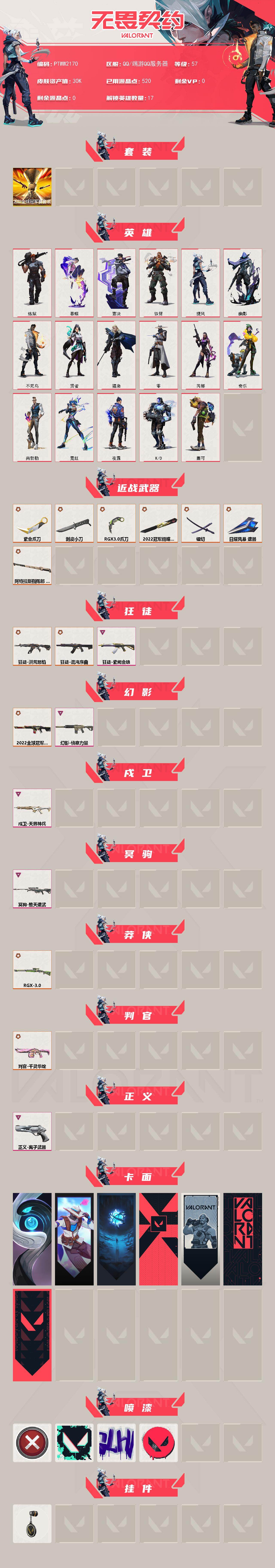 【ptww2170】【套装】:2022全球冠军赛套装 【英雄】:炼狱,暮蝶,壹决,铁臂,捷风,幽影,不死鸟,贤者,猎枭,零,芮娜,奇乐,尚勃勒,霓虹,夜露,k/o,盖可 【近战武器】:近战武器-2022全球冠军赛 蝴蝶刀,近战武器-剥皮小刀,近战武器-紫金爪刀,近战武器-rgx 11z pro//3.0 爪刀,近战武器-镭切,近战武器-日耀风暴 遗器,近战武器-阿特拉斯指挥部 甩棍 【狂徒】:狂徒-洪荒怒焰,狂徒-混沌序曲,狂徒-紫阙金琅 【幻影】:幻影-2022全球冠军赛,幻影-侦察力量 【戍卫】:戍卫-天界神兵 【冥驹】:冥驹-堕天遗武 【莽侠】:莽侠-rgx 11z pro//3.0 【判官】:判官-千灵华绽 【正义】:正义-离子武器 【卡面】:聚合之力 卡面,无畏契约go!第一卷:零 卡面,无垠星环 卡面,代号红色 卡面,新兵报到 卡面,v契约 卡面,无畏契约 卡面 【喷漆】:买装还是存钱 喷漆,胜利属于无畏契约 喷漆,glhf 喷漆,无畏契约 喷漆 【挂饰】:无畏契约 纪念币 挂饰