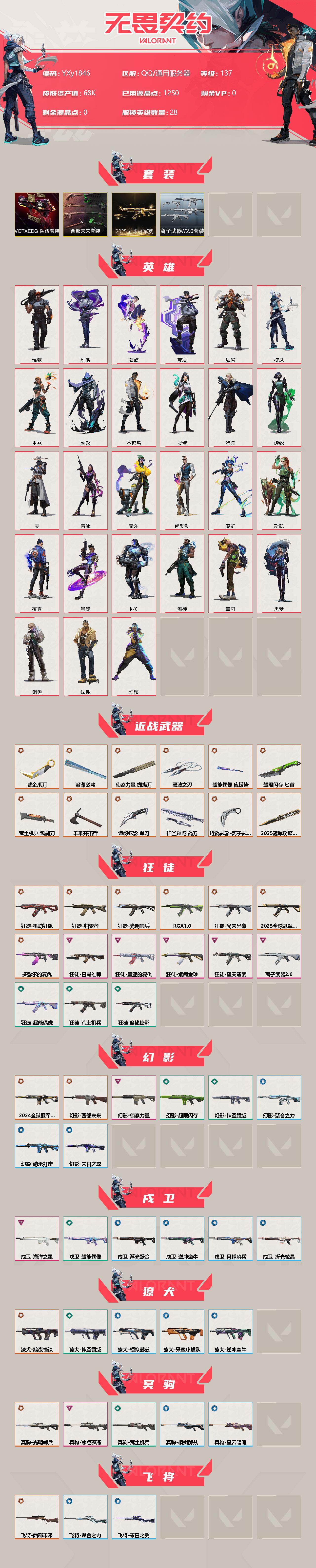【6.8w库存25冠军套.黑波之刃.24冠军幻影.多弥尔.显卡.狮子.盖亚.神话挂饰.】yxy1846【无二次】【因赛季更新游戏段付以上号为准!】 【套装】:2025全球冠军赛套装,西部未来套装,vctxedg 队伍套装,离子武器//2.0套装 【英雄】:幻棱,炼狱,维斯,暮蝶,钛狐,壹决,铁臂,捷风,雷兹,幽影,不死鸟,贤者,猎枭,蝰蛇,零,芮娜,奇乐,尚勃勒,霓虹,斯凯,夜露,星礈,k/o,海神,盖可,黑梦,钢锁 【近战武器】:近战武器-2025全球冠军赛 蝴蝶刀,近战武器-侦察力量 蝴蝶刀,近战武器-紫金爪刀,近战武器-黑波之刃,近战武器-澄湖潋滟,近战武器-离子武器//2.0 爪刀,近战武器-未来开拓者,近战武器-超能偶像 应援棒,近战武器-超限闪存 匕首,近战武器-荒土机兵 热能刀,近战武器-诡秘蛇影 军刀,近战武器-神圣领域 战刀,近战武器-阿特拉斯指挥部 甩棍 【狂徒】:狂徒-2025全球冠军赛,狂徒-光明哨兵,狂徒-归零者,狂徒-机动狂飙,狂徒-rgx 11z pro,狂徒-光荣异象,狂徒-多弥尔的复仇,狂徒-堕天遗武,狂徒-盖亚的复仇,狂徒-日冕雄师,狂徒-紫阙金琅,狂徒-离子武器//2.0,狂徒-超能偶像,狂徒-荒土机兵,狂徒-诡秘蛇影 【幻影】:幻影-2024全球冠军赛,幻影-西部未来,幻影-侦察力量,幻影-超限闪存,幻影-神圣领域,幻影-聚合之力,幻影-纳米打击,幻影-末日之翼,幻影-西部未来 【戍卫】:戍卫-海洋之星,戍卫-超能偶像,戍卫-浮光跃金,戍卫-逆冲蛮牛,戍卫-月球哨兵,戍卫-折光棱晶 【獠犬】:獠犬-黯夜怪谈,獠犬-神圣领域,獠犬-采蜜小蜂队,獠犬-模拟赫兹,獠犬-逆冲蛮牛 【冥驹】:冥驹-光明哨兵,冥驹-冰点凝冻,冥驹-荒土机兵,冥驹-模拟赫兹,冥驹-星云暗涌 【飞将】:飞将-西部未来,飞将-聚合之力,飞将-末日之翼 【莽侠】:莽侠-神中神罚,莽侠-超限闪存,莽侠-诡秘蛇影,莽侠-月球哨兵 【战神】:战神-离子武器//2.0,战神-神圣领域,战神-采蜜小蜂队,战神-浮光跃金 【奥丁】:奥丁-西部未来,奥丁-纳米打击,奥丁-末日之翼 【判官】:判官-超能偶像,判官-诡秘蛇影,判官-采蜜小蜂队,判官-纳米打击x 【雄鹿】:雄鹿-模拟赫兹,雄鹿-逆冲蛮牛,雄鹿-月球哨兵 【骇灵】:骇灵-塑水宗,骇灵-离子武器//2.0,骇灵-荒土机兵,骇灵-浮光跃金,骇灵-星云暗涌 【蜂刺】:蜂刺-机动狂飙,蜂刺-超限闪存,蜂刺-聚合之力,蜂刺-星云暗涌,蜂刺-折光棱晶 【标配】:标配-超能偶像,标配-荒土机兵,标配-浮光跃金,标配-折光棱晶 【vct手呛】:标配-vct x edg 【正义】:正义-创·纪元,正义-西部未来,正义-超限闪存,正义-纳米打击,正义-月球哨兵 【鬼魅】:鬼魅-耀鳞威龙,鬼魅-诡秘蛇影,鬼魅-采蜜小蜂队,鬼魅-缄默者,鬼魅-模拟赫兹,鬼魅-星云暗涌 【狂怒】:狂怒-离子武器//2.0,狂怒-神圣领域,狂怒-聚合之力,狂怒-逆冲蛮牛 【短炮】:短炮-海洋之星,短炮-末日之翼 【卡面】:终章:激斗汉堡 卡面,进入射程 卡面,分崩离析 卡面,纳米打击 卡面,抑制技术 卡面,激斗汉堡 卡面,瓦娃脸雪糕 p2 卡面,从黄昏到黎明 卡面,荒土机兵 卡面,银弹猎手 卡面,逆冲蛮牛 卡面,《双城之战》拥抱 卡面,精灵大战 卡面,欢迎来到底城 卡面,南瓜盛典 卡面,vct cn首冠 卡面,唱片的故事 卡面,钢弓与箭弦 卡面,排除故障 卡面,战术桌游 卡面,悠享食光 卡面,修车达人 卡面,热舞环节 卡面,模拟赫兹 卡面,浮光跃金 卡面,超限闪存 卡面,维斯工牌 卡面,正义的化身 卡面,终章:生意人麦宝 卡面,铁之华 卡面,失而复得 卡面,时间到 卡面,最高舞台 卡面,复活专家 卡面,归乡 // 蝰蛇 卡面,超能偶像 卡面,生意人麦宝 卡面,树懒大作战 卡面,声感陷阱设计图 卡面,钢锁工牌 卡面,战术小伙伴的夏日 卡面,采蜜小蜂队 卡面,聚合之力 卡面,梦幻奶茶 卡面,无畏契约go!第一卷:芮娜 卡面,无畏契约go!第一卷:零 卡面,《双城之战》金克丝 卡面,代号红色 卡面,新兵报到 卡面,v契约 卡面,无畏契约 卡面 【喷漆】:小小心意 喷漆,战“素”兔 喷漆,宇宙的指引 喷漆,请求重启 喷漆,逆冲蛮牛 喷漆,纳米打击 喷漆,鼻尖上的蝴蝶 喷漆,简笔画黯兽 喷漆,独守蝰腹 喷漆,他们将落荒而逃 喷漆,通缉:战术企鹅 喷漆,荒土机兵 喷漆,别挡我吃球! 喷漆,嗨宝南瓜灯 喷漆,嘭! 喷漆,都算到了 喷漆,控场勿近 喷漆,皮蛋呼呼 喷漆,像素星礈 喷漆,图谋不轨的零 喷漆,小丑猫 喷漆,模拟赫兹 喷漆,高丽风情小熊 喷漆,蹲到一个 喷漆,全力集中 喷漆,超限闪存 喷漆,rua一下 喷漆,熊抱 喷漆,蛋糕还是爆能器? 喷漆,高丽风情小虎 喷漆,记在小本本 喷漆,防弹企鹅 喷漆,高丽风情小蛙 喷漆,又被闪了 喷漆,终极羞辱 喷漆,超级粉丝 喷漆,黯兽卖萌 喷漆,捷风差距 喷漆,惊声尖叫 喷漆,2021冠军巡回赛花火 喷漆,五人成星 喷漆,超能偶像 喷漆,放我出去 喷漆,掩护我 喷漆,大佬发呛 喷漆,边缘试探 喷漆,拼一呛 喷漆,聚合之力 喷漆,采蜜小蜂队 喷漆,梦幻小队 喷漆,五个全都齐了 喷漆,买装还是存钱 喷漆,无畏契约go!第一卷:零 喷漆,放下武器 喷漆,胜利属于无畏契约 喷漆,glhf 喷漆,无畏契约 喷漆 【挂饰】:v25第三幕:神话 挂饰,终章:猫猫木乃伊 挂饰,荒土机兵 挂饰,悠闲鸡块 挂饰,猫猫木乃伊 挂饰,水壶 挂饰,纳米打击 挂饰,逆冲蛮牛 挂饰,可爱糖糖 挂饰,伞绳 挂饰,《双城之战》小蛋糕 挂饰,第九季//第三幕 纪念币 挂饰,拳击战术熊 挂饰,工具腰带 挂饰,无畏契约go!第一卷 芮娜 挂饰,无畏契约go!第一卷 零 挂饰,暗藏猫腻 挂饰,高丽风情 挂饰,鱼骨头 挂饰,熔岩灯 挂饰,超限闪存 挂