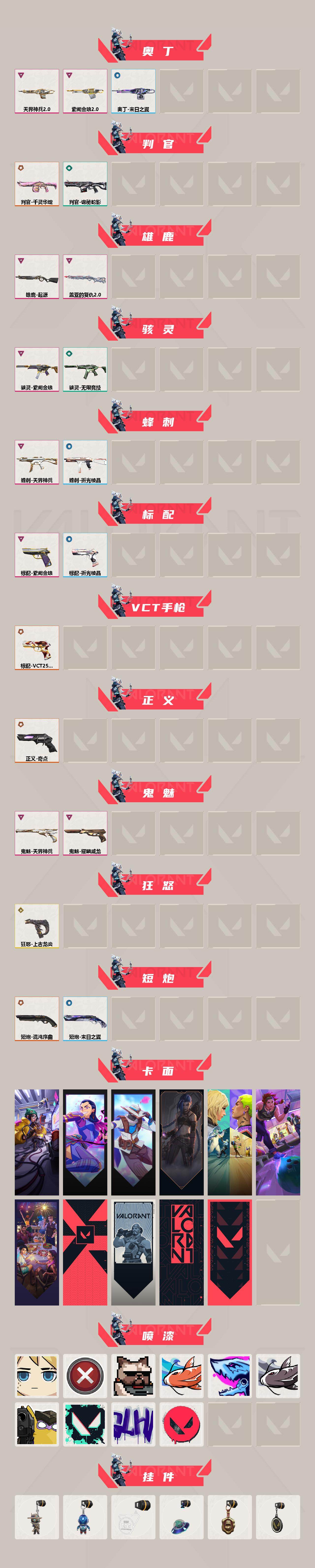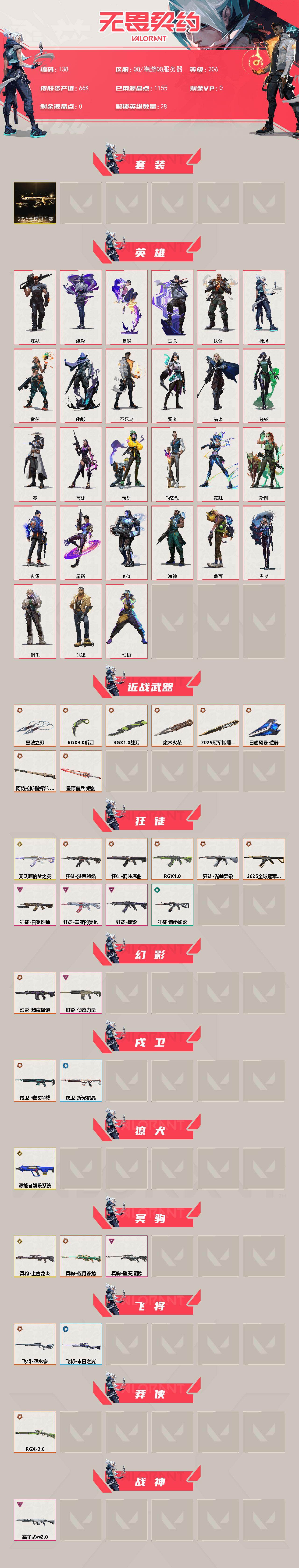 【138】【套装】:2025全球冠军赛套装 【英雄】:幻棱,炼狱,维斯,暮蝶,钛狐,壹决,铁臂,捷风,雷兹,幽影,不死鸟,贤者,猎枭,蝰蛇,零,芮娜,奇乐,尚勃勒,霓虹,斯凯,夜露,星礈,k/o,海神,盖可,黑梦,钢锁 【近战武器】:近战武器-2025全球冠军赛 蝴蝶刀,近战武器-魔术火花,近战武器-rgx 11z pro 战刀,近战武器-rgx 11z pro//3.0 爪刀,近战武器-黑波之刃,近战武器-日耀风暴 遗器,近战武器-阿特拉斯指挥部 甩棍,近战武器-星际猎兵 短剑,近战武器-魔术火花 【狂徒】:狂徒-艾沃莉的梦之翼,狂徒-2025全球冠军赛,狂徒-洪荒怒焰,狂徒-混沌序曲,狂徒-rgx 11z pro,狂徒-光荣异象,狂徒-掠影,狂徒-盖亚的复仇,狂徒-日冕雄师,狂徒-诡秘蛇影 【幻影】:幻影-黯夜怪谈,幻影-侦察力量 【戍卫】:戍卫-破败军械,戍卫-折光棱晶 【獠犬】:獠犬-源能者娱乐系统 【冥驹】:冥驹-上古龙炎,冥驹-偃月苍龙,冥驹-堕天遗武 【飞将】:飞将-塑水宗,飞将-末日之翼 【莽侠】:莽侠-rgx 11z pro//3.0 【战神】:战神-离子武器//2.0 【奥丁】:奥丁-天界神兵//2.0,奥丁-紫阙金琅//2.0,奥丁-末日之翼 【判官】:判官-千灵华绽,判官-诡秘蛇影 【雄鹿】:雄鹿-盖亚的复仇//2.0,雄鹿-起源 【骇灵】:骇灵-紫阙金琅,骇灵-无限竞技 【蜂刺】:蜂刺-天界神兵,蜂刺-折光棱晶 【标配】:标配-紫阙金琅,标配-折光棱晶 【vct手呛】:标配-vct25 x edg 【正义】:正义-奇点 【鬼魅】:鬼魅-天界神兵,鬼魅-耀鳞威龙 【狂怒】:狂怒-上古龙炎 【短炮】:短炮-混沌序曲,短炮-末日之翼 【卡面】:排除故障 卡面,无畏契约go!第一卷:芮娜 卡面,无畏契约go!第一卷:零 卡面,《双城之战》金克丝 卡面,钢锁vs盖可 卡面,一击全倒 卡面,天台狂欢 卡面,代号红色 卡面,新兵报到 卡面,v契约 卡面,无畏契约 卡面 【喷漆】:当然可以 喷漆,买装还是存钱 喷漆,关门放狗 喷漆,红鳞 喷漆,暴走萝莉 喷漆,松叶 喷漆,放下武器 喷漆,胜利属于无畏契约 喷漆,glhf 喷漆,无畏契约 喷漆 【挂饰】:v25第六幕:超凡 挂饰,无畏契约go!第一卷 零 挂饰,迷你k/o 挂饰,vct x edg 挂饰,天外飞客 挂饰,海豹的认可 挂饰,无畏契约 纪念币 挂饰