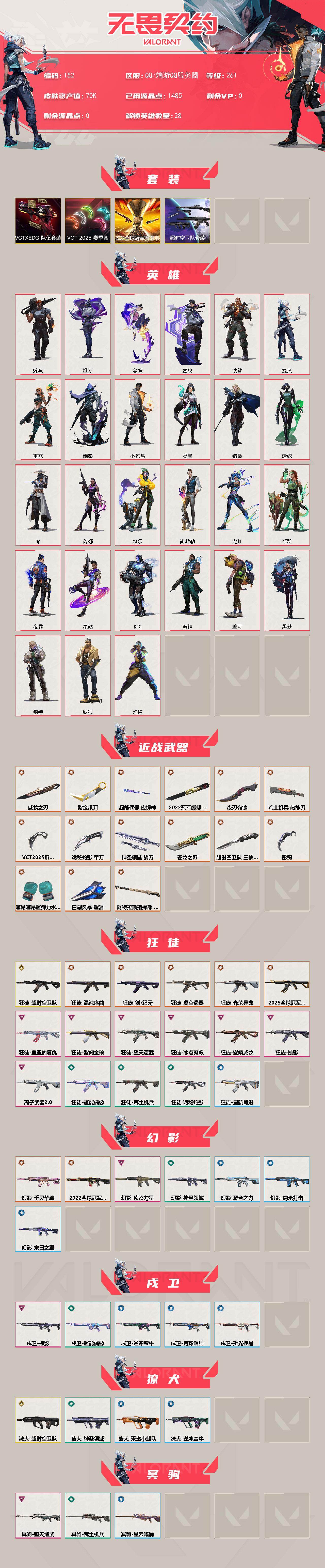 【152】【套装】:2022全球冠军赛套装,超时空卫队套装,vct 2025 赛季套装,vctxedg 队伍套装 【英雄】:幻棱,炼狱,维斯,暮蝶,钛狐,壹决,铁臂,捷风,雷兹,幽影,不死鸟,贤者,猎枭,蝰蛇,零,芮娜,奇乐,尚勃勒,霓虹,斯凯,夜露,星礈,k/o,海神,盖可,黑梦,钢锁 【近战武器】:近战武器-2022全球冠军赛 蝴蝶刀,近战武器-嘟昂嘟昂超弹力水球拳套,近战武器-影钩,近战武器-超时空卫队 三棱军刺,近战武器-5周年//公测重制版 苍龙之刃,近战武器-vct 2025 爪刀,近战武器-紫金爪刀,近战武器-威龙之刃,近战武器-超能偶像 应援棒,近战武器-荒土机兵 热能刀,近战武器-夜刃诡镰,近战武器-诡秘蛇影 军刀,近战武器-神圣领域 战刀,近战武器-日耀风暴 遗器,近战武器-阿特拉斯指挥部 甩棍 【狂徒】:狂徒-超时空卫队,狂徒-2025全球冠军赛,狂徒-混沌序曲,狂徒-创·纪元,狂徒-虚空遗器,狂徒-光荣异象,狂徒-冰点凝冻,狂徒-堕天遗武,狂徒-掠影,狂徒-盖亚的复仇,狂徒-耀鳞威龙,狂徒-紫阙金琅,狂徒-离子武器//2.0,狂徒-超能偶像,狂徒-荒土机兵,狂徒-诡秘蛇影,狂徒-星航勇进 【幻影】:幻影-2022全球冠军赛,幻影-千灵华绽,幻影-侦察力量,幻影-神圣领域,幻影-聚合之力,幻影-纳米打击,幻影-末日之翼 【戍卫】:戍卫-掠影,戍卫-超能偶像,戍卫-逆冲蛮牛,戍卫-月球哨兵,戍卫-折光棱晶 【獠犬】:獠犬-超时空卫队,獠犬-神圣领域,獠犬-采蜜小蜂队,獠犬-逆冲蛮牛 【冥驹】:冥驹-堕天遗武,冥驹-荒土机兵,冥驹-星云暗涌 【飞将】:飞将-聚合之力,飞将-末日之翼 【莽侠】:莽侠-超时空卫队,莽侠-神中神罚,莽侠-诡秘蛇影,莽侠-月球哨兵 【战神】:战神-神圣领域,战神-采蜜小蜂队 【奥丁】:奥丁-纳米打击,奥丁-末日之翼 【判官】:判官-超能偶像,判官-诡秘蛇影,判官-采蜜小蜂队,判官-纳米打击x 【雄鹿】:雄鹿-逆冲蛮牛,雄鹿-月球哨兵 【骇灵】:骇灵-荒土机兵,骇灵-无限竞技,骇灵-星云暗涌 【蜂刺】:蜂刺-聚合之力,蜂刺-星云暗涌,蜂刺-折光棱晶 【标配】:标配-超能偶像,标配-荒土机兵,标配-折光棱晶 【vct手呛】:标配-vct x edg 【正义】:正义-奇点,正义-塑水宗,正义-超限闪存,正义-纳米打击,正义-月球哨兵 【鬼魅】:鬼魅-超时空卫队,鬼魅-天界神兵,鬼魅-诡秘蛇影,鬼魅-采蜜小蜂队,鬼魅-星云暗涌 【狂怒】:狂怒-神圣领域,狂怒-聚合之力,狂怒-逆冲蛮牛 【短炮】:短炮-末日之翼 【卡面】:终章:激斗汉堡 卡面,进入射程 卡面,分崩离析 卡面,纳米打击 卡面,抑制技术 卡面,激斗汉堡 卡面,瓦娃脸雪糕 p2 卡面,从黄昏到黎明 卡面,荒土机兵 卡面,银弹猎手 卡面,逆冲蛮牛 卡面,《双城之战》拥抱 卡面,精灵大战 卡面,欢迎来到底城 卡面,南瓜盛典 卡面,vct cn首冠 卡面,钢弓与箭弦 卡面,无畏契约:暮蝶 卡面,修车达人 卡面,热舞环节 卡面,正义的化身 卡面,终章:生意人麦宝 卡面,铁之华 卡面,失而复得 卡面,时间到 卡面,最高舞台 卡面,复活专家 卡面,归乡 // 蝰蛇 卡面,超能偶像 卡面,生意人麦宝 卡面,树懒大作战 卡面,声感陷阱设计图 卡面,红鳞松叶 卡面,clutch 卡面,钢锁工牌 卡面,战术小伙伴的夏日 卡面,采蜜小蜂队 卡面,聚合之力 卡面,梦幻奶茶 卡面,失控边缘 卡面,战术熊与伙伴们 卡面,零点嗅探设计图 卡面,瓦娃脸雪糕 卡面 ,无畏契约go!第一卷:芮娜 卡面,珍珠棘贝 卡面,复古浪潮 卡面,无畏契约go!第一卷:零 卡面,无垠星环 卡面,《双城之战》金克丝 卡面,逆向独行 卡面 ,没有什么能逃过我的眼睛 卡面,无畏契约go!第一卷:贤者 卡面,钢锁vs盖可 卡面,天台狂欢 卡面,势不可挡//k/o 卡面,代号红色 卡面,冰淇淋店 卡面,新兵报到 卡面,v契约 卡面,无畏契约 卡面 【喷漆】:小小心意 喷漆,战“素”兔 喷漆,宇宙的指引 喷漆,请求重启 喷漆,逆冲蛮牛 喷漆,纳米打击 喷漆,鼻尖上的蝴蝶 喷漆,简笔画黯兽 喷漆,独守蝰腹 喷漆,他们将落荒而逃 喷漆,通缉:战术企鹅 喷漆,荒土机兵 喷漆,别挡我吃球! 喷漆,嗨宝南瓜灯 喷漆,嘭! 喷漆,都算到了 喷漆,控场勿近 喷漆,伤心心 喷漆,小丑猫 喷漆,熊抱 喷漆,蛋糕还是爆能器? 喷漆,又被闪了 喷漆,终极羞辱 喷漆,超级粉丝 喷漆,黯兽卖萌 喷漆,捷风差距 喷漆,惊声尖叫 喷漆,五人成星 喷漆,超能偶像 喷漆,放我出去 喷漆,掩护我 喷漆,大佬发呛 喷漆,边缘试探 喷漆,拼一呛 喷漆,聚合之力 喷漆,采蜜小蜂队 喷漆,梦幻小队 喷漆,五个全都齐了 喷漆,皮蛋萌舞 喷漆,我的刀呢? 喷漆,霓光四射 喷漆,情绪控制 喷漆,双击点赞 喷漆,买装还是存钱 喷漆,关门放狗 喷漆,酷熊冲浪 喷漆,无畏契约go!第一卷:芮娜 喷漆,无畏契约go!第一卷:贤者 喷漆,松叶 喷漆,无畏契约go!第一卷:奇乐 喷漆,胜利属于无畏契约 喷漆,glhf 喷漆,无畏契约 喷漆 【挂饰】:终章:猫猫木乃伊 挂饰,荒土机兵 挂饰,悠闲鸡块 挂饰,猫猫木乃伊 挂饰,水壶 挂饰,纳米打击 挂饰,逆冲蛮牛 挂饰,可爱糖糖 挂饰,伞绳 挂饰,《双城之战》小蛋糕 挂饰,第九季//第三幕 纪念币 挂饰,工具腰带 挂饰,无畏契约go!第一卷 芮娜 挂饰,无畏契约go!第一卷 零 挂饰,暗藏猫腻 挂饰,鱼骨头 挂饰,熔岩灯 挂饰,瞬云履 挂饰,第九季//第二幕 纪念币 挂饰,薰衣草之心 挂饰,终章:这瓜保熟 挂饰,炼狱雪糕 挂饰,糖葫芦 挂饰,袖珍捷风 挂饰,冲上云霄 挂饰,超能偶像 挂饰,迷你浓缩 挂饰,这瓜保熟 挂饰,采蜜小蜂队 挂饰,第九季//第一幕 纪念币 挂饰,聚合之力 挂饰,vct x edg 挂饰,第八季//第三