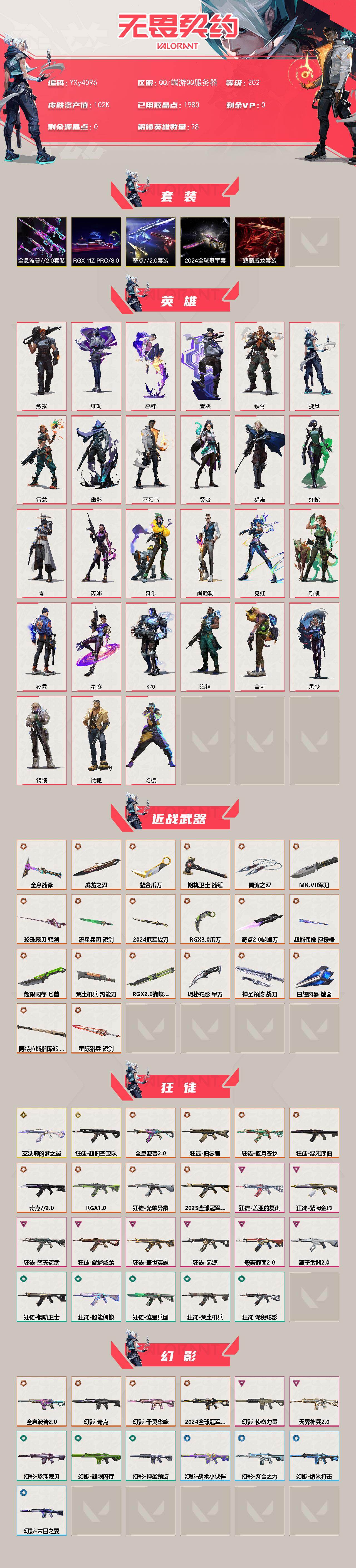 【10.2w库存24冠军套.龙年套.显卡3.0套装.黑波之刃.奇点蝴蝶刀.显卡蝴蝶刀.紫金爪刀.18狂徒六幻影】yxy4096【无二次】【因赛季更新游戏段付以上号为准!】 【套装】:2024全球冠军赛套装,rgx 11z pro//3.0套装,奇点//2.0套装,全息波普//2.0套装,耀鳞威龙套装 【英雄】:幻棱,炼狱,维斯,暮蝶,钛狐,壹决,铁臂,捷风,雷兹,幽影,不死鸟,贤者,猎枭,蝰蛇,零,芮娜,奇乐,尚勃勒,霓虹,斯凯,夜露,星礈,k/o,海神,盖可,黑梦,钢锁 【近战武器】:近战武器-2024全球冠军赛 战刀,近战武器-rgx 11z pro//2.0 蝴蝶刀,近战武器-奇点//2.0 蝴蝶刀,近战武器-紫金爪刀,近战武器-rgx 11z pro//3.0 爪刀,近战武器-黑波之刃,近战武器-威龙之刃,近战武器-珍珠棘贝 短剑,近战武器-流星兵团 短剑,近战武器-超能偶像 应援棒,近战武器-超限闪存 匕首,近战武器-钢轨卫士 战锤,近战武器-荒土机兵 热能刀,近战武器-mk.vii 自由强袭 军刀,近战武器-全息战斧,近战武器-诡秘蛇影 军刀,近战武器-神圣领域 战刀,近战武器-日耀风暴 遗器,近战武器-阿特拉斯指挥部 甩棍,近战武器-星际猎兵 短剑 【狂徒】:狂徒-艾沃莉的梦之翼,狂徒-超时空卫队,狂徒-2025全球冠军赛,狂徒-归零者,狂徒-混沌序曲,狂徒-奇点//2.0,狂徒-全息波普//2.0,狂徒-偃月苍龙,狂徒-rgx 11z pro,狂徒-光荣异象,狂徒-般若假面//2.0,狂徒-堕天遗武,狂徒-盖世英雄,狂徒-盖亚的复仇,狂徒-起源,狂徒-耀鳞威龙,狂徒-紫阙金琅,狂徒-离子武器//2.0,狂徒-超能偶像,狂徒-钢轨卫士,狂徒-荒土机兵,狂徒-流星兵团,狂徒-诡秘蛇影 【幻影】:幻影-2024全球冠军赛,幻影-奇点,幻影-千灵华绽,幻影-全息波普//2.0,幻影-天界神兵//2.0,幻影-侦察力量,幻影-超限闪存,幻影-珍珠棘贝,幻影-神圣领域,幻影-聚合之力,幻影-纳米打击,幻影-战术小伙伴,幻影-末日之翼 【戍卫】:戍卫-紫阙金琅,戍卫-超能偶像,戍卫-钢轨卫士,戍卫-珍珠棘贝,戍卫-浮光跃金,戍卫-逆冲蛮牛,戍卫-战术熊与伙伴们,戍卫-月球哨兵,戍卫-折光棱晶 【獠犬】:獠犬-黯夜怪谈,獠犬-神圣领域,獠犬-采蜜小蜂队,獠犬-复古浪潮,獠犬-模拟赫兹,獠犬-逆冲蛮牛,獠犬-战术小伙伴 【冥驹】:冥驹-全息波普//2.0,冥驹-偃月苍龙,冥驹-离子武器,冥驹-荒土机兵,冥驹-复古浪潮,冥驹-模拟赫兹,冥驹-星云暗涌 【飞将】:飞将-盖亚的复仇,飞将-聚合之力,飞将-光导纤维,飞将-战术熊与伙伴们,飞将-末日之翼 【莽侠】:莽侠-rgx 11z pro//3.0,莽侠-超限闪存,莽侠-诡秘蛇影,莽侠-深海水族,莽侠-纤云弄巧,莽侠-月球哨兵 【战神】:战神-迷邃星云,战神-神圣领域,战神-采蜜小蜂队,战神-浮光跃金,战神-深海水族 【奥丁】:奥丁-紫阙金琅//2.0,奥丁-流星兵团,奥丁-纳米打击,奥丁-战术小伙伴,奥丁-末日之翼 【判官】:判官-虚空遗器,判官-超能偶像,判官-诡秘蛇影,判官-采蜜小蜂队,判官-纳米打击x 【雄鹿】:雄鹿-机动狂飙,雄鹿-复古浪潮,雄鹿-模拟赫兹,雄鹿-逆冲蛮牛,雄鹿-月球哨兵 【骇灵】:骇灵-光明哨兵//2.0,骇灵-荒土机兵,骇灵-流星兵团,骇灵-珍珠棘贝,骇灵-浮光跃金,骇灵-光导纤维,骇灵-星云暗涌 【蜂刺】:蜂刺-机动狂飙,蜂刺-超限闪存,蜂刺-聚合之力,蜂刺-深海水族,蜂刺-纤云弄巧,蜂刺-战术小伙伴,蜂刺-星云暗涌,蜂刺-折光棱晶 【标配】:标配-全息波普//2.0,标配-赛博迷城,标配-超能偶像,标配-荒土机兵,标配-浮光跃金,标配-光导纤维,标配-战术熊与伙伴们,标配-折光棱晶 【vct手呛】:标配-vct25 x edg 【正义】:正义-781-a协议,正义-rgx 11z pro//3.0,正义-千灵华绽,正义-塑水宗,正义-西部未来,正义-超限闪存,正义-复古浪潮,正义-纳米打击,正义-纤云弄巧,正义-游戏结束,正义-月球哨兵 【鬼魅】:鬼魅-破败军械,鬼魅-奇点//2.0,鬼魅-天界神兵,鬼魅-耀鳞威龙,鬼魅-流星兵团,鬼魅-诡秘蛇影,鬼魅-采蜜小蜂队,鬼魅-光导纤维,鬼魅-模拟赫兹,鬼魅-扑棱扑棱,鬼魅-宿怨,鬼魅-星云暗涌 【狂怒】:狂怒-离子武器//2.0,狂怒-钢轨卫士,狂怒-珍珠棘贝,狂怒-神圣领域,狂怒-聚合之力,狂怒-逆冲蛮牛,狂怒-战术熊与伙伴们 【短炮】:短炮-钢轨卫士,短炮-深海水族,短炮-纤云弄巧,短炮-末日之翼 【卡面】:终章:激斗汉堡 卡面,进入射程 卡面,分崩离析 卡面,纳米打击 卡面,抑制技术 卡面,激斗汉堡 卡面,瓦娃脸雪糕 p2 卡面,从黄昏到黎明 卡面,荒土机兵 卡面,银弹猎手 卡面,逆冲蛮牛 卡面,《双城之战》拥抱 卡面,精灵大战 卡面,欢迎来到底城 卡面,南瓜盛典 卡面,唱片的故事 卡面,钢弓与箭弦 卡面,无畏契约:暮蝶 卡面,排除故障 卡面,奇点//2.0 卡面,战术桌游 卡面,悠享食光 卡面,修车达人 卡面,模拟赫兹 卡面,浮光跃金 卡面,超限闪存 卡面,维斯工牌 卡面,正义的化身 卡面,终章:生意人麦宝 卡面,铁之华 卡面,2024全球冠军赛 卡面,失而复得 卡面,时间到 卡面,最高舞台 卡面,复活专家 卡面,归乡 // 蝰蛇 卡面,rgx 11z pro//3.0 卡面,超能偶像 卡面,生意人麦宝 卡面,声感陷阱设计图 卡面,红鳞松叶 卡面,钢锁工牌 卡面,战术小伙伴的夏日 卡面,采蜜小蜂队 卡面,聚合之力 卡面,梦幻奶茶 卡面,终章:打造专属狂徒 卡面,趁热吃 卡面,西装暴徒 卡面,失控边缘 卡面,哨卫者之领域 卡面,暮蝶工牌 卡面,战术熊与伙伴们 卡面,源能反应 卡面,流星兵团 卡面,纤云弄巧 卡面,暂别喧嚣 卡面,打造专属狂徒 卡面,零点嗅探设计图 卡面,表象之下 卡面,虹吸式咖啡壶 卡面,源能者美容 卡面,脚踝终结者 卡面 ,夜班 卡面,瓦娃脸