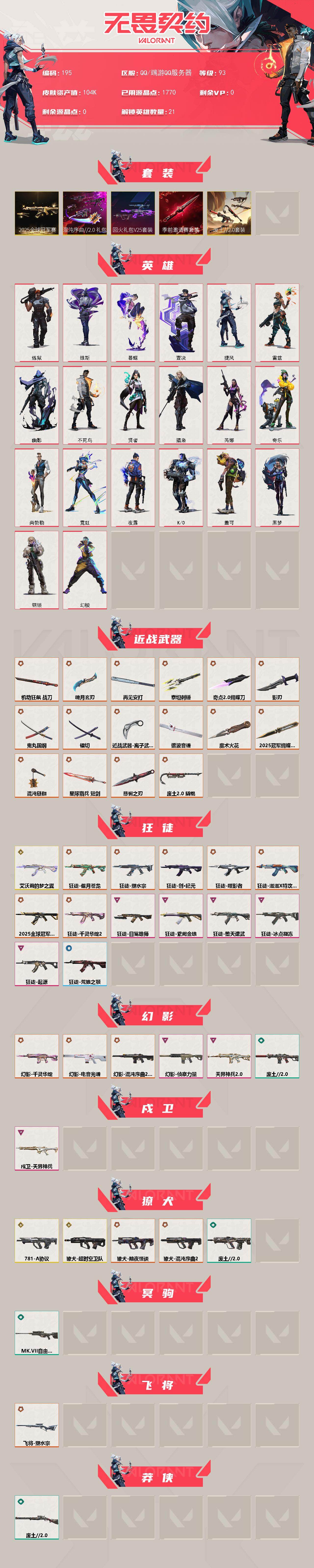【195】【套装】:2025全球冠军赛套装,无畏契约季前邀请赛套装,回火礼包// v25套装,混沌序曲//2.0套装,废土//2.0套装 【英雄】:幻棱,炼狱,维斯,暮蝶,壹决,捷风,雷兹,幽影,不死鸟,贤者,猎枭,芮娜,奇乐,尚勃勒,霓虹,夜露,k/o,盖可,黑梦,钢锁 【近战武器】:近战武器-2025全球冠军赛 蝴蝶刀,近战武器-无畏契约季前邀请赛 悲悯之刃,近战武器-废土//2.0 撬棍,近战武器-混沌链枷,近战武器-魔术火花,近战武器-谐波音谱,近战武器-奇点//2.0 蝴蝶刀,近战武器-镭切,近战武器-鬼丸国纲,近战武器-离子武器//2.0 爪刀,近战武器-机动狂飙 战刀,近战武器-魄月玄刃,近战武器-泰坦刺锤,近战武器-影刃,近战武器-再见安打,近战武器-星际猎兵 短剑,近战武器-魔术火花 【狂徒】:狂徒-艾沃莉的梦之翼,狂徒-2025全球冠军赛,狂徒-塑水宗,狂徒-偃月苍龙,狂徒-创·纪元,狂徒-噬影者,狂徒-滋滋x特攻队,狂徒-千灵华绽//2.0,狂徒-冰点凝冻,狂徒-堕天遗武,狂徒-起源,狂徒-日冕雄师,狂徒-紫阙金琅,狂徒-荒狼之颚 【幻影】:幻影-千灵华绽,幻影-电音光谱,幻影-混沌序曲//2.0,幻影-天界神兵//2.0,幻影-侦察力量,幻影-废土//2.0,幻影-电音光谱 【戍卫】:戍卫-天界神兵 【獠犬】:獠犬-781-a协议,獠犬-超时空卫队,獠犬-黯夜怪谈,獠犬-混沌序曲//2.0,獠犬-废土//2.0 【冥驹】:冥驹-mk.vii 自由强袭 【飞将】:飞将-塑水宗 【莽侠】:莽侠-废土//2.0 【战神】:战神-涂鸦伙伴 【雄鹿】:雄鹿-紫阙金琅//2.0,雄鹿-废土//2.0 【骇灵】:骇灵-塑水宗,骇灵-混沌序曲//2.0,骇灵-堕天遗武 【蜂刺】:蜂刺-机动狂飙 【vct手呛】:标配-vct25 x nrg 【正义】:正义-混沌序曲//2.0,正义-离子武器 【鬼魅】:鬼魅-天界神兵,鬼魅-耀鳞威龙 【卡面】:钢弓与箭弦 卡面,《双城之战》金克丝 卡面,同步耍酷 卡面,代号红色 卡面,新兵报到 卡面,v契约 卡面,无畏契约 卡面 【喷漆】:霓光四射 喷漆,关门放狗 喷漆,红鳞 喷漆,胜利属于无畏契约 喷漆,glhf 喷漆,无畏契约 喷漆 【挂饰】:无畏契约go!第一卷 零 挂饰,无畏契约 纪念币 挂饰