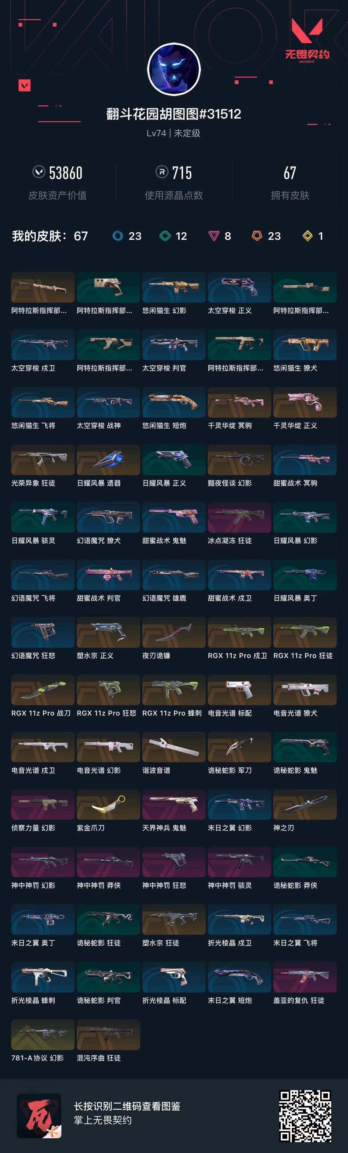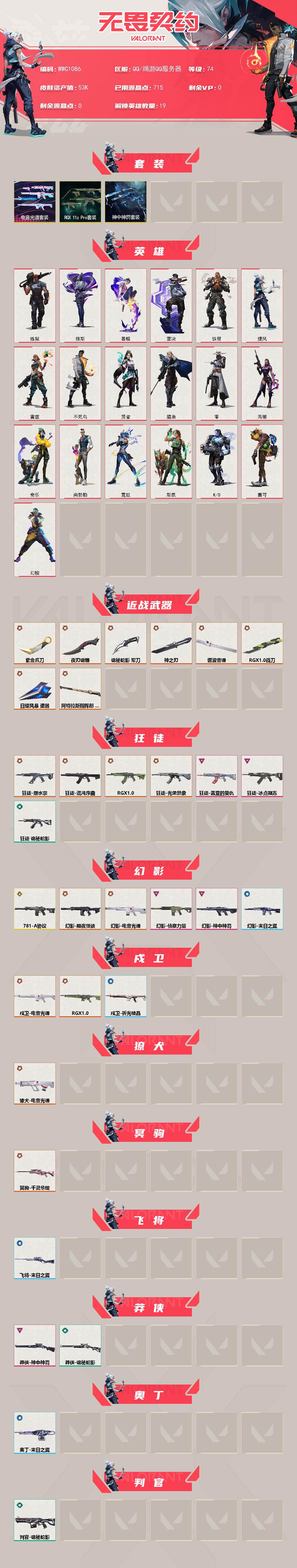 【wwc1086】终极23/传奇1/卓越8/皮肤67/等级74/段位:未定级/rgx 11z pro套装/电音光谱套装/神中神罚套装/幻棱/炼狱/维斯/暮蝶/壹决/铁臂/捷风/雷兹/不死鸟/贤者/猎枭/零/芮娜/奇乐/尚勃勒/霓虹/斯凯/k/o/盖可/近战武器-rgx 11z pro 战刀/近战武器-谐波音谱/近战武器-神之刃/紫金爪刀/夜刃诡镰/近战武器-诡秘蛇影 军刀/近战武器-