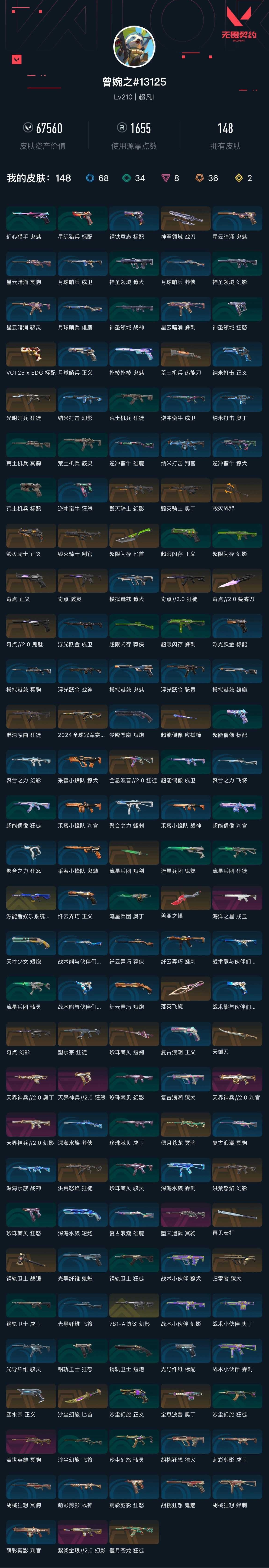 【无畏契约】【yhwww8609】等级:220,已用无畏点67560,已用源晶点1655,金皮:幻影-781-a协议|幻影-源能者娱乐系统__橙皮:奥丁-全息波普|骇灵-奇点|幻影-2024全球冠军赛|幻影-洪荒怒焰|幻影-奇点|近战-超限闪存 匕首|近战-钢轨卫士 战锤|近战-超能偶像 应援棒|近战-盖亚之愠|近战-流星兵团 短剑|近战-落英飞旋|近战-再见安打|近战-沙尘幻旅 匕首|近战-天御刀|近战-珍珠棘贝 短剑|狂徒-全息波普2.0|狂徒-偃月苍龙|狂徒-塑水宗|狂徒-洪荒怒焰|狂徒-光明哨兵|獠犬-归零者|狂徒-混沌序曲|正义-塑水宗|正义-奇点|冥驹-偃月苍龙|狂徒-奇点2.0|鬼魅-奇点2.0|近战-奇点2.0 蝴蝶刀|近战-毁灭战斧|近战-荒土机兵 热能刀|正义-毁灭骑士|奥丁-毁灭骑士|判官-毁灭骑士|幻影-毁灭骑士|近战-神圣领域 战刀|标配-vct25 x edg__紫皮:奥丁-天界神兵2.0|幻影-天界神兵2.0|幻影-紫阙金琅2.0|狂怒-天界神兵2.0|冥驹-堕天遗武|判官-天界神兵2.0|冥驹-盖世英雄|戍卫-海洋之星__绿皮:短炮-钢轨卫士|骇灵-珍珠棘贝|幻影-珍珠棘贝|狂怒-钢轨卫士|狂徒-钢轨卫士|狂怒-珍珠棘贝|戍卫-钢轨卫士|戍卫-珍珠棘贝|狂徒-荒土机兵|标配-荒土机兵|骇灵-荒土机兵|冥驹-荒土机兵|獠犬-神圣领域|狂怒-神圣领域|战神-神圣领域|幻影-神圣领域|戍卫-超能偶像|标配-超能偶像|狂徒-超能偶像|判官-超能偶像|正义-超限闪存|莽侠-超限闪存|幻影-超限闪存|蜂刺-超限闪存|骇灵-流星兵团|鬼魅-流星兵团|狂徒-流星兵团|奥丁-流星兵团|正义-沙尘幻旅|狂徒-沙尘幻旅|飞将-沙尘幻旅|骇灵-沙尘幻旅|标配-星际猎兵|鬼魅-幻心猎手__蓝皮:鬼魅-光导纤维|飞将-光导纤维|标配-光导纤维|骇灵-光导纤维|獠犬-复古浪潮|冥驹-复古浪潮|雄鹿-复古浪潮|正义-复古浪潮|短炮-梦魇恶魔|短炮-天才少女|判官-纳米打击|正义-纳米打击|奥丁-纳米打击|幻影-纳米打击|雄鹿-逆冲蛮牛|狂怒-逆冲蛮牛|戍卫-逆冲蛮牛|獠犬-逆冲蛮牛|鬼魅-星云暗涌|骇灵-星云暗涌|正义-月球哨兵|莽侠-月球哨兵|戍卫-月球哨兵|雄鹿-月球哨兵|鬼魅-采蜜小蜂队|战神-采蜜小蜂队|獠犬-采蜜小蜂队|判官-采蜜小蜂队|骇灵-浮光跃金|标配-浮光跃金|戍卫-浮光跃金|战神-浮光跃金|标配-钢铁意志|鬼魅-胡桃狂想|獠犬-胡桃狂想|蜂刺-胡桃狂想|冥驹-胡桃狂想|蜂刺-聚合之力|幻影-聚合之力|狂怒-聚合之力|飞将-聚合之力|戍卫-萌彩剪影|战神-萌彩剪影|狂怒-萌彩剪影|判官-萌彩剪影|鬼魅-模拟赫兹|獠犬-模拟赫兹|冥驹-模拟赫兹|雄鹿-模拟赫兹|鬼魅-扑棱扑棱|战神-深海水族|短炮-深海水族|蜂刺-深海水族|莽侠-深海水族|莽侠-纤云弄巧|正义-纤云弄巧|短炮-纤云弄巧|蜂刺-纤云弄巧|冥驹-星云暗涌|蜂刺-星云暗涌|蜂刺-战术小伙伴|幻影-战术小伙伴|獠犬-战术小伙伴|奥丁-战术小伙伴|飞将-战术熊与伙伴们|狂怒-战术熊与伙伴们|戍卫-战术熊与伙伴们|标配-战术熊与伙伴们__段位:钻石__英雄:尚勃勒|维斯|黑梦|斯凯|暮蝶|盖可|霓虹|壹决|星礈|k/o|幽影|夜露|钢锁|海神|奇乐|炼狱|铁臂|贤者|猎枭|钛狐|芮娜|零|捷风|蝰蛇|不死鸟|幻棱|雷兹|禁灭库存67560/24冠军幻影/落英飞旋/
