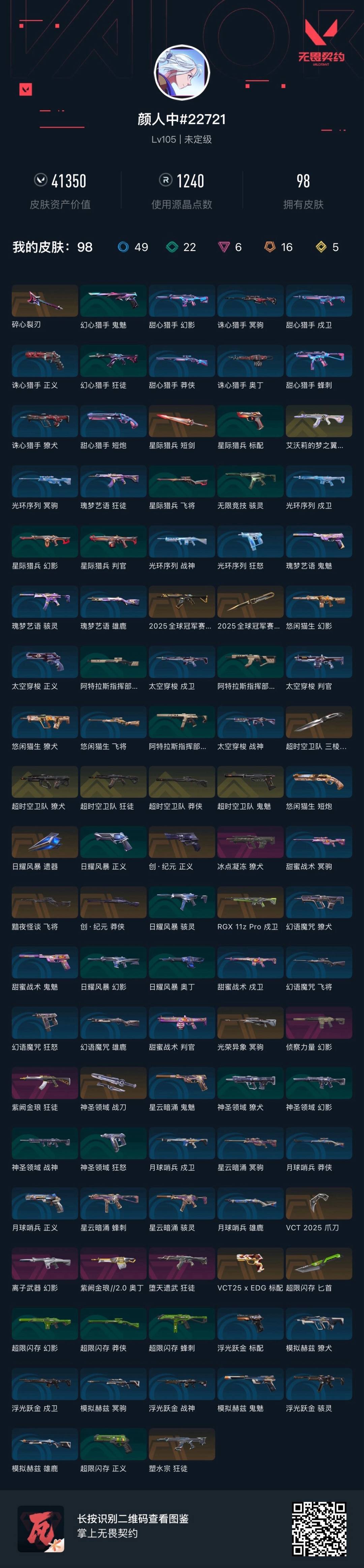 16橙皮 5金皮 6紫皮 98皮肤 28英雄 124卡面 1240已用源晶 未定级段位 【套装】vcn2025套装超时空卫队2025全球冠军赛vct 2025赛季礼包 【近战武器皮肤】vct 2025 爪刀神圣领域 战刀匕首-超限闪存2025全球冠军赛 蝴蝶刀星际猎兵 短剑碎心