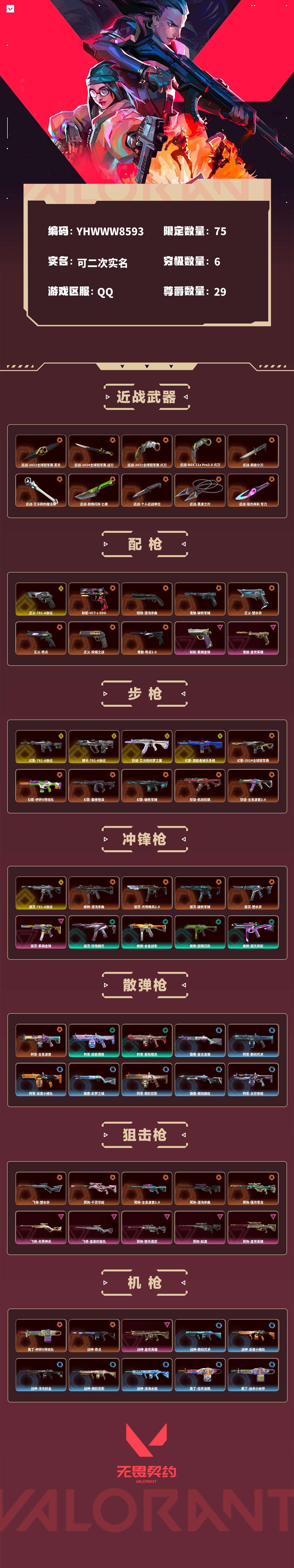 【无畏契约】【yhwww8593】等级:147,已用无畏点203515,已用源晶点2310,金皮:幻影-781-a协议|骇灵-781-a协议|獠犬-781-a协议|正义-781-a协议|狂徒-艾沃莉的梦之翼|幻影-源能者娱乐系统__橙皮:奥丁-砰砰x特攻队|标配-vct x edg|蜂刺-混沌序曲|骇灵-光明哨兵2.0|短炮-混沌序曲|骇灵-破败军械|飞将-塑水宗|鬼魅-破败军械|幻影-2024全球冠军赛|幻影-砰砰x特攻队|幻影-黯夜怪谈|幻影-破败军械|近战-2023全球冠军赛 苦无|近战-2024全球冠军赛 战刀|近战-2021全球冠军赛 爪刀|骇灵-塑水宗|近战-rgx 11z pro3.0 爪刀|近战-剥皮小刀|近战-艾沃莉的魔法棒|近战-超限闪存 匕首|近战-个人近战单位|近战-黑波之刃|近战-弧光异彩 军刀|近战-定海神珍|近战-钢轨卫士 战锤|近战-盖亚之怒|近战-澄湖潋滟|近战-超能偶像 应援棒|近战-盖亚之愠|近战-混沌大剑|近战-离火刃|近战-机动狂飙 战刀|近战-破败王者之残刃|近战-金琅斧|近战-魄月玄刃|近战-落英飞旋|近战-再见安打|近战-沙尘幻旅 匕首|近战-威龙之刃|近战-天玄刀|近战-夜刃诡镰|近战-天御刀|近战-珍珠棘贝 短剑|近战-紫金爪刀|狂徒-机动狂飙|狂徒-全息波普2.0|狂徒-归零者|狂徒-偃月苍龙|狂徒-2021全球冠军赛|狂徒-塑水宗|狂徒-洪荒怒焰|狂徒-光明哨兵|狂徒-混沌序曲|狂徒-2023全球冠军赛|冥驹-千灵华绽|正义-塑水宗|正义-奇点|戍卫-破败军械|正义-双城之战|判官-全息波普|冥驹-全息波普2.0|战神-奇点|冥驹-混沌序曲|冥驹-偃月苍龙|近战-侦察力量 蝴蝶刀|近战-合金战车 军刀|狂徒-奇点2.0|鬼魅-奇点2.0|近战-奇点2.0 蝴蝶刀|近战-影刃|狂徒-rgx 11z pro|狂徒-2025全球冠军赛|近战-2025全球冠军赛 蝴蝶刀|近战-影钩|狂徒-多弥尔的复仇__紫皮:标配-紫阙金琅|飞将-天界神兵|飞将-盖亚的复仇|鬼魅-盖世英雄|鬼魅-盖亚的复仇|鬼魅-耀鳞威龙|鬼魅-天界神兵|骇灵-紫阙金琅|幻影-般若假面|狂徒-起源|狂徒-盖世英雄|幻影-源能者危机001|幻影-侦察力量|狂徒-盖亚的复仇|狂徒-海洋之星|狂徒-冰点凝冻|狂徒-堕天遗武|冥驹-堕天遗武|狂徒-耀鳞威龙|冥驹-起源|狂徒-紫阙金琅|冥驹-盖世英雄|戍卫-盖亚的复仇|戍卫-紫阙金琅|战神-盖世英雄|冥驹-掠影|狂徒-掠影|戍卫-掠影|正义-掠影__绿皮:短炮-钢轨卫士|骇灵-珍珠棘贝|幻影-珍珠棘贝|狂怒-钢轨卫士|狂徒-钢轨卫士|狂怒-珍珠棘贝|戍卫-钢轨卫士|戍卫-珍珠棘贝|蜂刺-合金战车|正义-合金战车|幻影-合金战车|飞将-合金战车|戍卫-超能偶像|标配-超能偶像|狂徒-超能偶像|判官-超能偶像|正义-超限闪存|莽侠-超限闪存|幻影-超限闪存|蜂刺-超限闪存|短炮-弧光异彩|獠犬-弧光异彩|蜂刺-弧光异彩|狂徒-弧光异彩|正义-沙尘幻旅|狂徒-沙尘幻旅|飞将-沙尘幻旅|骇灵-沙尘幻旅|幻影-噬源兽防卫工程|短炮-悠闲猫生|飞将-悠闲猫生|幻影-悠闲猫生|獠犬-悠闲猫生|判官-星际猎兵__蓝皮:鬼魅-光导纤维|飞将-光导纤维|标配-光导纤维|骇灵-光导纤维|獠犬-复古浪潮|冥驹-复古浪潮|雄鹿-复古浪潮|正义-复古浪潮|标配-超能冲撞|狂怒-花漾粉红|骇灵-花漾粉红|戍卫-花漾粉红|冥驹-花漾粉红|战神-数码咒术|獠犬-数码咒术|判官-数码咒术|鬼魅-数码咒术|冥驹-沙场老兵|鬼魅-采蜜小蜂队|战神-采蜜小蜂队|獠犬-采蜜小蜂队|判官-采蜜小蜂队|戍卫-彩梦之城|雄鹿-彩梦之城|标配-彩梦之城|骇灵-浮光跃金|标配-浮光跃金|戍卫-浮光跃金|战神-浮光跃金|鬼魅-胡桃狂想|獠犬-胡桃狂想|蜂刺-胡桃狂想|冥驹-胡桃狂想|蜂刺-聚合之力|幻影-聚合之力|狂怒-聚合之力|飞将-聚合之力|戍卫-萌彩剪影|战神-萌彩剪影|狂怒-萌彩剪影|判官-萌彩剪影|鬼魅-模拟赫兹|獠犬-模拟赫兹|冥驹-模拟赫兹|雄鹿-模拟赫兹|战神-深海水族|短炮-深海水族|蜂刺-深海水族|莽侠-深海水族|短炮-纤云弄巧|鬼魅-信手涂鸦|骇灵-信手涂鸦|奥丁-信手涂鸦|飞将-信手涂鸦|蜂刺-战术小伙伴|幻影-战术小伙伴|獠犬-战术小伙伴|奥丁-战术小伙伴|狂怒-战术熊与伙伴们|标配-战术熊与伙伴们|正义-太空穿梭|战神-太空穿梭|判官-太空穿梭|戍卫-太空穿梭|骇灵-阿特拉斯指挥部|莽侠-阿特拉斯指挥部|狂徒-阿特拉斯指挥部|狂怒-光环序列|战神-光环序列|鬼魅-瑰梦艺语|骇灵-瑰梦艺语|雄鹿-瑰梦艺语__段位:铂金__英雄:尚勃勒|维斯|黑梦|斯凯|暮蝶|盖可|霓虹|壹决|星礈|k/o|幽影|夜露|钢锁|海神|奇乐|炼狱|铁臂|贤者|猎枭|钛狐|芮娜|零|捷风|蝰蛇|不死鸟|幻棱|雷兹