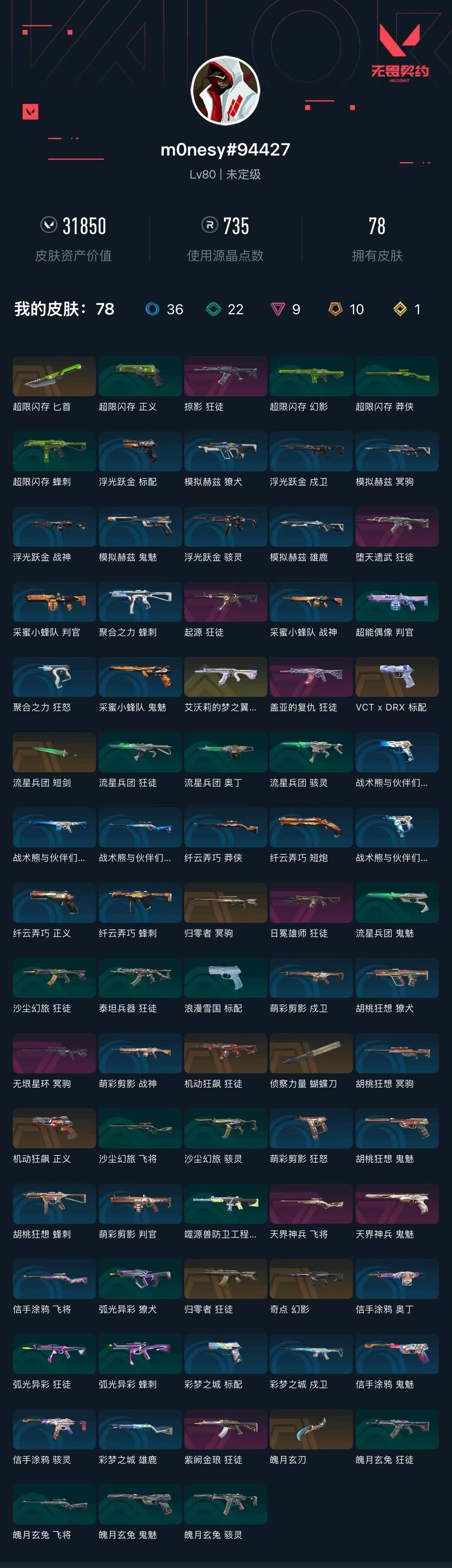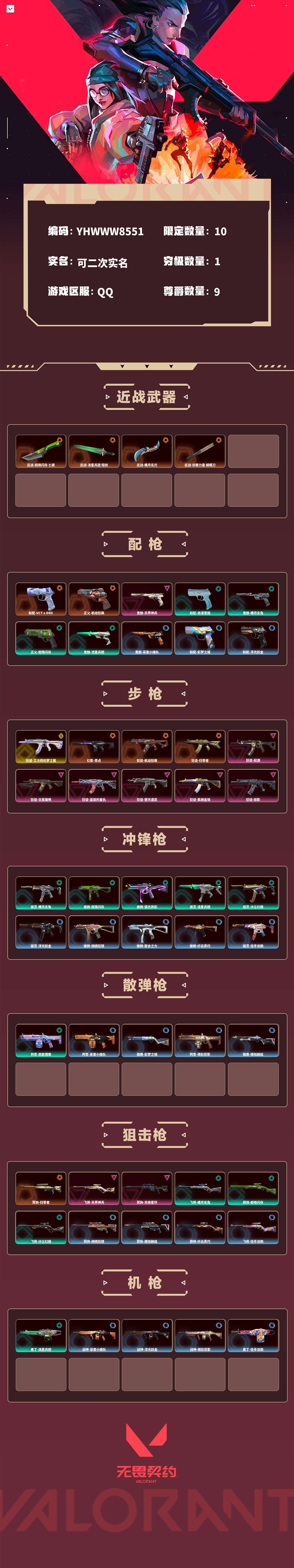 【无畏契约】【yhwww8551】等级:80,已用无畏点31850,已用源晶点735,金皮:狂徒-艾沃莉的梦之翼__橙皮:标配-vct x drx|幻影-奇点|近战-超限闪存 匕首|近战-流星兵团 短剑|近战-魄月玄刃|狂徒-机动狂飙|狂徒-归零者|正义-机动狂飙|冥驹-归零者|近战-侦察力量 蝴蝶刀__紫皮:飞将-天界神兵|鬼魅-天界神兵|狂徒-起源|狂徒-日冕雄师|狂徒-盖亚的复仇|狂徒-堕天遗武|狂徒-紫阙金琅|冥驹-无垠星环|狂徒-掠影__段位:未定级__绿皮:标配-浪漫雪国|骇灵-魄月玄兔|飞将-魄月玄兔|鬼魅-魄月玄兔|狂徒-魄月玄兔|判官-超能偶像|正义-超限闪存|莽侠-超限闪存|幻影-超限闪存|蜂刺-超限闪存|獠犬-弧光异彩|蜂刺-弧光异彩|狂徒-弧光异彩|骇灵-流星兵团|鬼魅-流星兵团|狂徒-流星兵团|奥丁-流星兵团|狂徒-沙尘幻旅|飞将-沙尘幻旅|骇灵-沙尘幻旅|幻影-噬源兽防卫工程|狂徒-泰坦兵器__蓝皮:鬼魅-采蜜小蜂队|战神-采蜜小蜂队|判官-采蜜小蜂队|戍卫-彩梦之城|雄鹿-彩梦之城|标配-彩梦之城|骇灵-浮光跃金|标配-浮光跃金|戍卫-浮光跃金|战神-浮光跃金|鬼魅-胡桃狂想|獠犬-胡桃狂想|蜂刺-胡桃狂想|冥驹-胡桃狂想|蜂刺-聚合之力|狂怒-聚合之力|戍卫-萌彩剪影|战神-萌彩剪影|狂怒-萌彩剪影|判官-萌彩剪影|鬼魅-模拟赫兹|獠犬-模拟赫兹|冥驹-模拟赫兹|雄鹿-模拟赫兹|莽侠-纤云弄巧|正义-纤云弄巧|短炮-纤云弄巧|蜂刺-纤云弄巧|鬼魅-信手涂鸦|骇灵-信手涂鸦|奥丁-信手涂鸦|飞将-信手涂鸦|飞将-战术熊与伙伴们|狂怒-战术熊与伙伴们|戍卫-战术熊与伙伴们|标配-战术熊与伙伴们__英雄:尚勃勒|维斯|黑梦|暮蝶|盖可|霓虹|壹决|k/o|幽影|夜露|炼狱|贤者|猎枭|芮娜|零|捷风|不死鸟