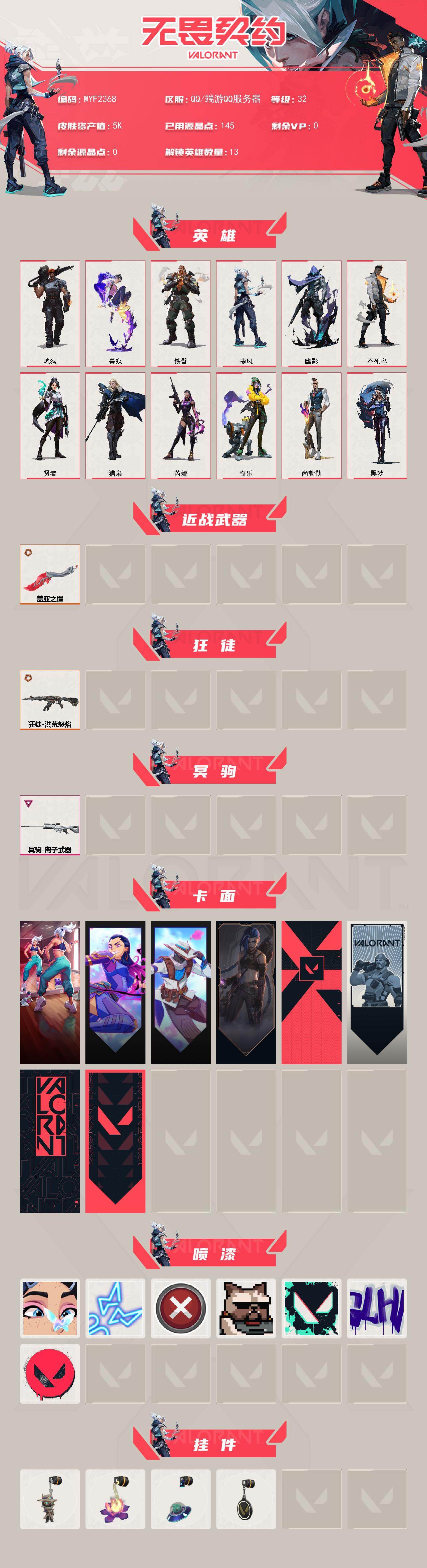 【wyf2368】终极2/卓越1/皮肤4/等级32/段位:青铜/炼狱/暮蝶/铁臂/捷风/幽影/不死鸟/贤者/猎枭/芮娜/奇乐/尚勃勒/黑梦/盖亚之愠/洪荒怒焰-狂徒/冥驹-离子武器/热舞环节 卡面/无畏契约go!第一卷:芮娜 卡面/无畏契约go!第一卷:零 卡面/《双城之战》金克丝 卡面/代号红色 卡面/新兵报到 卡面/v契约 卡面/无畏契约 卡面/鼻尖上的蝴蝶 喷漆/霓光四射 喷漆/