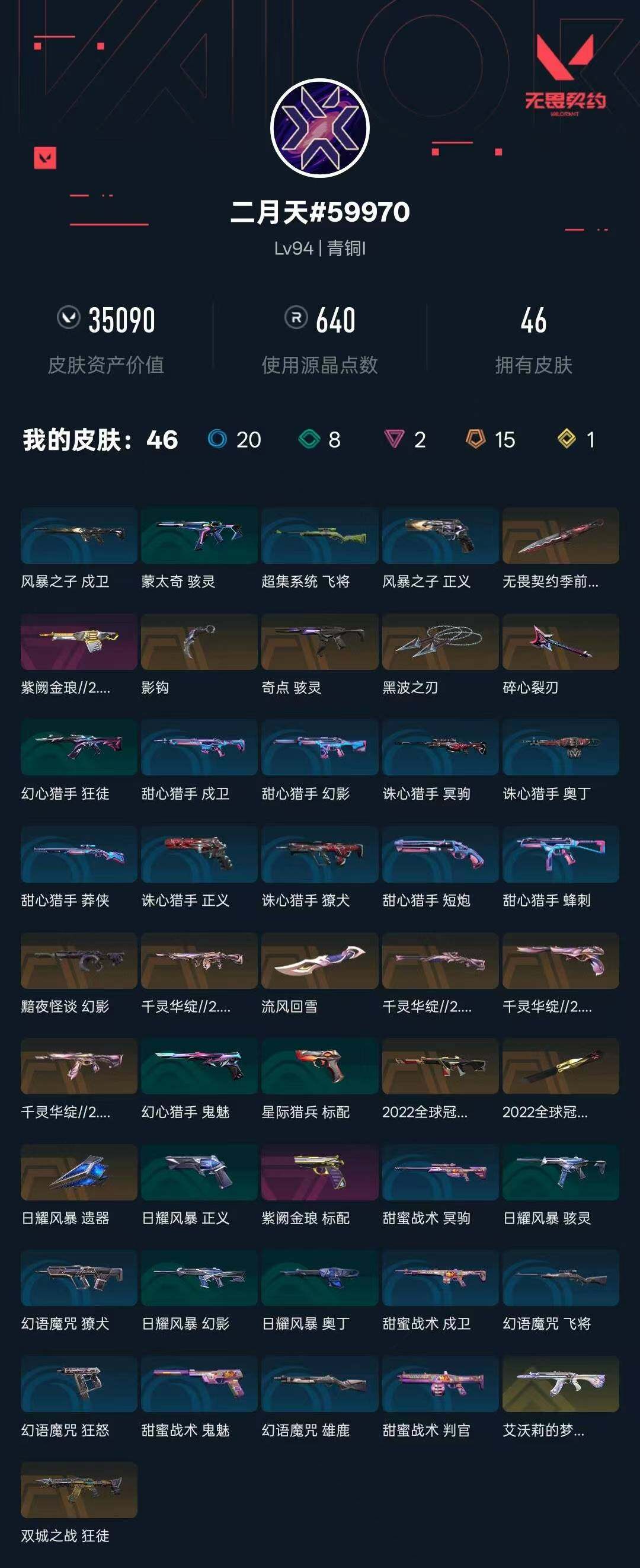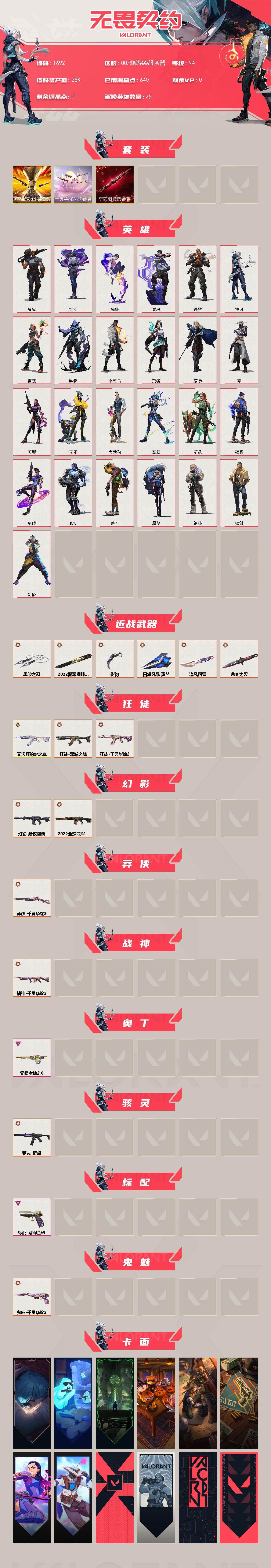 [16021415]【套装】:2022全球冠军赛套装,无畏契约季前邀请赛套装,千灵华绽//2.0套装 【英雄】:幻棱,炼狱,维斯,暮蝶,钛狐,壹决,铁臂,捷风,雷兹,幽影,不死鸟,贤者,猎枭,零,芮娜,奇乐,尚勃勒,霓虹,斯凯,夜露,星礈,k/o,盖可,黑梦,钢锁 【近战武器】:近战武器-2022全球冠军赛 蝴蝶刀,近战武器-无畏契约季前邀请赛 悲悯之刃,近战武器-流风回雪,近战武器-影钩,近战武器-黑波之刃,近战武器-日耀风暴 遗器 【狂徒】:狂徒-艾沃莉的梦之翼,狂徒-双城之战,狂徒-千灵华绽//2.0 【幻影】:幻影-2022全球冠军赛,幻影-黯夜怪谈 【莽侠】:莽侠-千灵华绽//2.0 【战神】:战神-千灵华绽//2.0 【奥丁】:奥丁-紫阙金琅//2.0 【骇灵】:骇灵-奇点 【标配】:标配-紫阙金琅 【鬼魅】:鬼魅-千灵华绽//2.0 【卡面】:《双城之战》拥抱 卡面,精灵大战 卡面,欢迎来到底城 卡面,南瓜盛典 卡面,修车达人 卡面,正义的化身 卡面,无畏契约go!第一卷:芮娜 卡面,无畏契约go!第一卷:零 卡面,代号红色 卡面,新兵报到 卡面,v契约 卡面,无畏契约 卡面 【喷漆】:嘭! 喷漆,都算到了 喷漆,控场勿近 喷漆,熊抱 喷漆,买装还是存钱 喷漆,胜利属于无畏契约 喷漆,glhf 喷漆,无畏契约 喷漆 【挂饰】:伞绳 挂饰,《双城之战》小蛋糕 挂饰,第九季//第三幕 纪念币 挂饰,无畏契约go!第一卷 芮娜 挂饰,无畏契约go!第一卷 零 挂饰,熔岩灯 挂饰,第九季//第二幕 纪念币 挂饰,天外飞客 挂饰,无畏契约 纪念币 挂饰