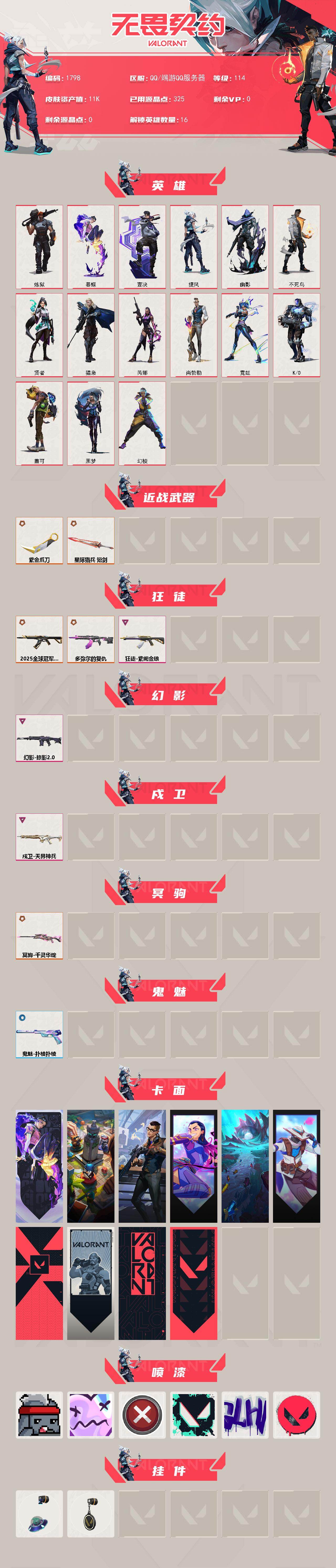 [16021457]【英雄】:幻棱,炼狱,暮蝶,壹决,捷风,幽影,不死鸟,贤者,猎枭,芮娜,尚勃勒,霓虹,k/o,盖可,黑梦 【近战武器】:近战武器-紫金爪刀,近战武器-星际猎兵 短剑 【狂徒】:狂徒-2025全球冠军赛,狂徒-多弥尔的复仇,狂徒-紫阙金琅 【幻影】:幻影-掠影//2.0 【戍卫】:戍卫-天界神兵 【冥驹】:冥驹-千灵华绽 【鬼魅】:鬼魅-扑棱扑棱 【卡面】:无畏契约:暮蝶 卡面,战术桌游 卡面,西装暴徒 卡面,无畏契约go!第一卷:芮娜 卡面,珍珠棘贝 卡面,无畏契约go!第一卷:零 卡面,代号红色 卡面,新兵报到 卡面,v契约 卡面,无畏契约 卡面 【喷漆】:战“素”兔 喷漆,伤心心 喷漆,买装还是存钱 喷漆,胜利属于无畏契约 喷漆,glhf 喷漆,无畏契约 喷漆 【挂饰】:天外飞客 挂饰,无畏契约 纪念币 挂饰